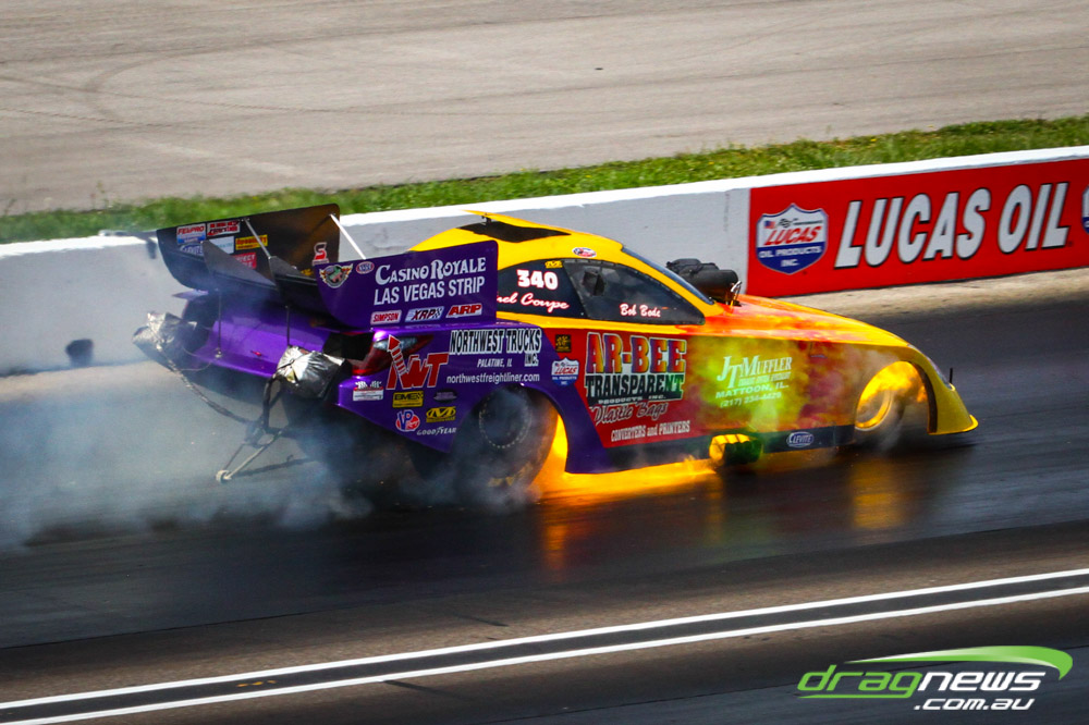 Bob Bode lit things up in Funny Car qualifying but thankfully the fire was out quickly and the independent driver made it into the race day show.