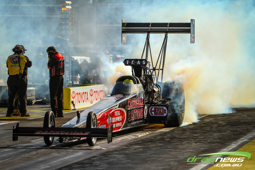 Headlining the Australian contingent was Richie Crampton who took the Geico Top Fuel dragster to provisional number one qualifying spot with a 3.764 pass.