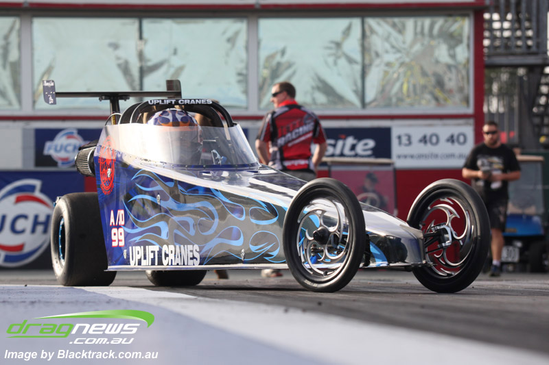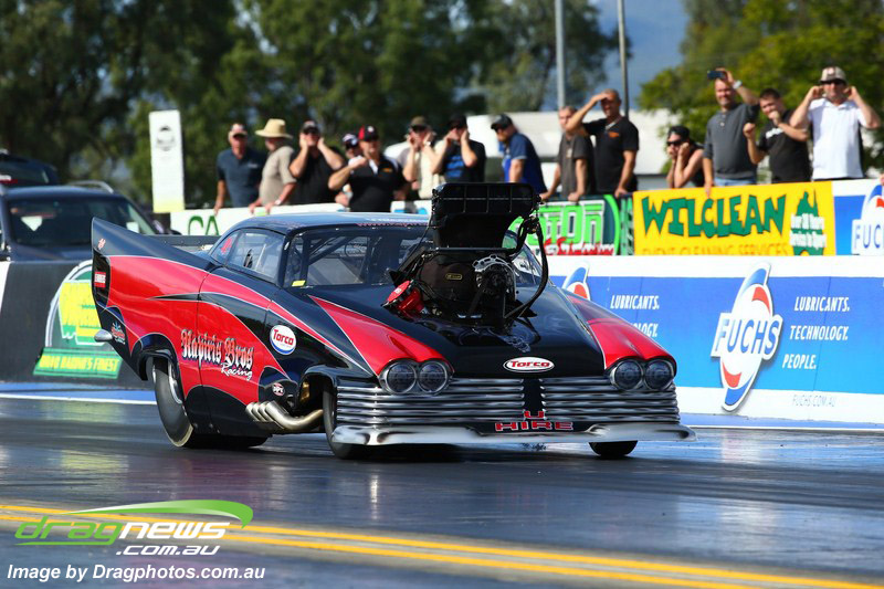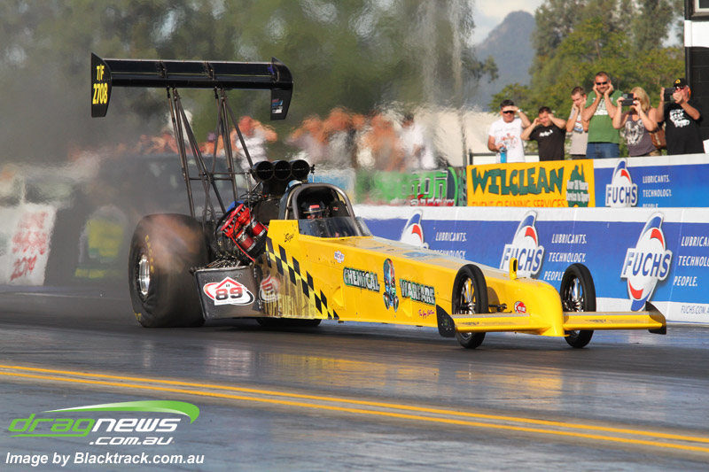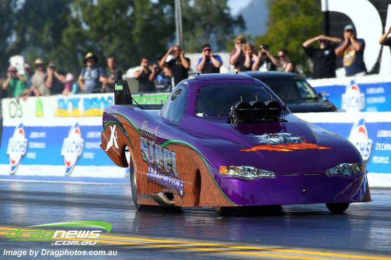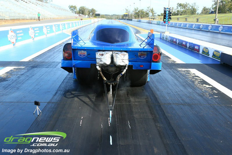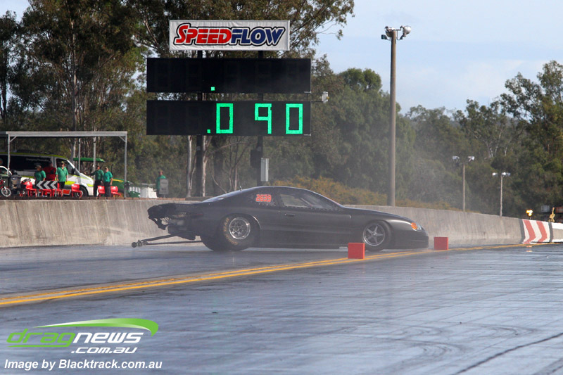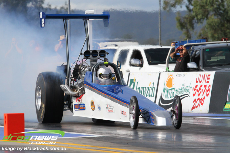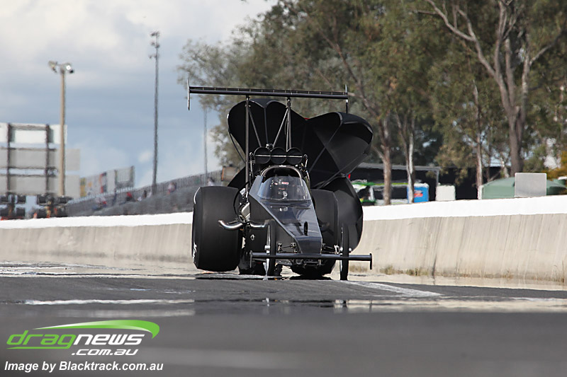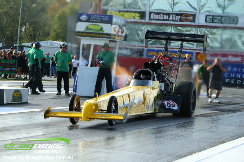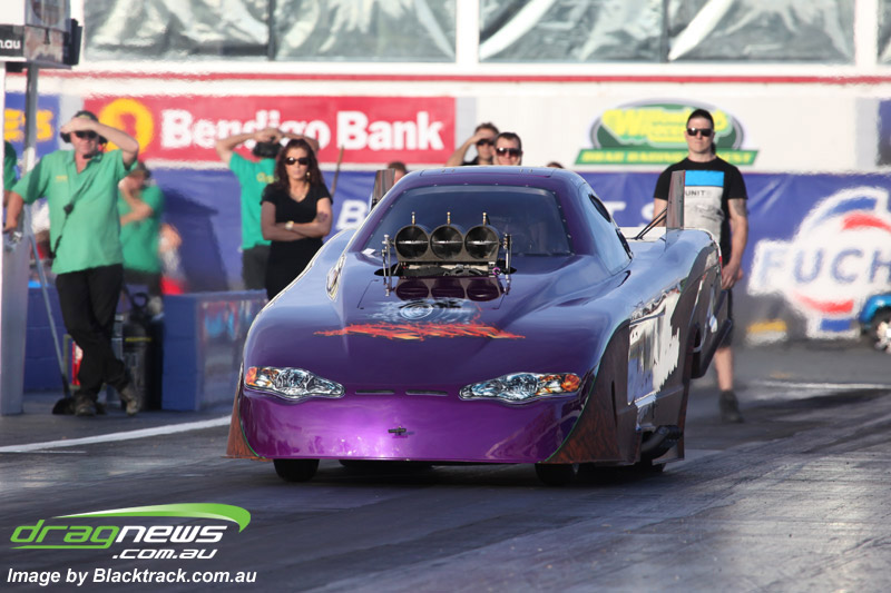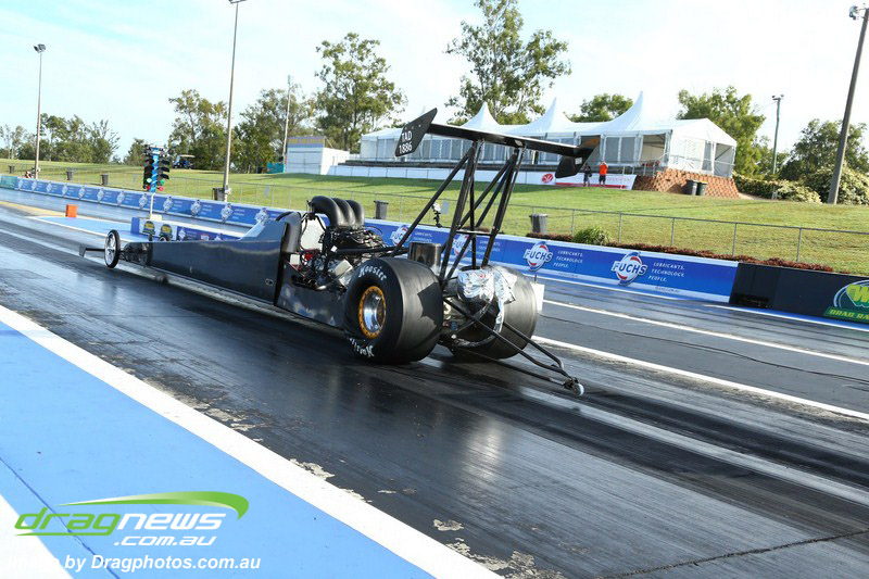 Darren Fry in his Top Alcohol Funny Car experienced the same issue he had yesterday with tyre shake on his first pass but still managed a 5.75/254.09, but a last gasp pass on the day produced a 5.59/257.68.