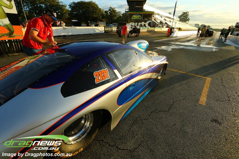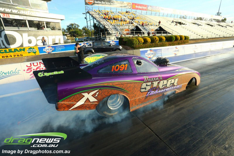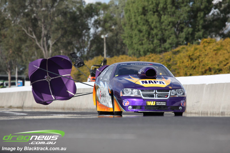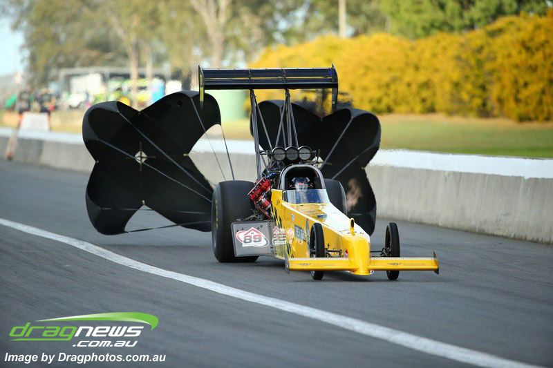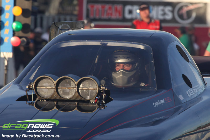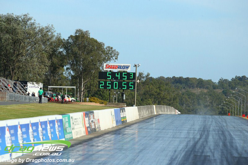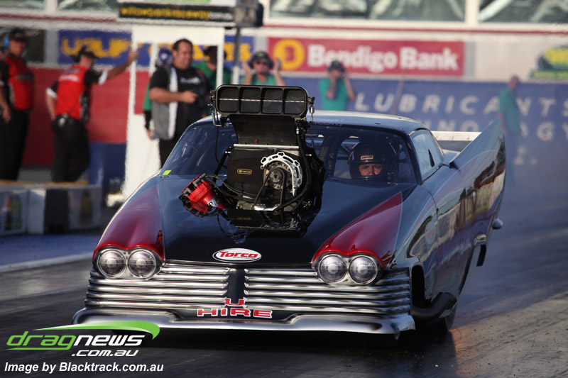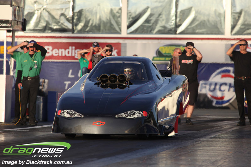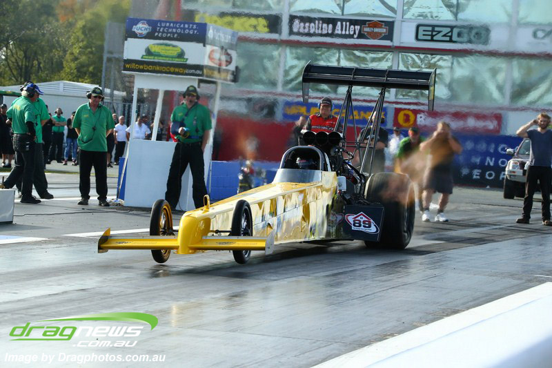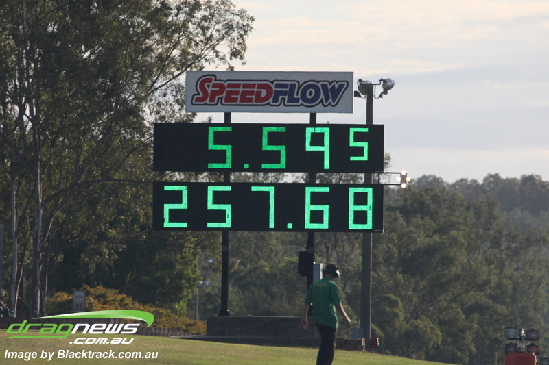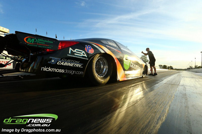 Darren Fry in his Top Alcohol Funny Car experienced the same issue he had yesterday with tyre shake on his first pass but still managed a 5.75/254.09, but a last gasp pass on the day produced a 5.59/257.68.