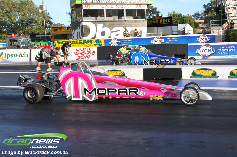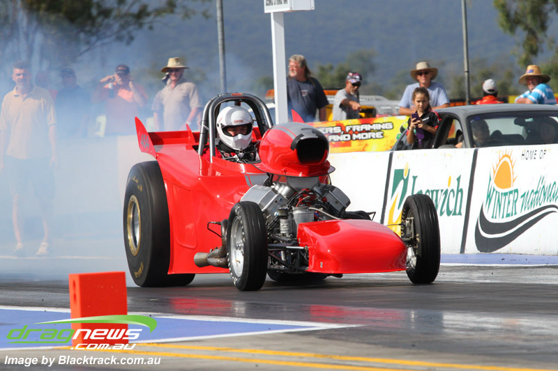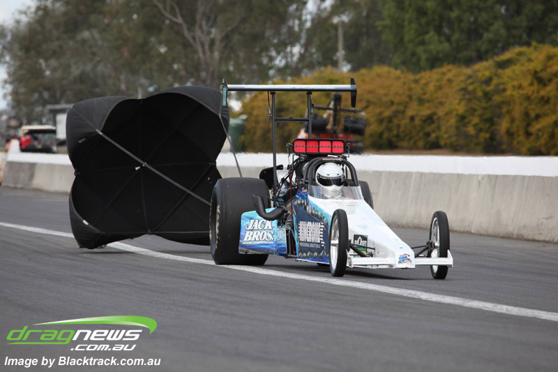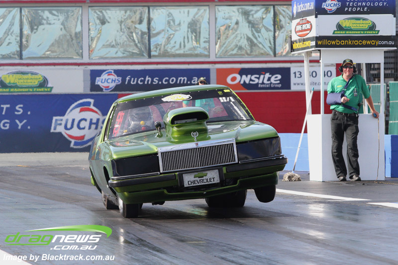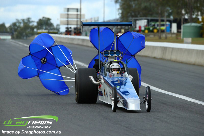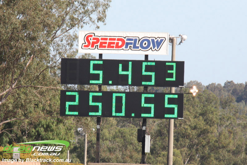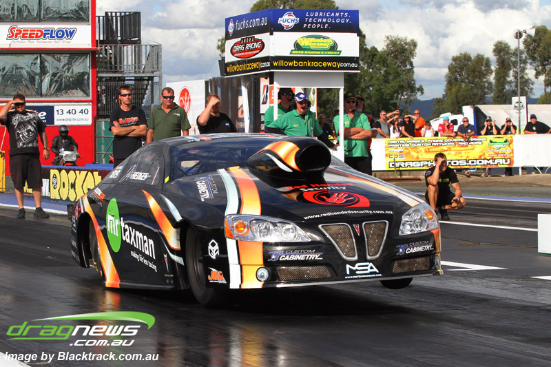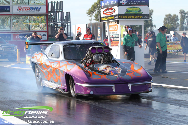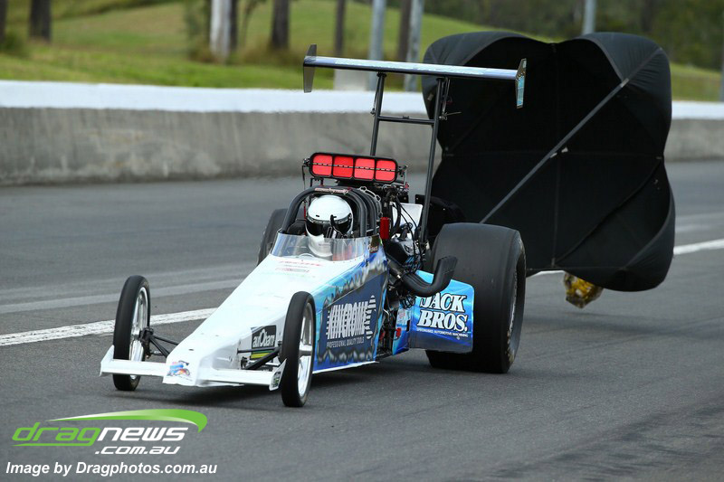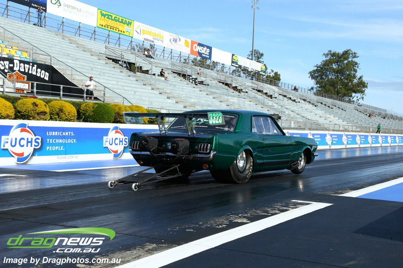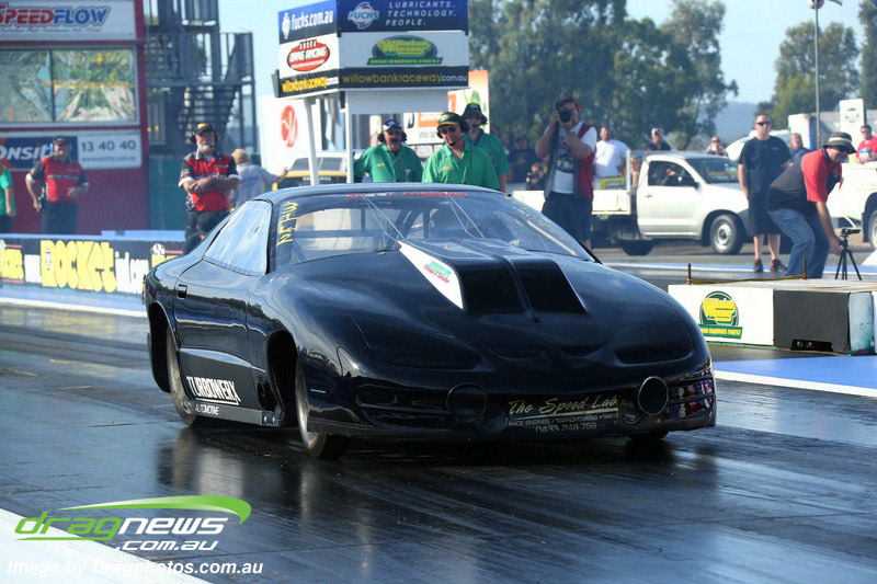 Darren Fry in his Top Alcohol Funny Car experienced the same issue he had yesterday with tyre shake on his first pass but still managed a 5.75/254.09, but a last gasp pass on the day produced a 5.59/257.68.