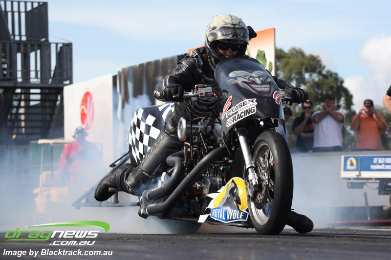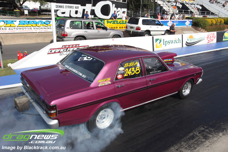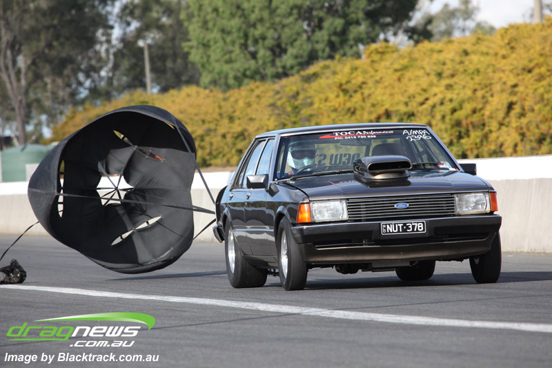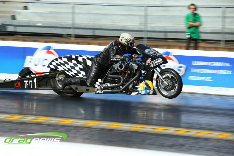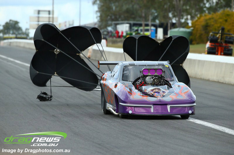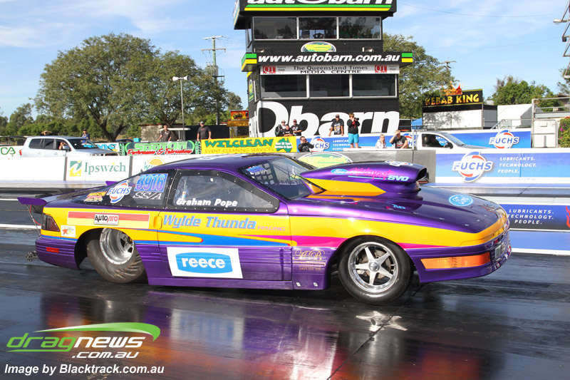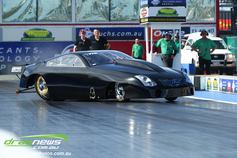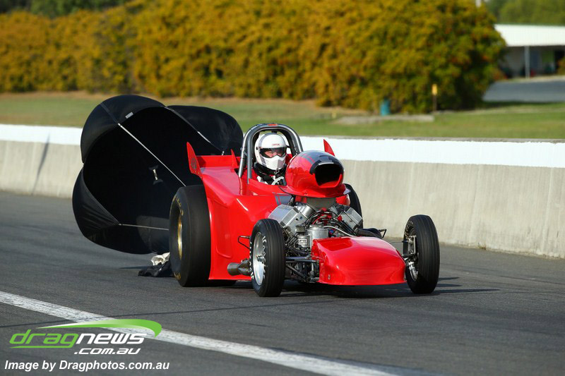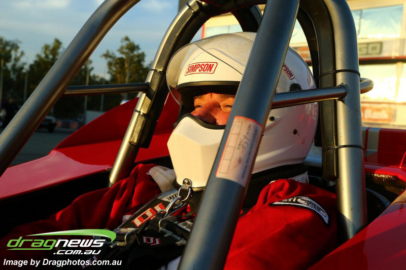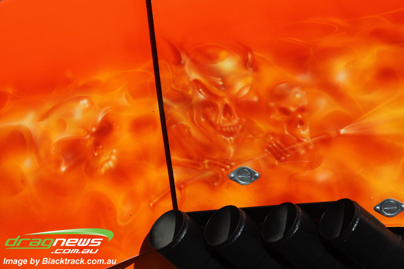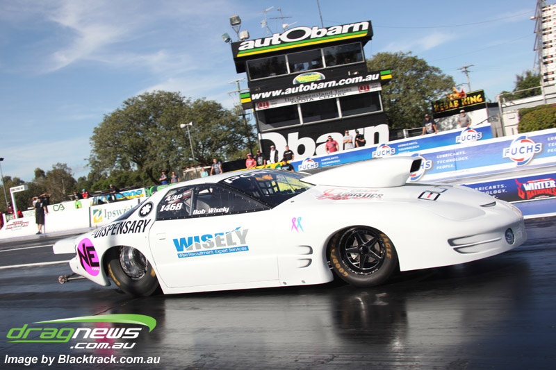Darren Fry in his Top Alcohol Funny Car experienced the same issue he had yesterday with tyre shake on his first pass but still managed a 5.75/254.09, but a last gasp pass on the day produced a 5.59/257.68.