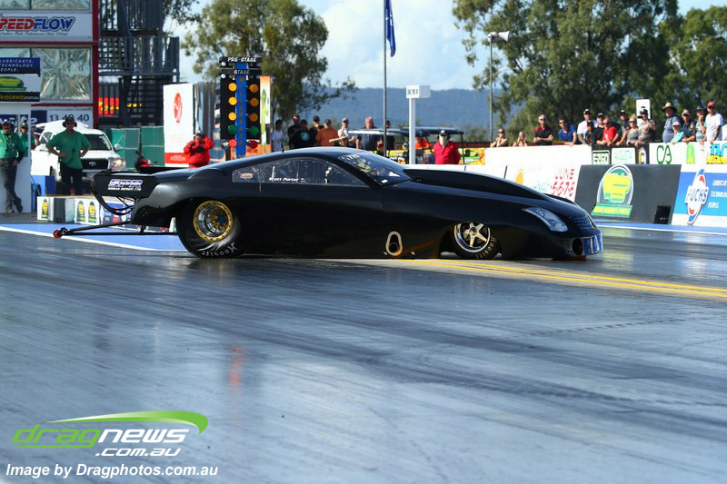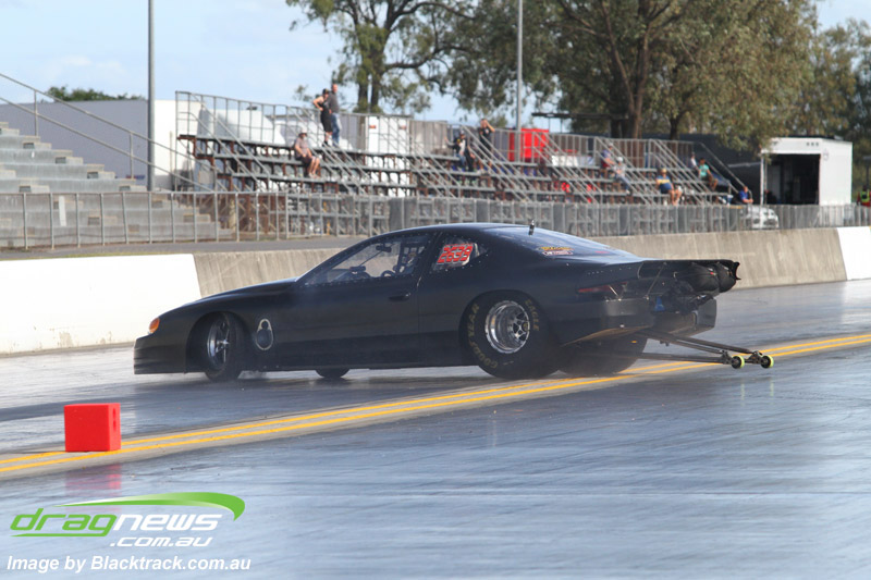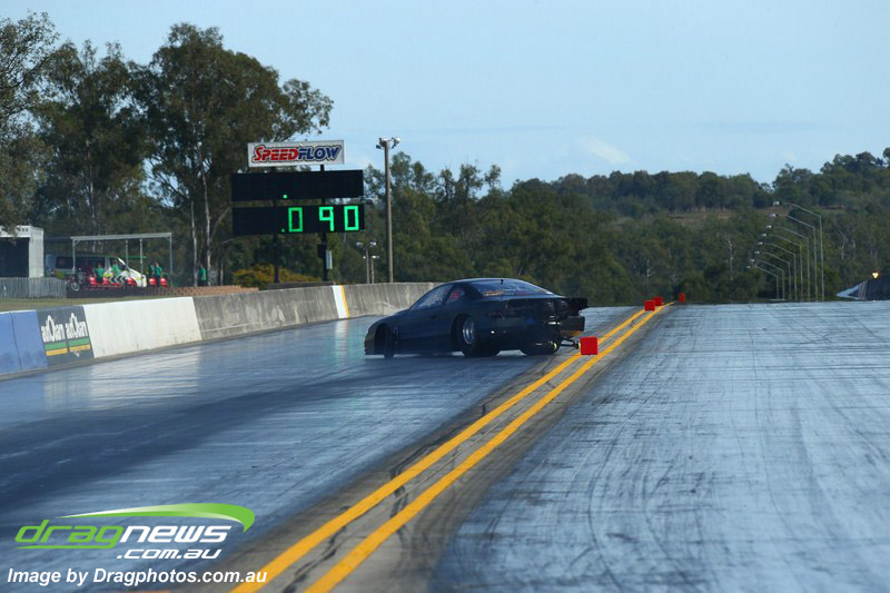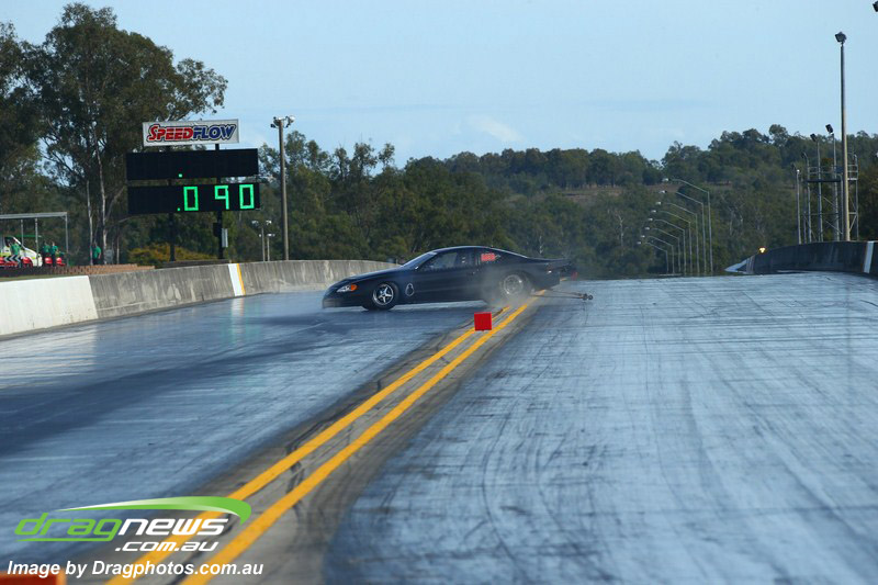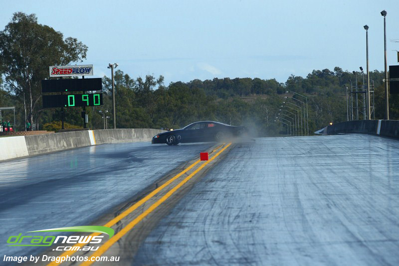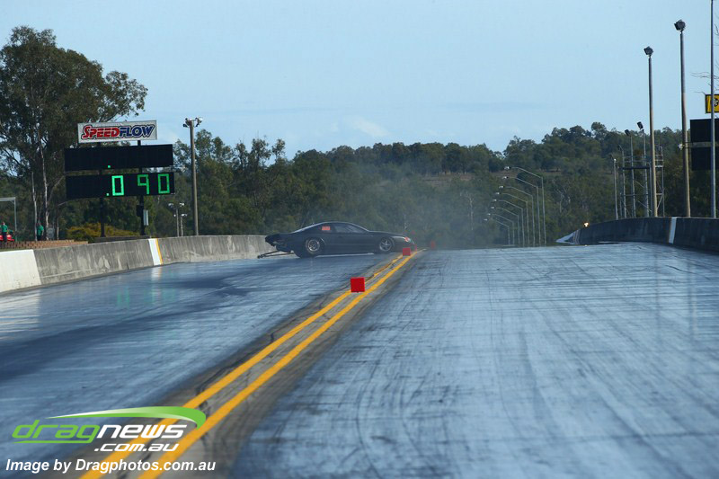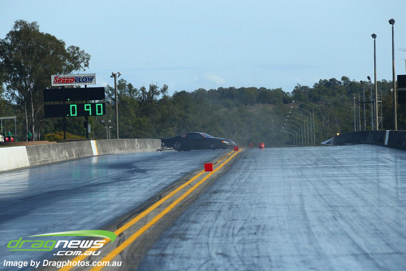 Ben Bray launched hard in his Nissan Altima but spilled fluid under his tyres at quarter track sending the car into a wild spin, pulling up sideways at around mid track.