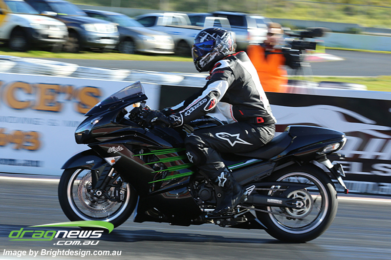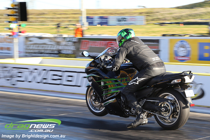 Street Outlaw Motorcycle saw two tough competitors both on Kawasaki ZX14Rs duke it out to claim top spot bragging rights. Leigh Fitzgibbon (pictured above) ran a 9.55, forcing David Carroll to improve his previous best from round one if he wanted to keep top spot. Carroll did so, improving with a 9.54 at an impressive 153mph. Maurice Allen still sits comfortably in third position, resting on his 11.06 from round one of Street Outlaws.
