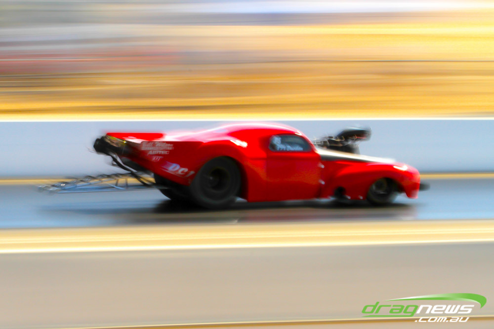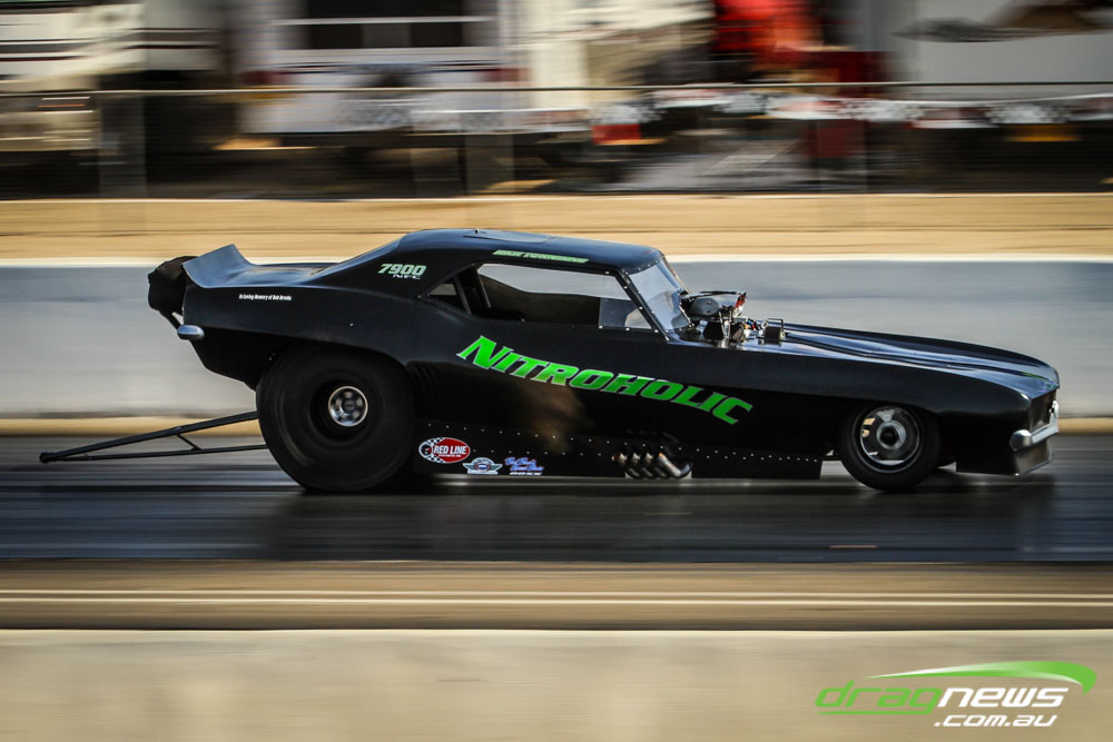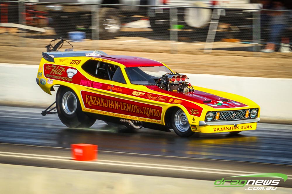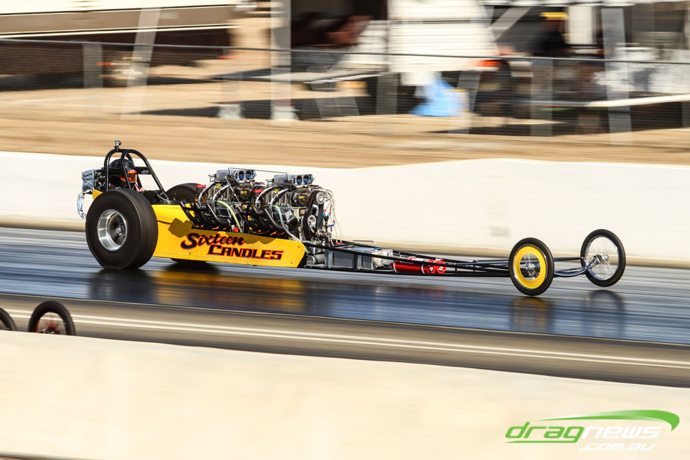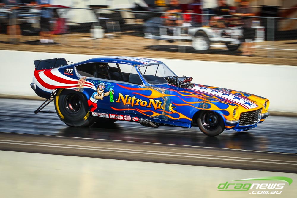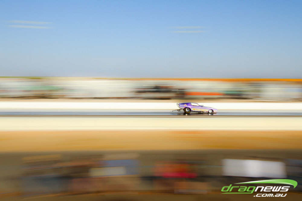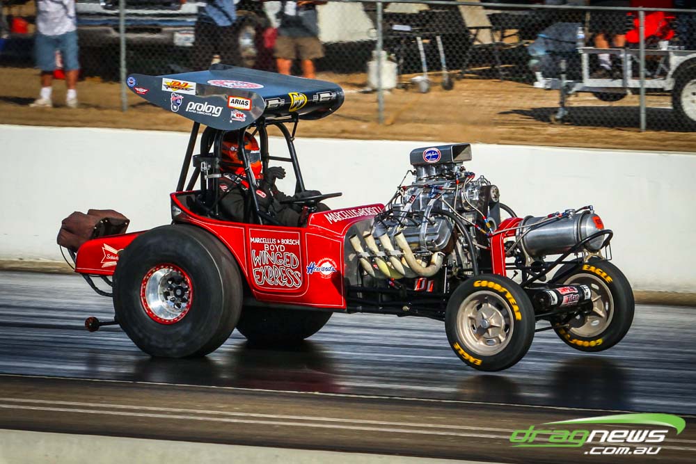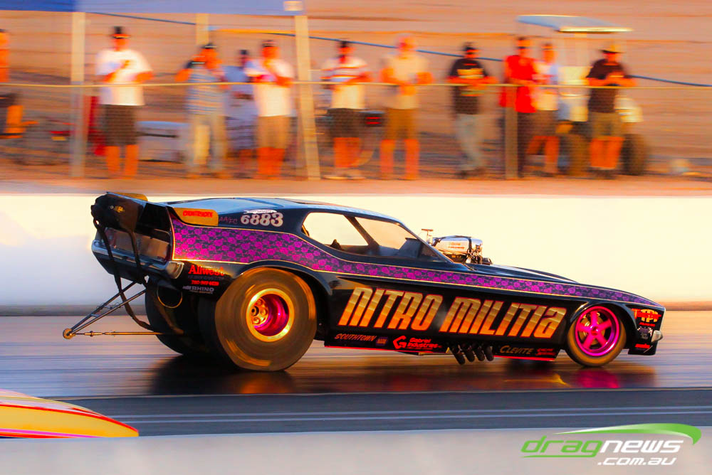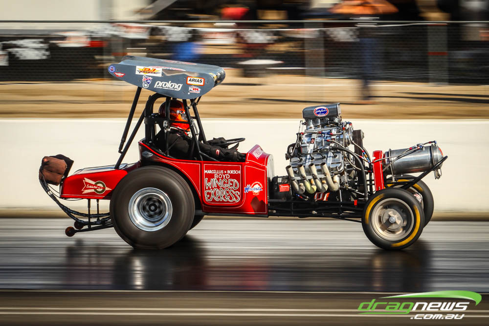 The famed Winged Express was among six fuel altereds running an exhibition. This car is the fan favourite, bouncing the front wheels the whole way down the track and at night producing spectacular header flames.