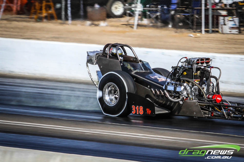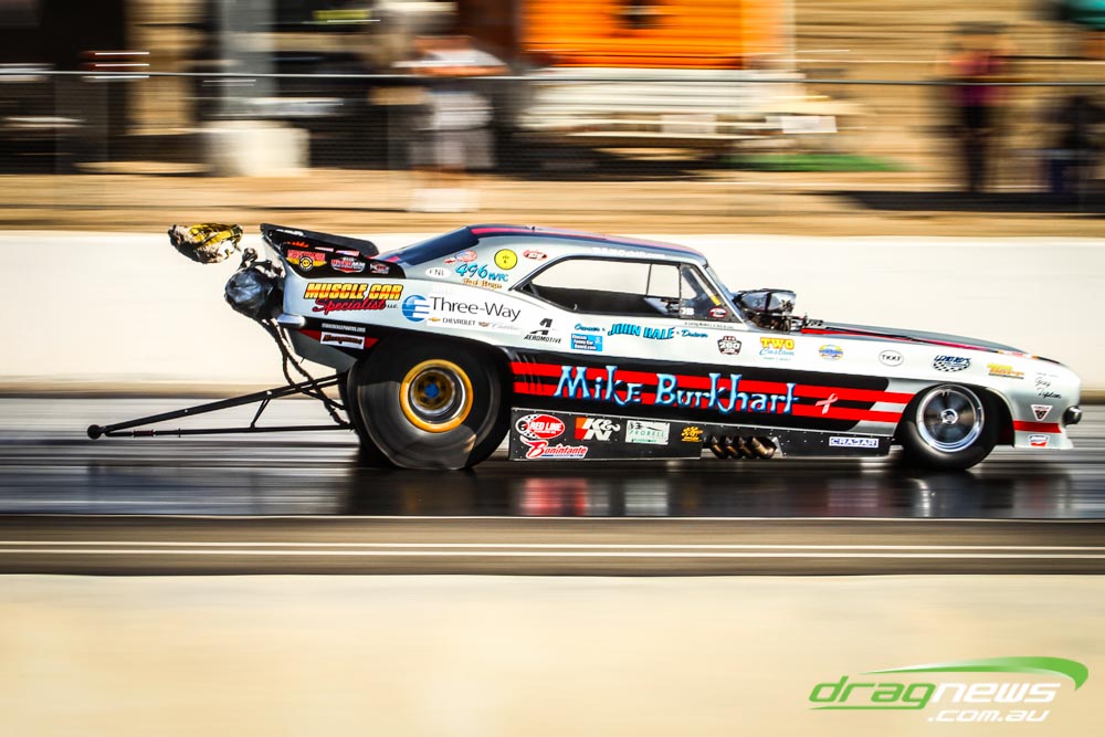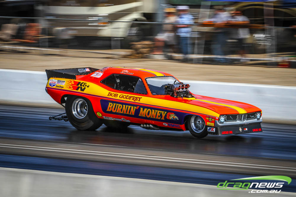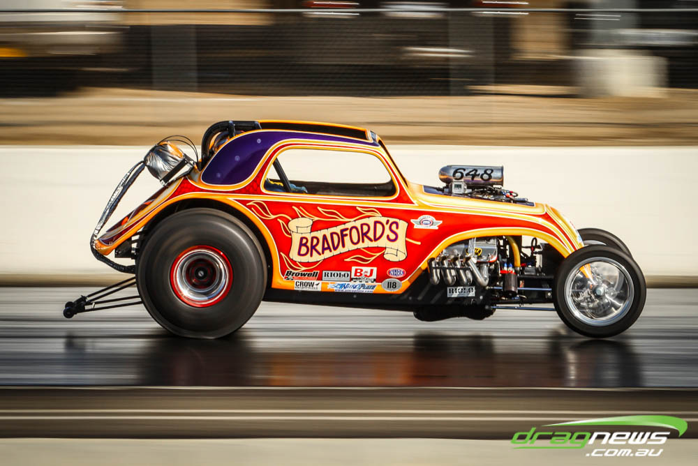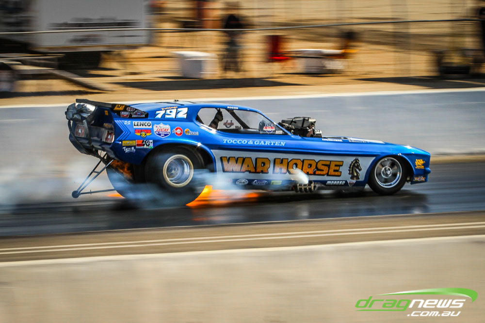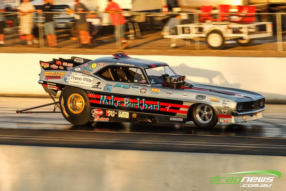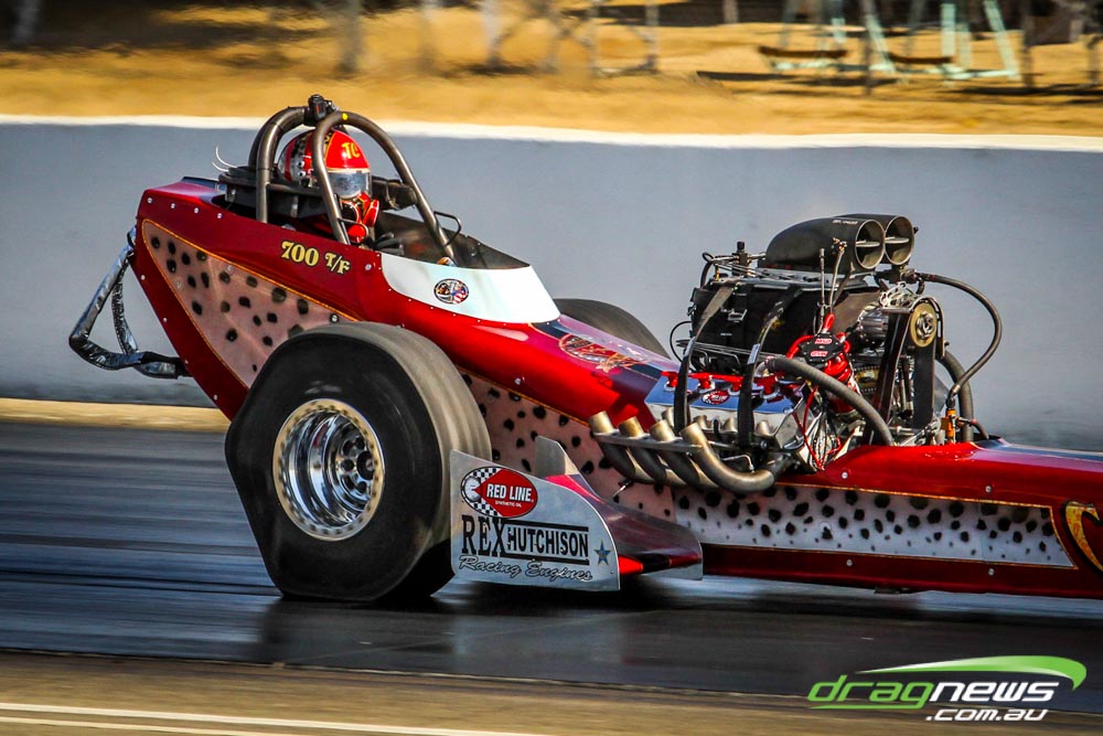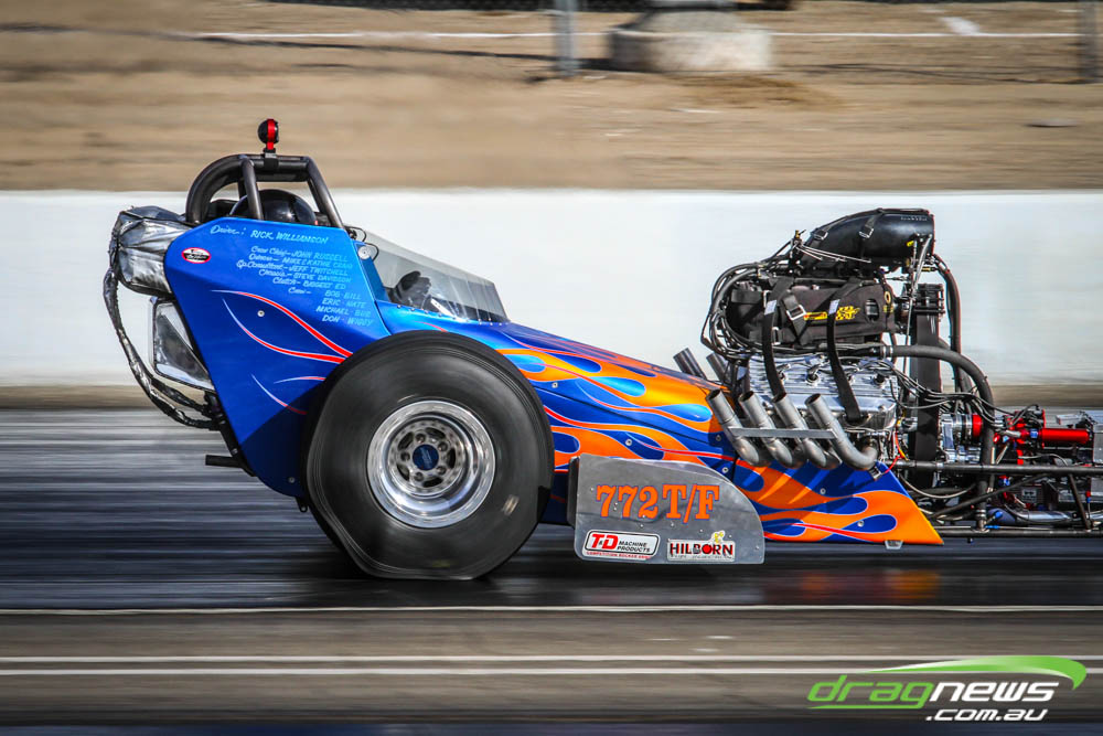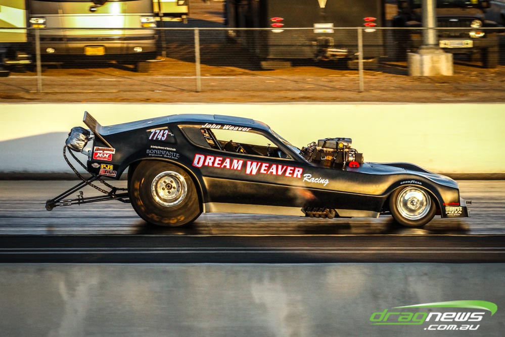 The famed Winged Express was among six fuel altereds running an exhibition. This car is the fan favourite, bouncing the front wheels the whole way down the track and at night producing spectacular header flames.