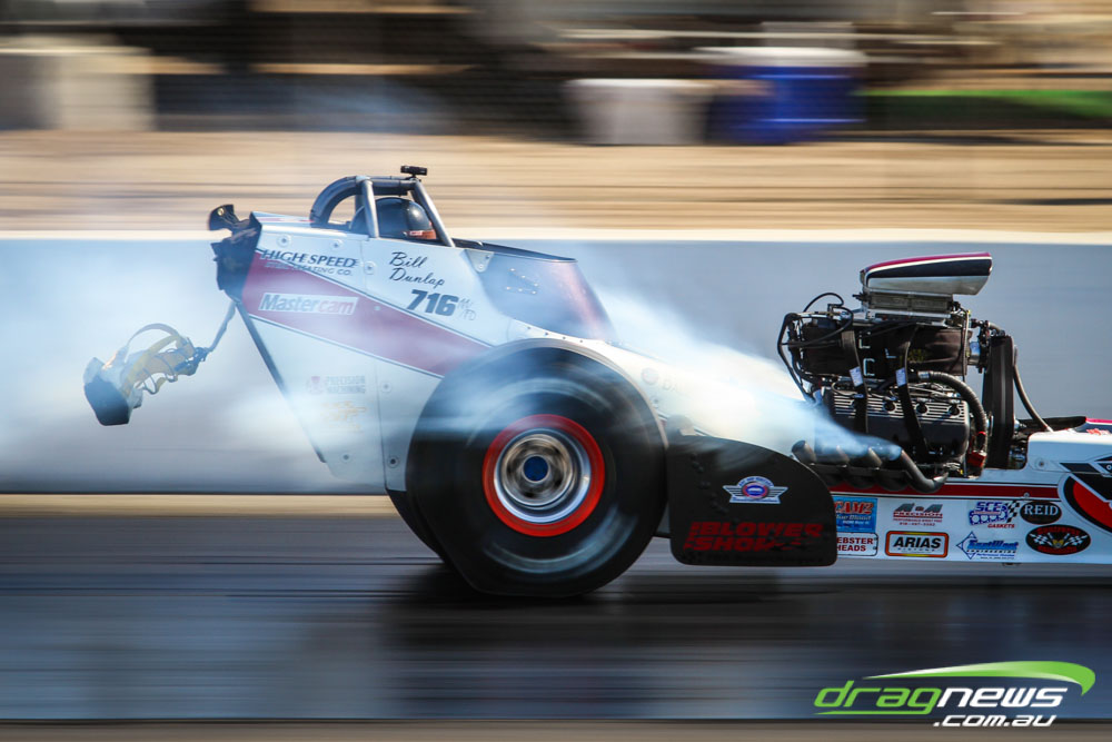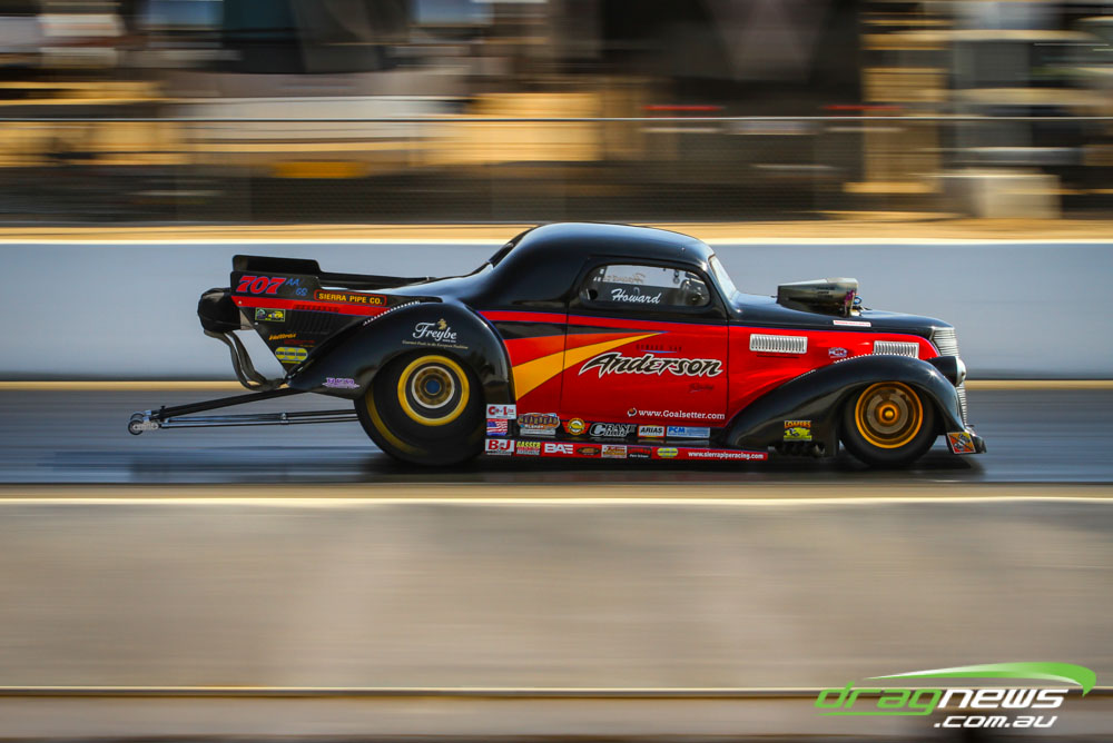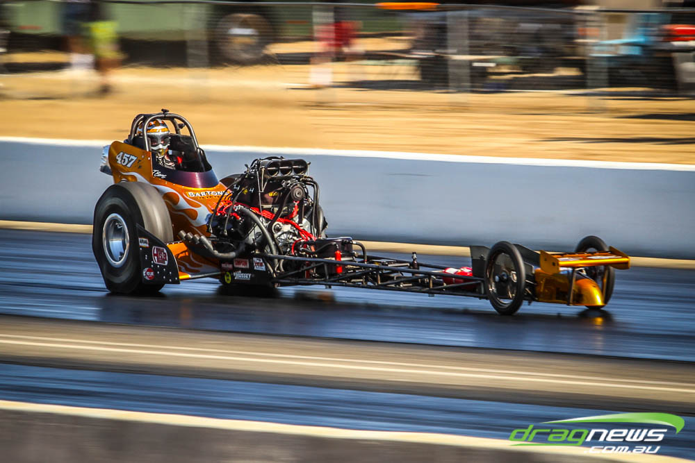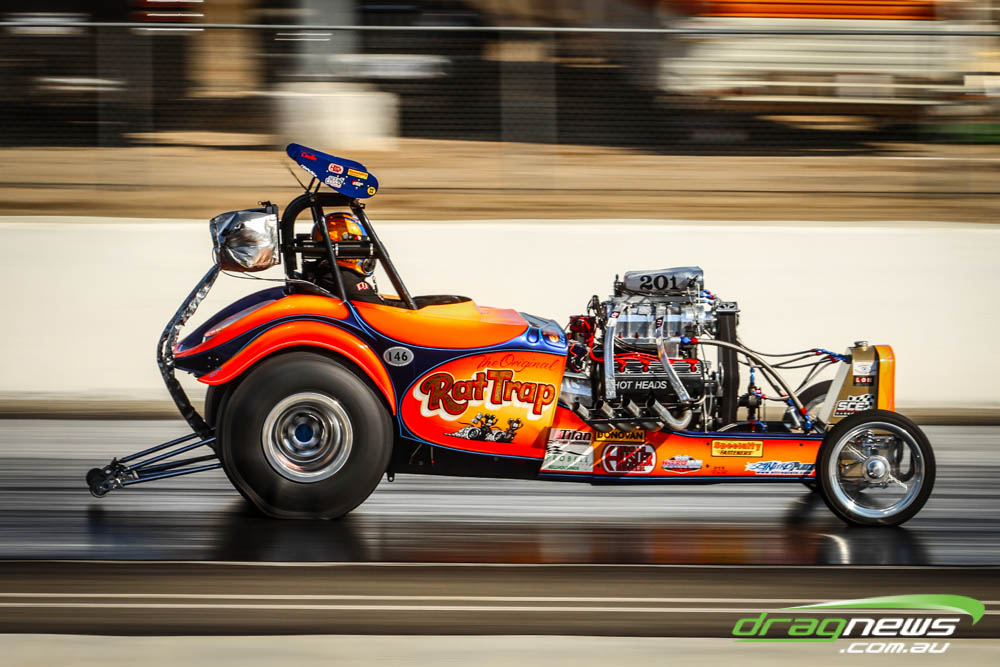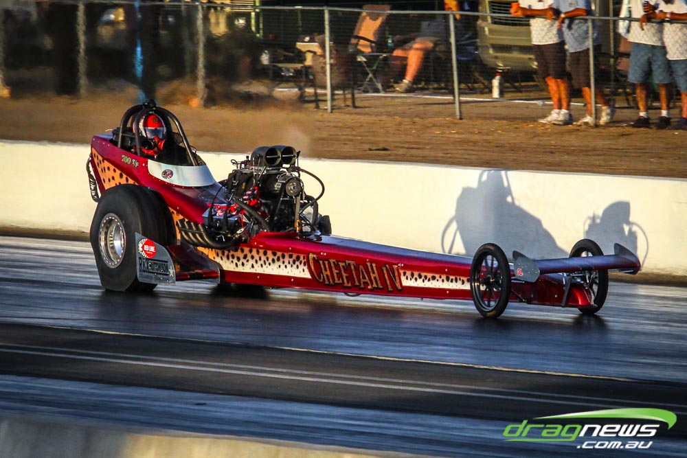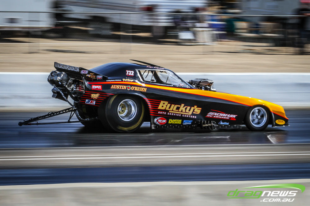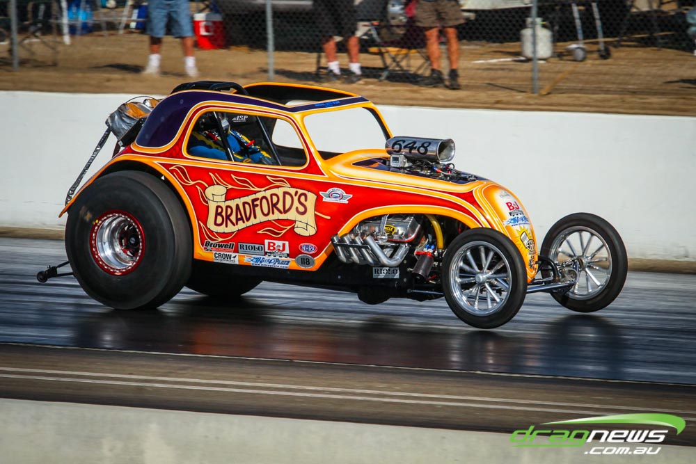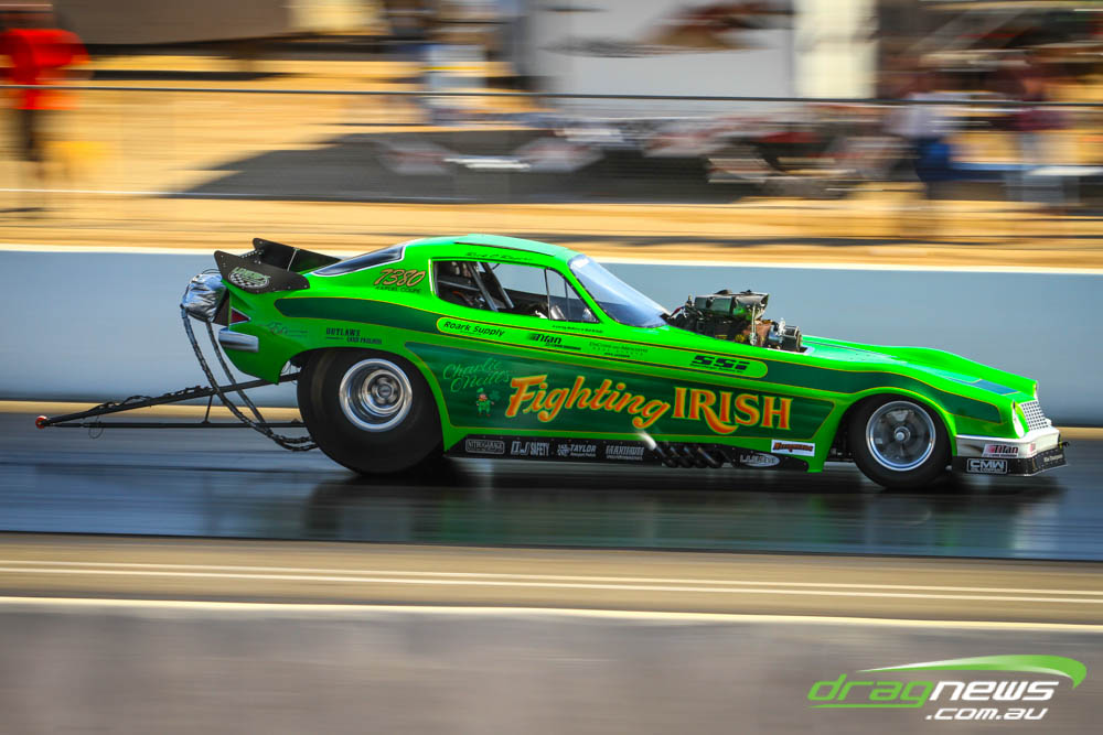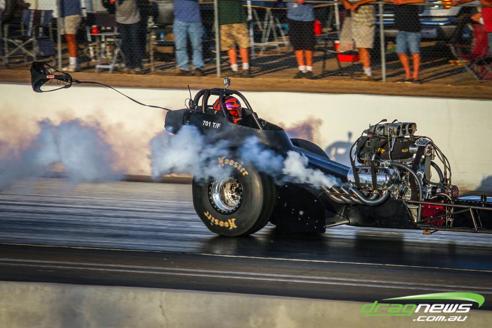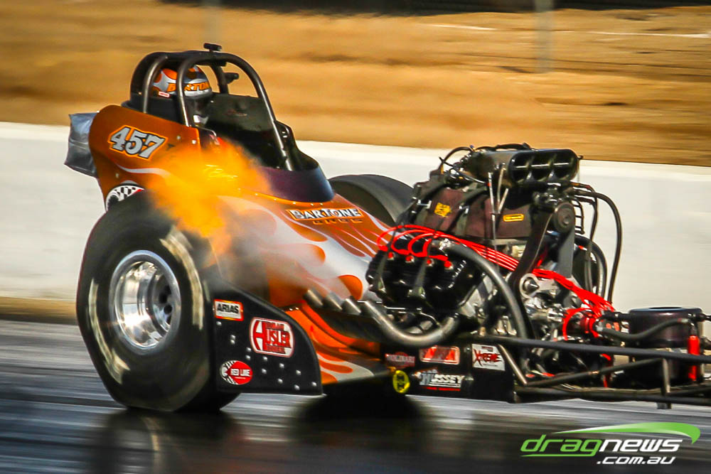 The famed Winged Express was among six fuel altereds running an exhibition. This car is the fan favourite, bouncing the front wheels the whole way down the track and at night producing spectacular header flames.