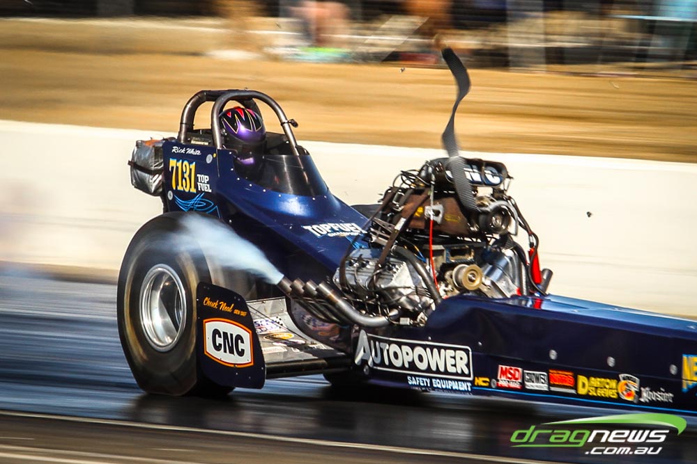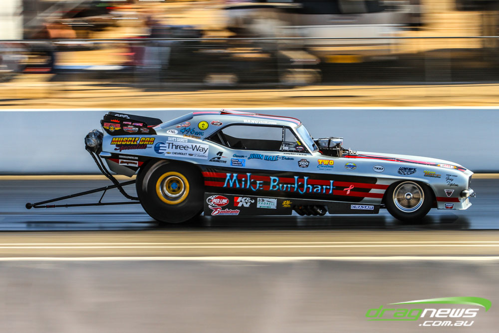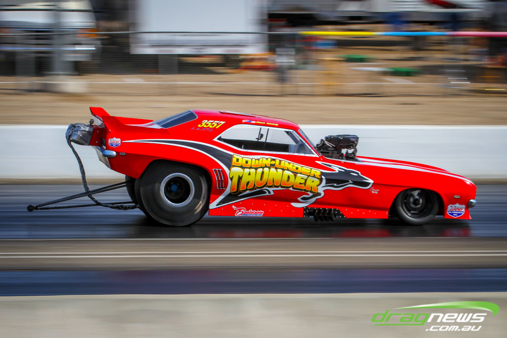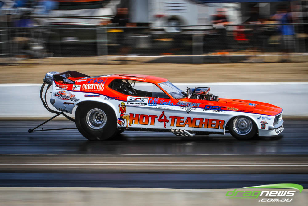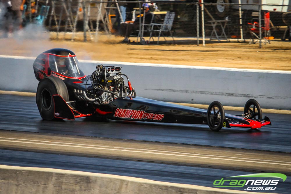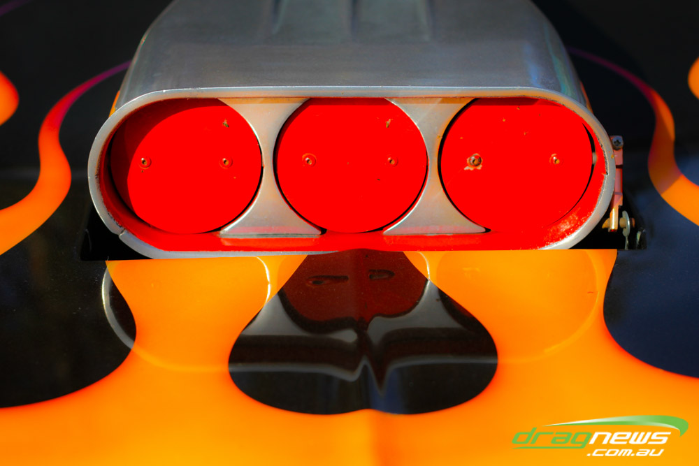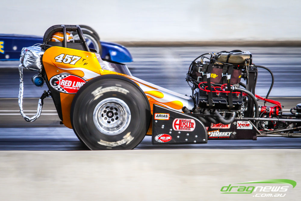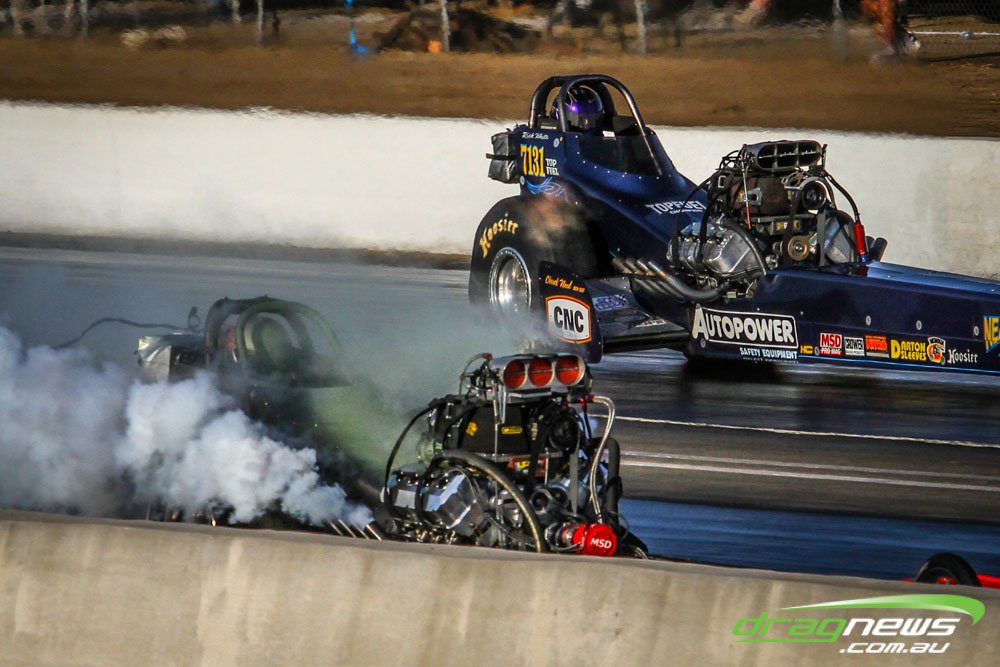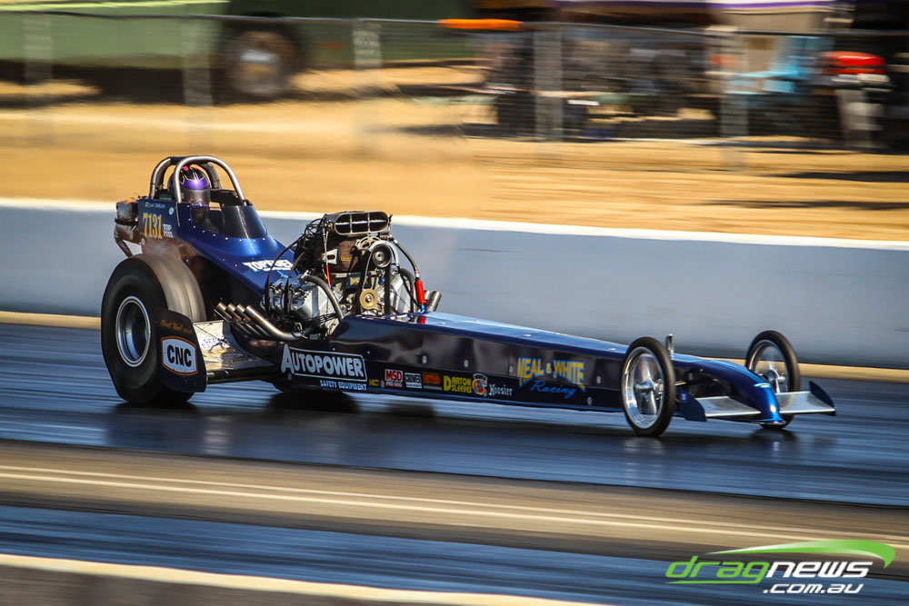 The famed Winged Express was among six fuel altereds running an exhibition. This car is the fan favourite, bouncing the front wheels the whole way down the track and at night producing spectacular header flames.