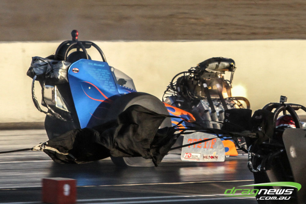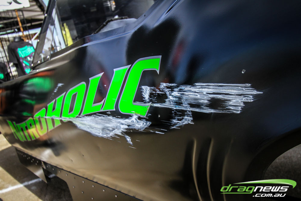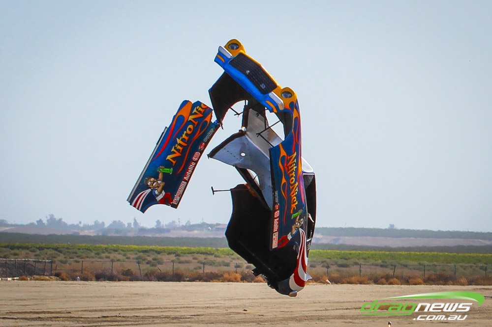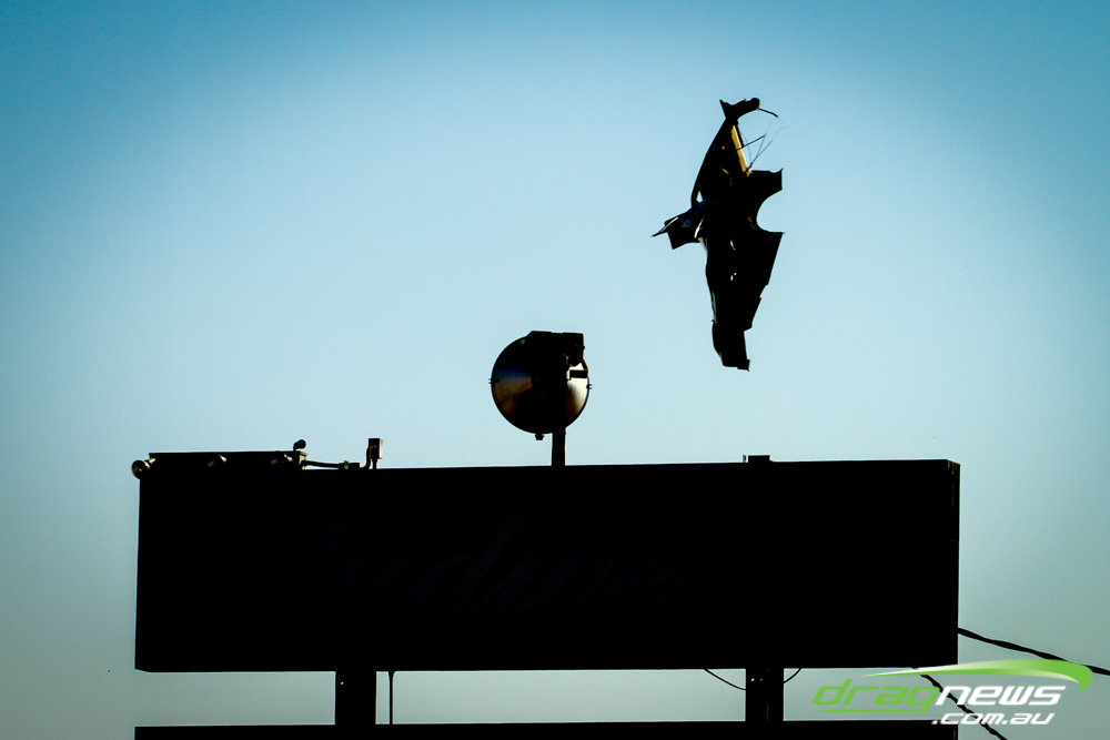 A supercharger backfire can launch the fibreglass or carbon fibre bodies off a Funny Car. Given these cars are travelling at about 400kph as soon as air gets underneath the body it can take off. This is rare to see but there were two such incidents at this event. In this photo you can see the read out boards in the foreground, that body just about went into orbit.