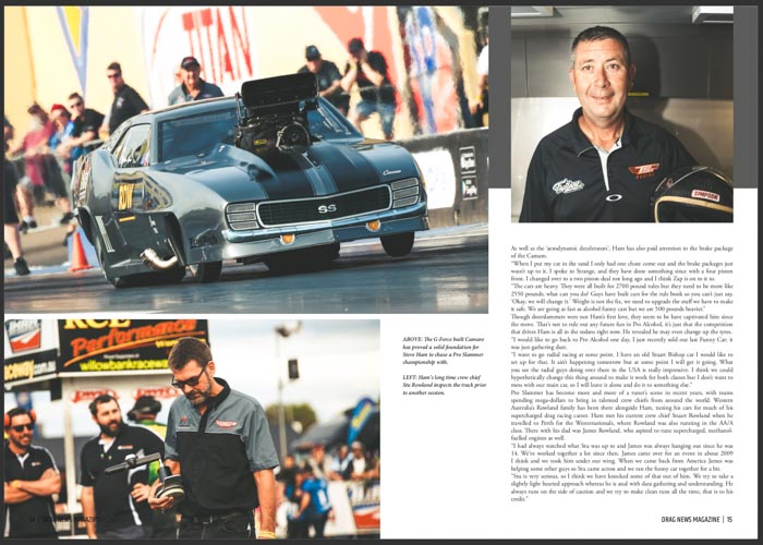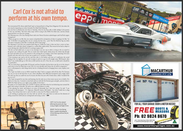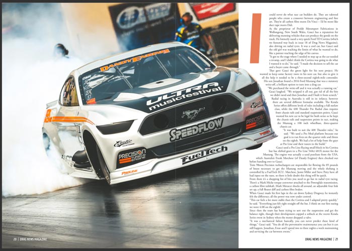 Australian chassis builder Joe Gauci’s sleek Pro Radial Ford Mustang features in Drag News Magazine #46!