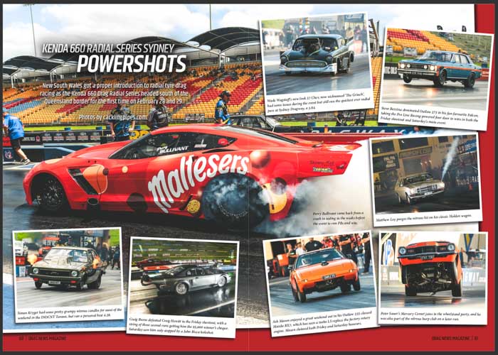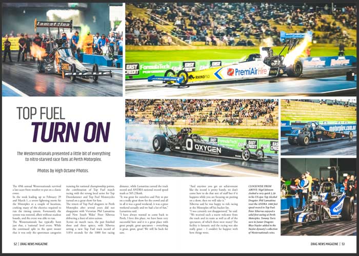 Plus we take in events from around the world including NZ’s Aeroflow Outlaw Nitro Funny Cars, the Westernationals and more.