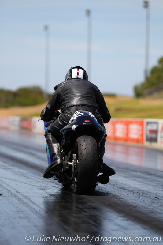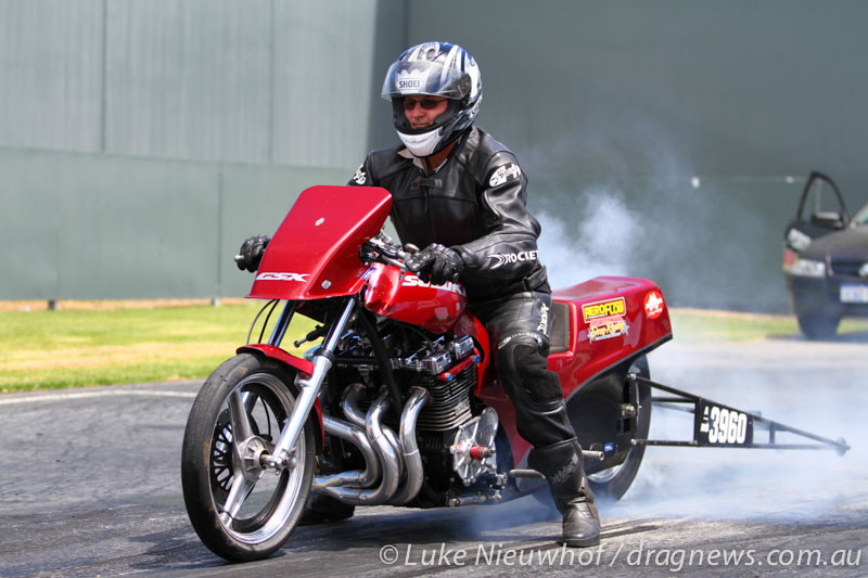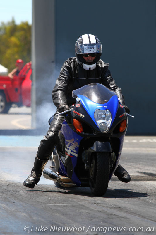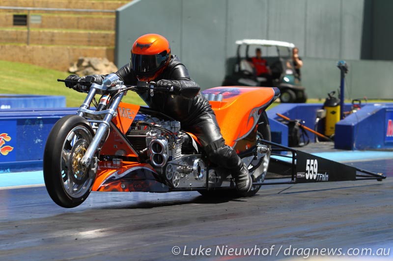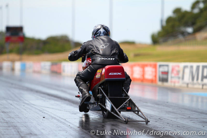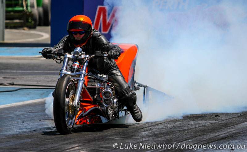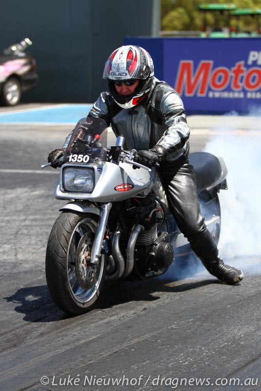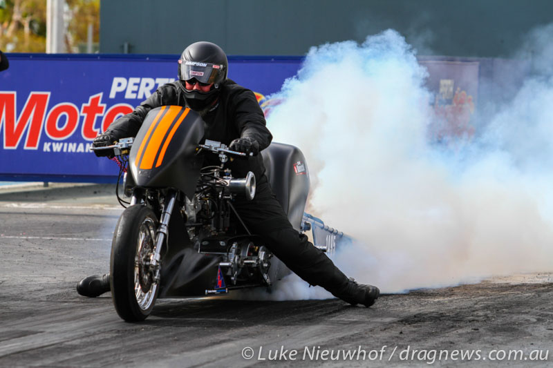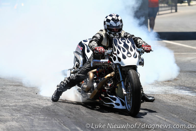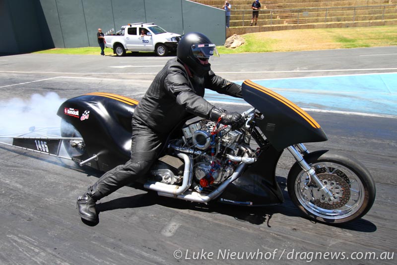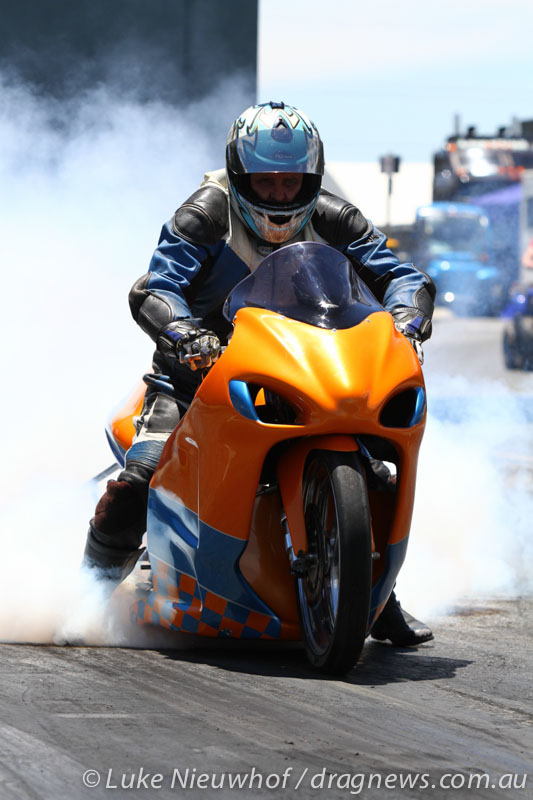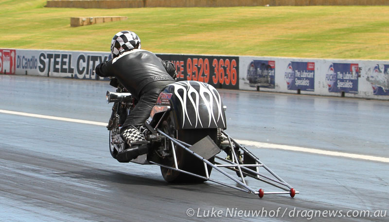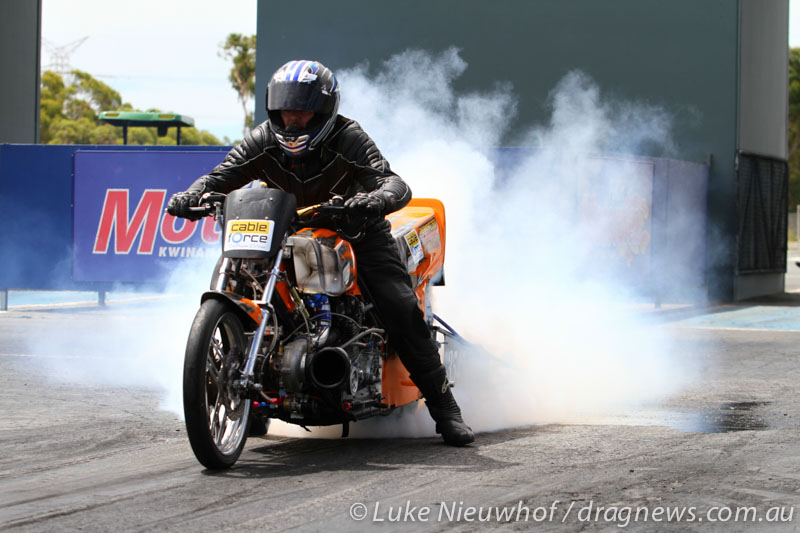Kevin Gummow is planning to kill them with consistency this weekend in Top Fuel Motorcycle. He said the blown Kawasaki is pretty much unchanged from when it last ran in Competition Bike, bar a new tyre. He ran some mid sevens during the day.