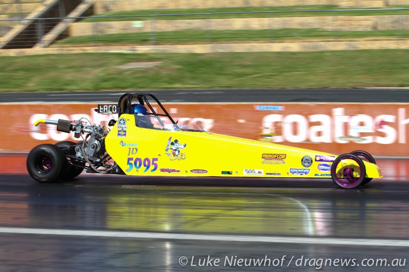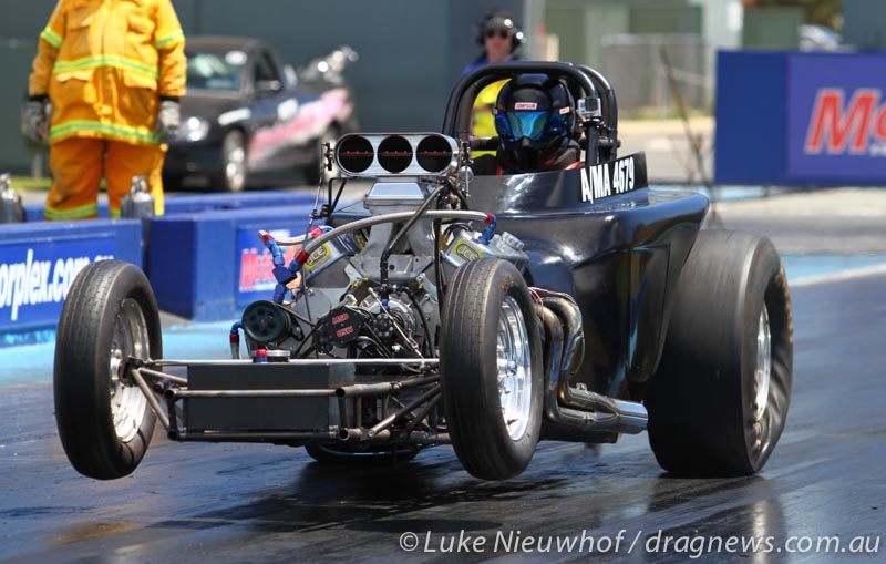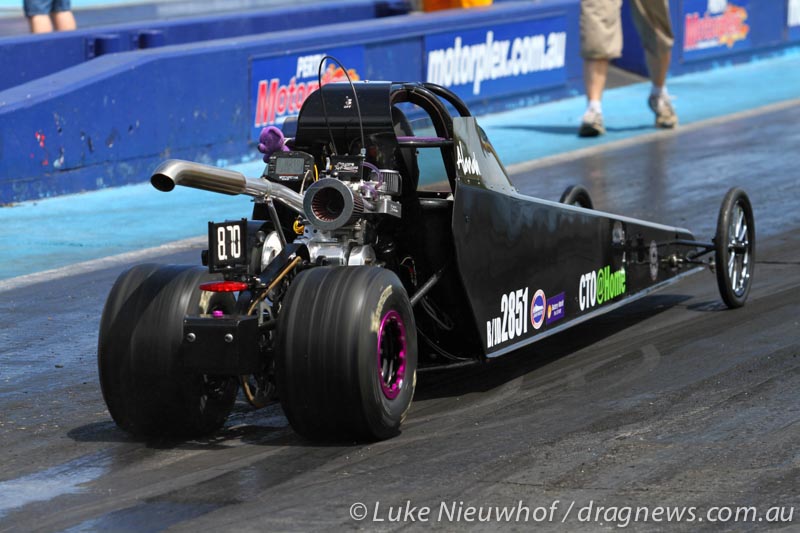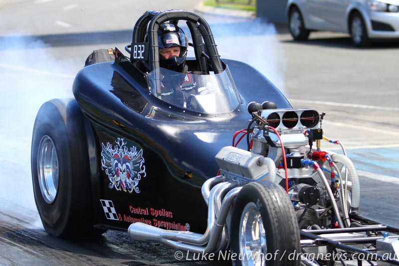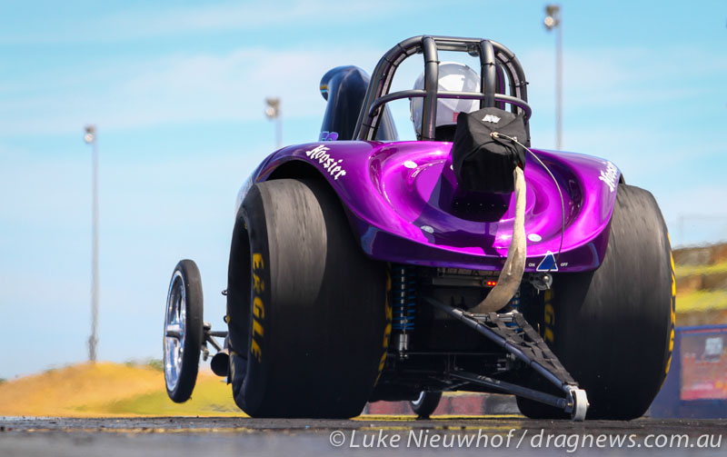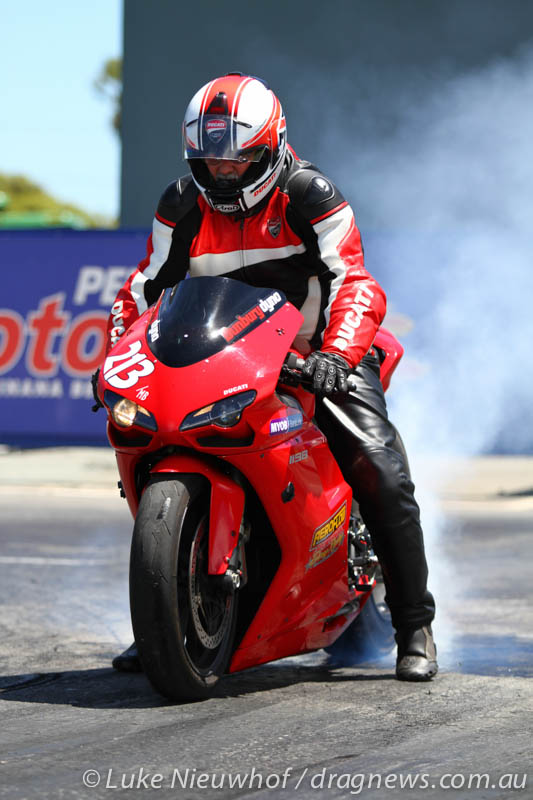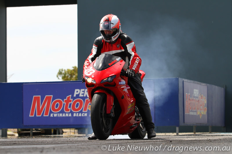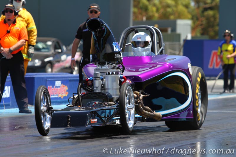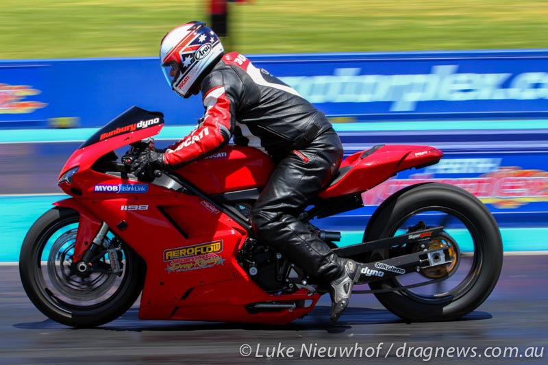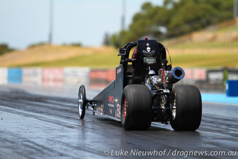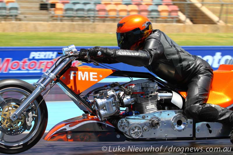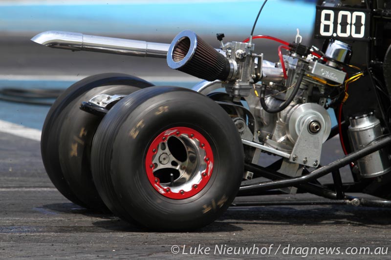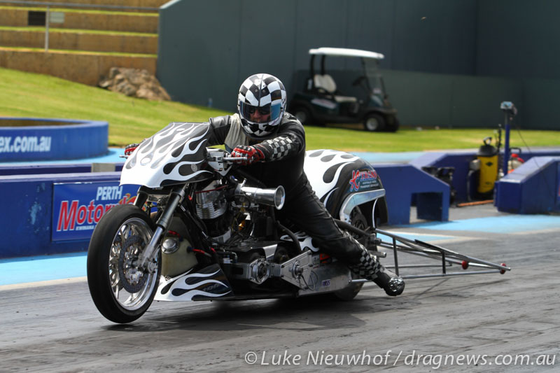 Kevin Gummow is planning to kill them with consistency this weekend in Top Fuel Motorcycle. He said the blown Kawasaki is pretty much unchanged from when it last ran in Competition Bike, bar a new tyre. He ran some mid sevens during the day.