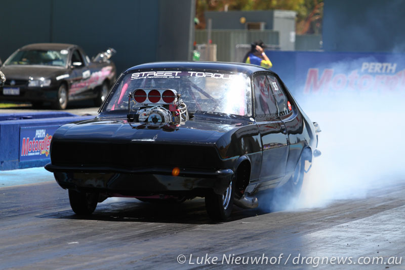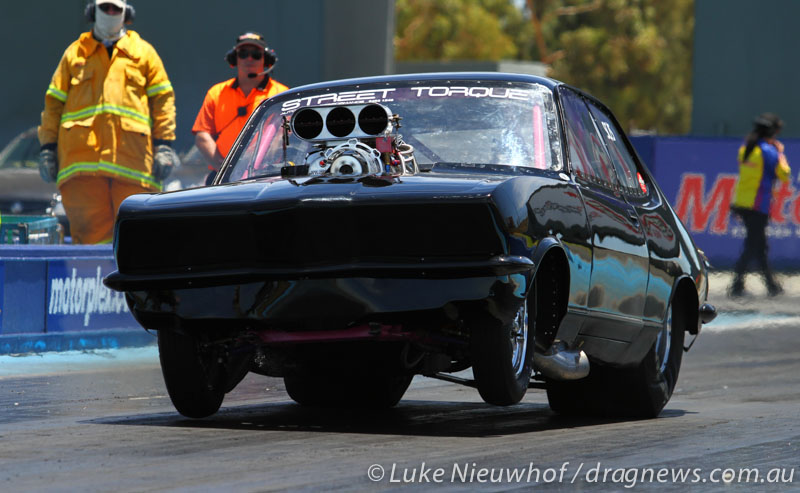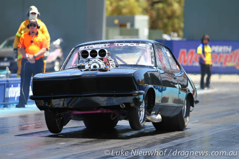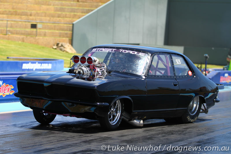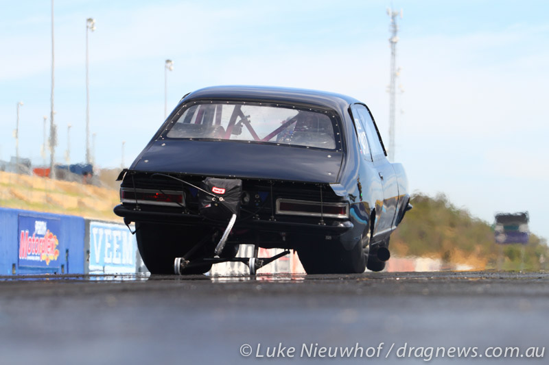 Jake Lane’s Supercharged Outlaws Torana made some wild early ventures on the track, hiking the wheels up and then wanting to turn right, but later passes were straight and in the mid sevens.