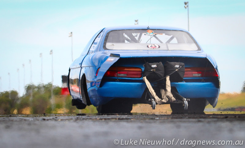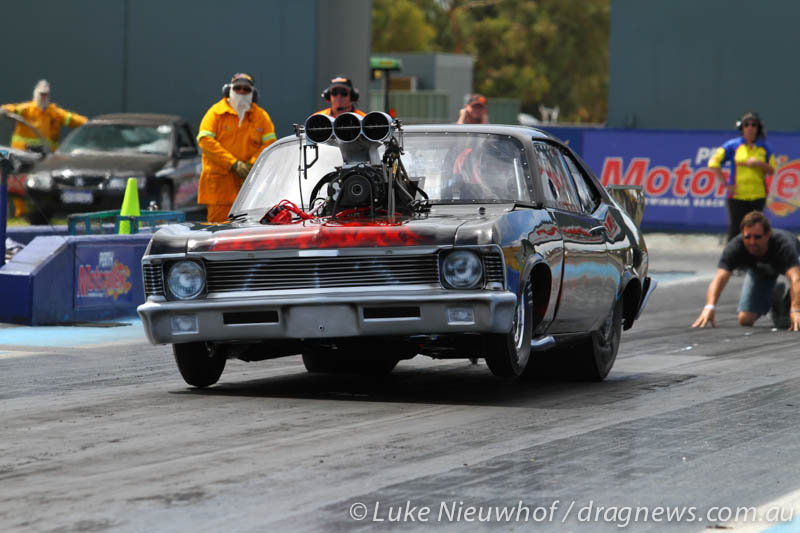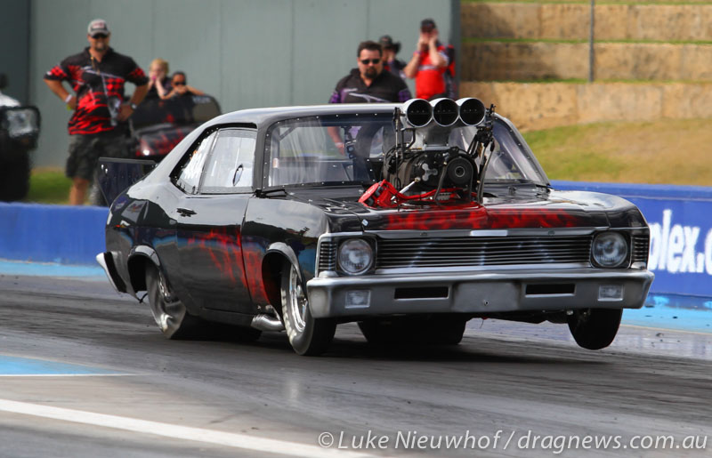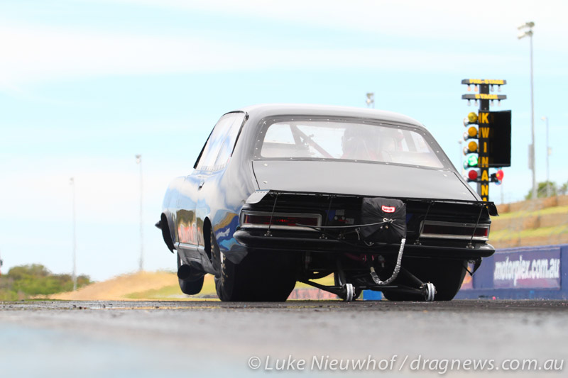 After a wild early pass that saw the Chevy Nova up on two wheels, Ben Hoar managed to get down the track strongly later in the day on a half track shut off. Looks like a definite six second car once sorted.