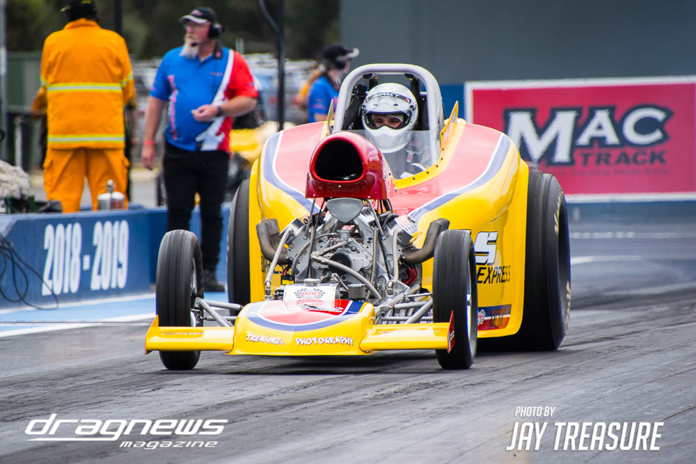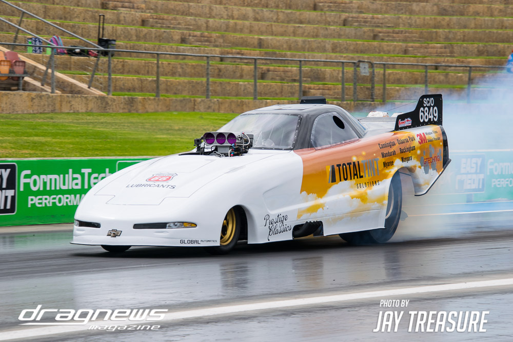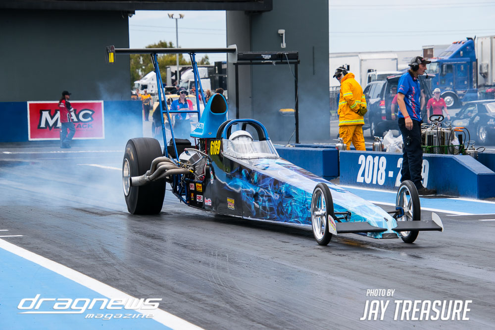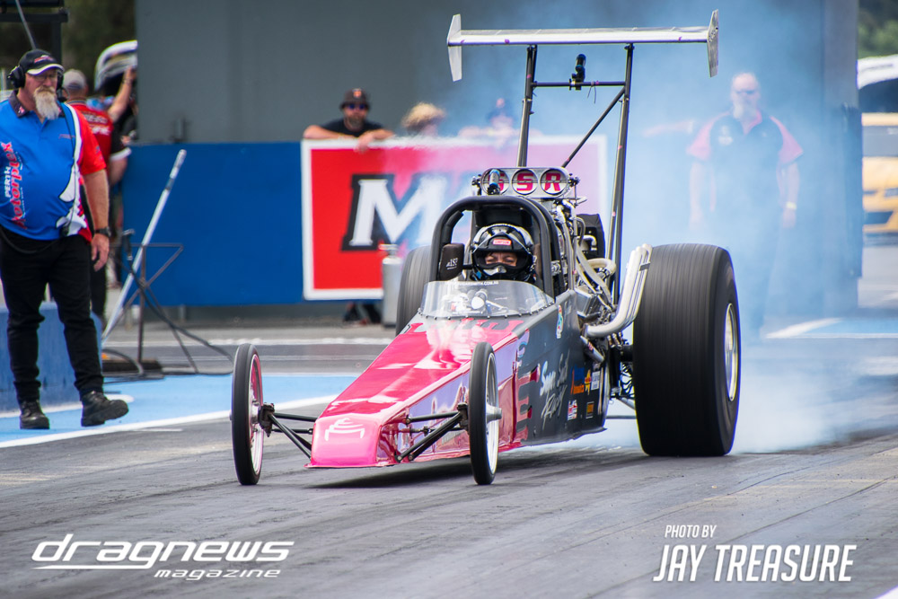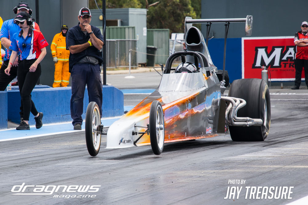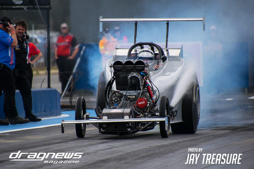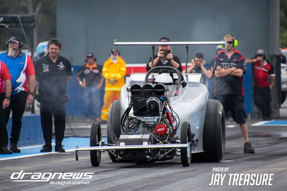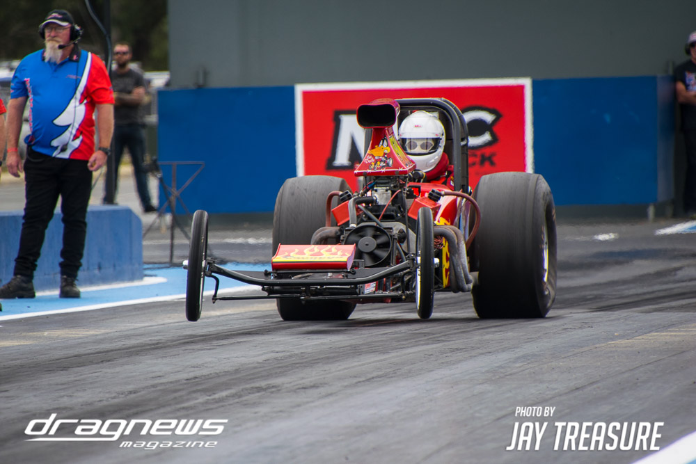 The Northern Territory’s Adam Murrihy defeated local favourite Andrew Katavatis out of the remaining Funny Cars, with a 5.86sec. run in the final driving Rory Taylor’s Nitro Thunder car. Katavatis overcame an electrical problem the team had been chasing but with more power on board they didn’t have enough runs to adjust their tune up.