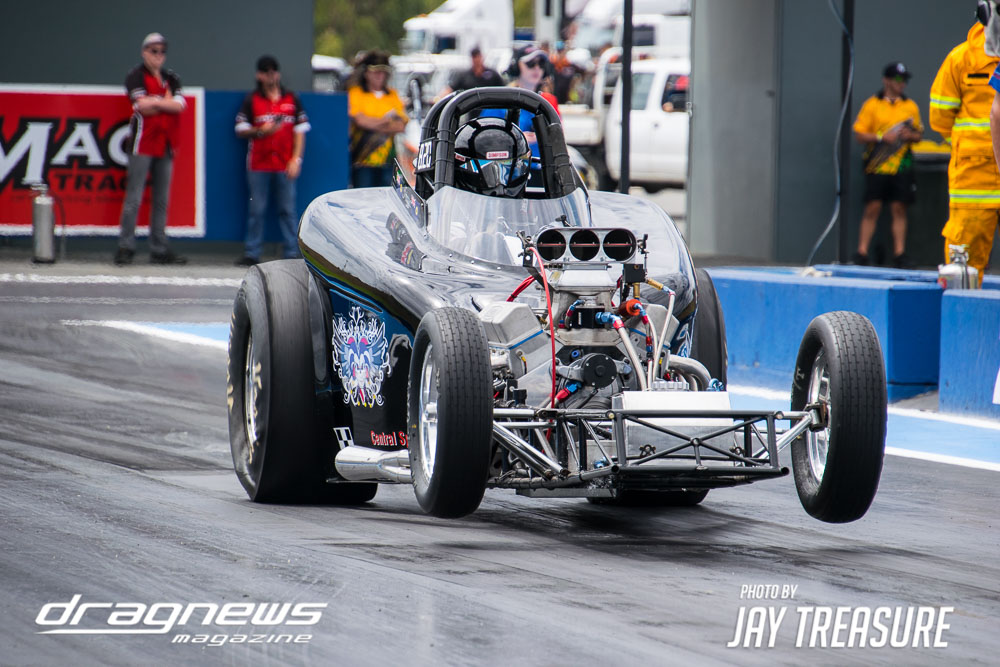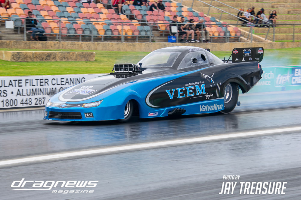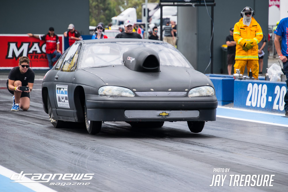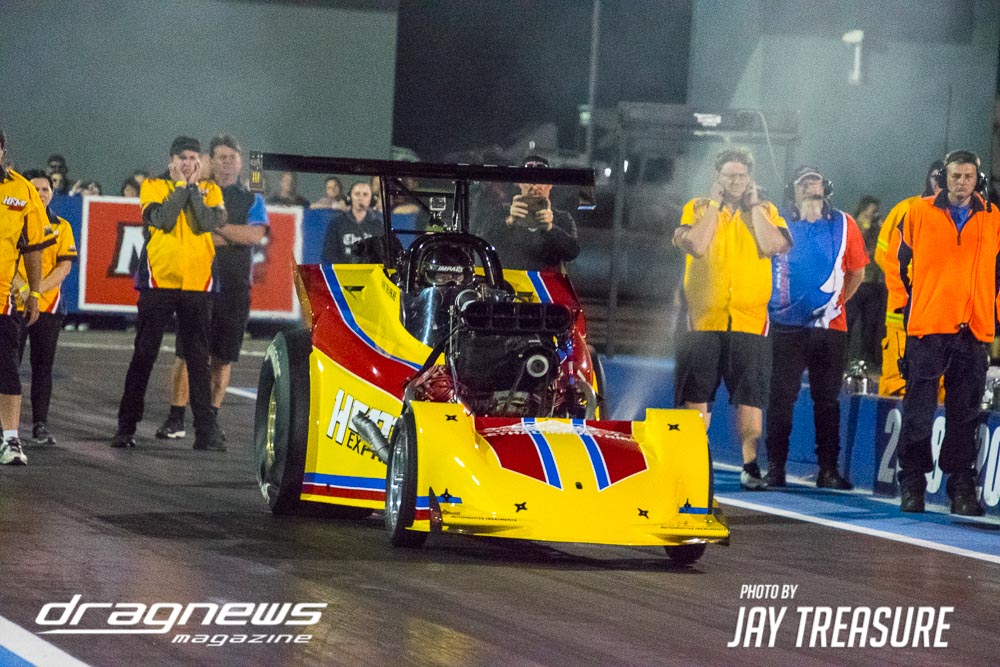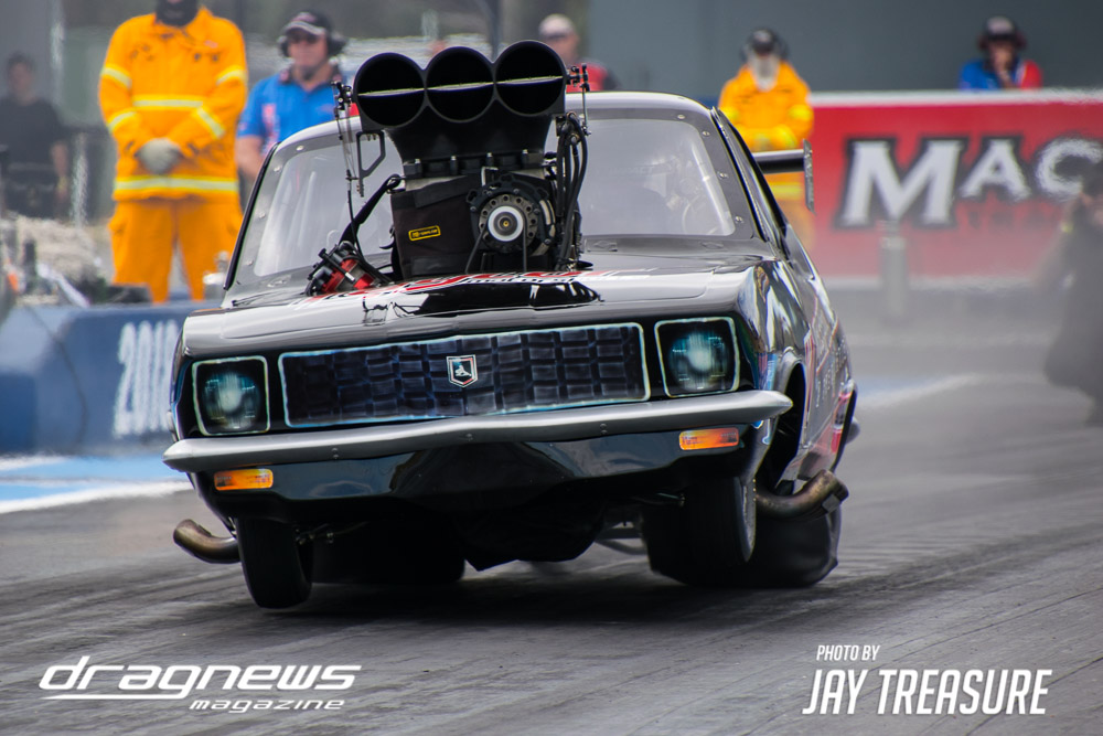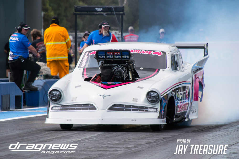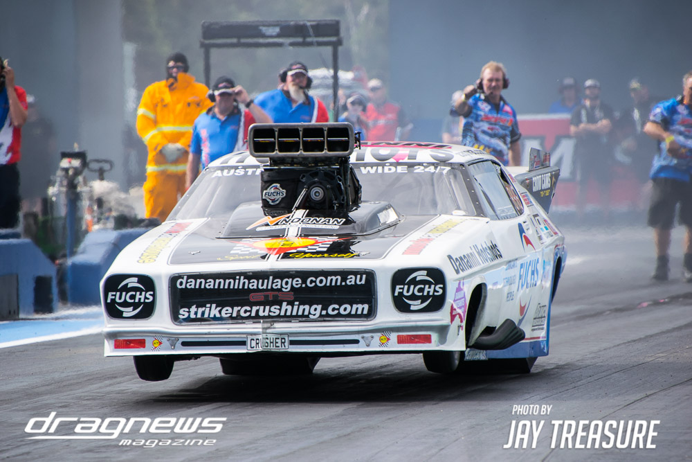 The Northern Territory’s Adam Murrihy defeated local favourite Andrew Katavatis out of the remaining Funny Cars, with a 5.86sec. run in the final driving Rory Taylor’s Nitro Thunder car. Katavatis overcame an electrical problem the team had been chasing but with more power on board they didn’t have enough runs to adjust their tune up.