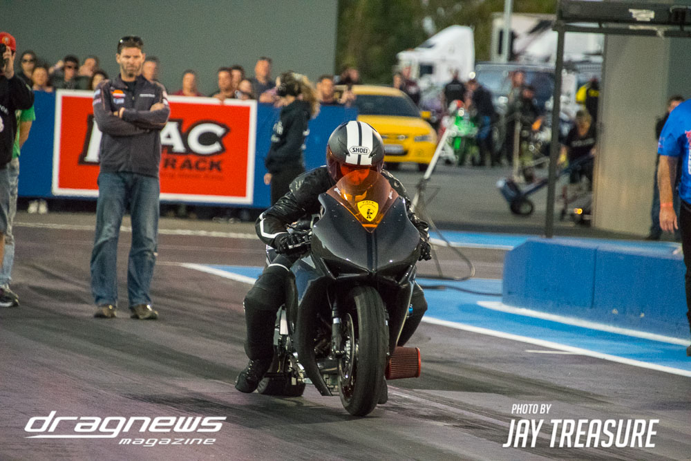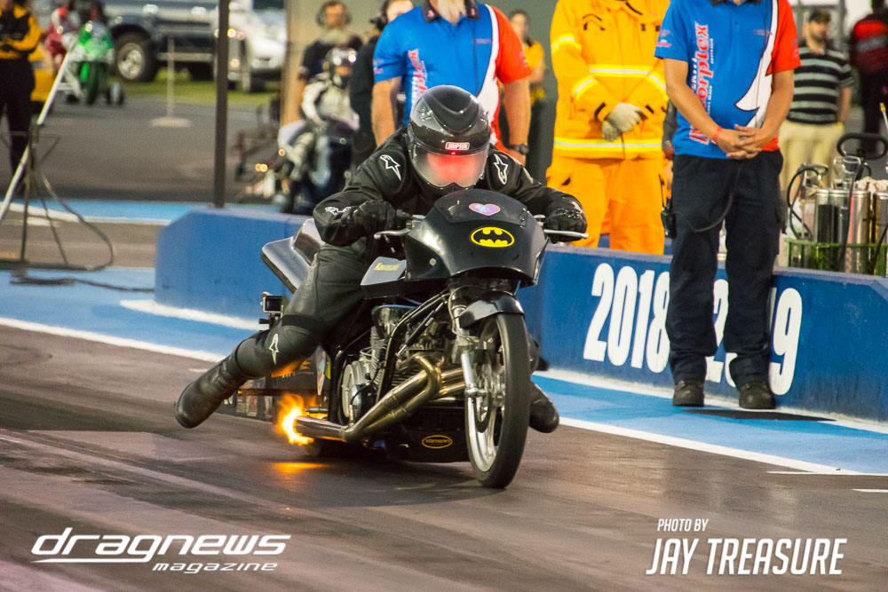 Errol Quartermaine defeated Nicholas Puglia in Super Comp, while Phill Paton took out Graeme Goldsworthy in Competition Bike. Jodie Mellitt and Alan Mahkoph again went toe to toe in the Supercharged Outlaws final, with Mellitt emerging victorious, while Chris Roe (above) went to his fifth straight final round and won in Top Sportsman against Alby Bakranich. Chris Moore rode to the Modified Bike win against Budgie Jones and Paul Garbellini took advantage of a red light from Graham Smith to take home the Super Street winner’s trophy.