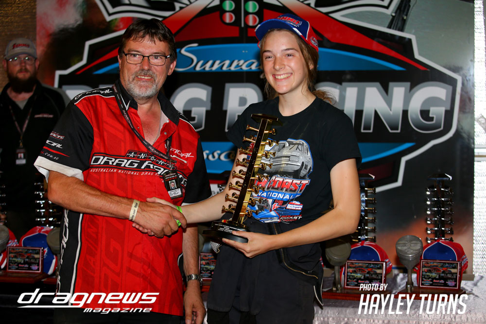 Joining Jake, Zara and Amber in hoisting ANDRA Christmas Tree trophies at the end of the Twilight Nationals were event winners Colin Griffin (Super Gas), Shane Walker (Modified Bike), Brian Symes (Super Street), Martin Mirco (Super Sedan), Wade Kisyma (Modified), Wayne Talbot (Supercharged Outlaws), Andrew Thompson (Top Sportsman), David Willis (Competition Bike) and Robert Dekert (Super Comp). Runners-up were Adrian McGrotty (Super Gas), Edge Mallis (Modified Bike), Andrew Shirley (Super Street), Jeff Maslin (Super Sedan), Peter O’Connell (Modified), Mike Evans (Supercharged Outlaws), Darren Saliba (Top Sportsman), Danny Rickard (Competition Bike) and Jake Chaisty (SuperComp).