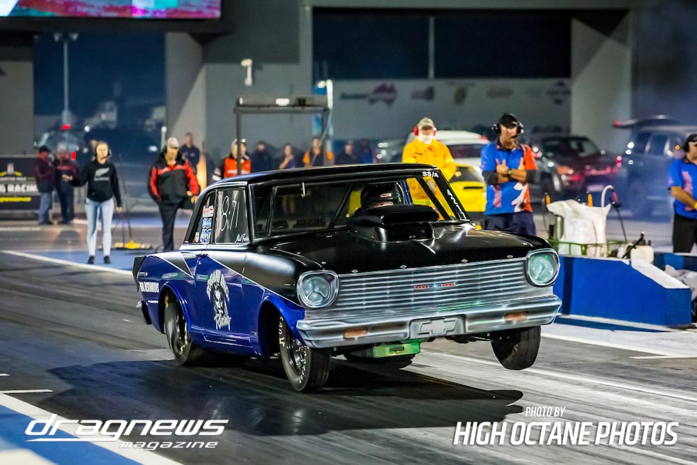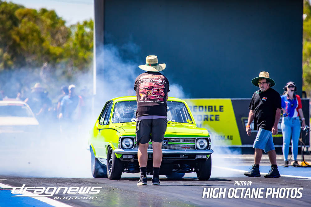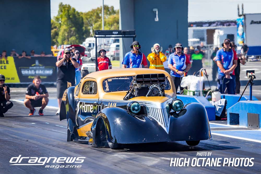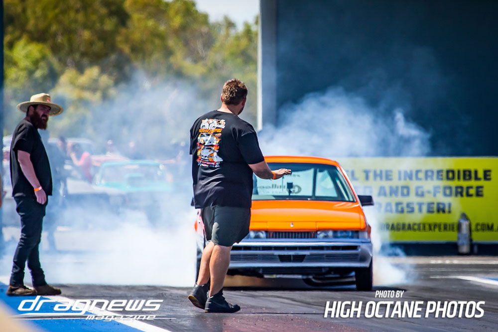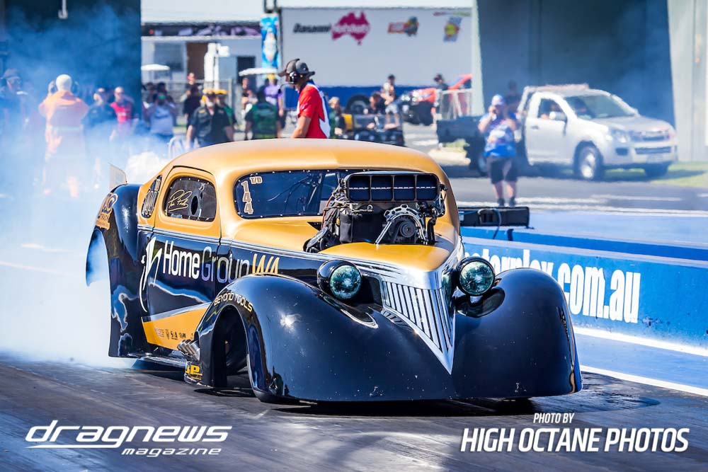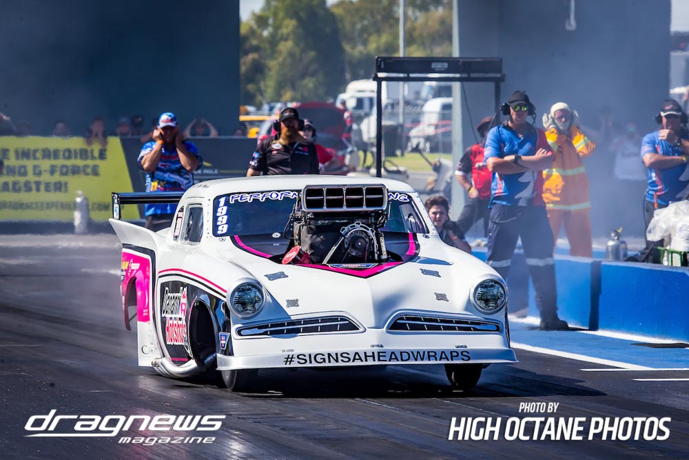 The Summer Slam was surprisingly tough with the top five cars qualified in the five second zone. Zappia positioned himself strongly early with a 5.64, following by Daniel Gregorini’s 5.70, Steve Aldridge’s 5.90, Marty Dack’s 5.96 and Mark Chapman’s 5.98. Stuart Moresby’s repaired Studebaker was only just outside the fives with a 6.02.