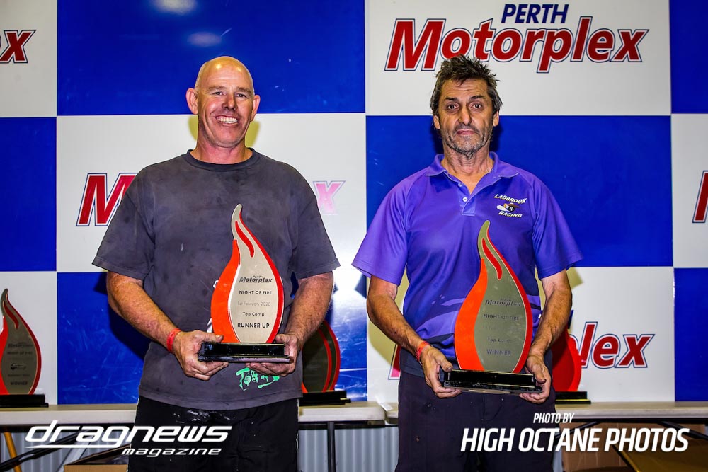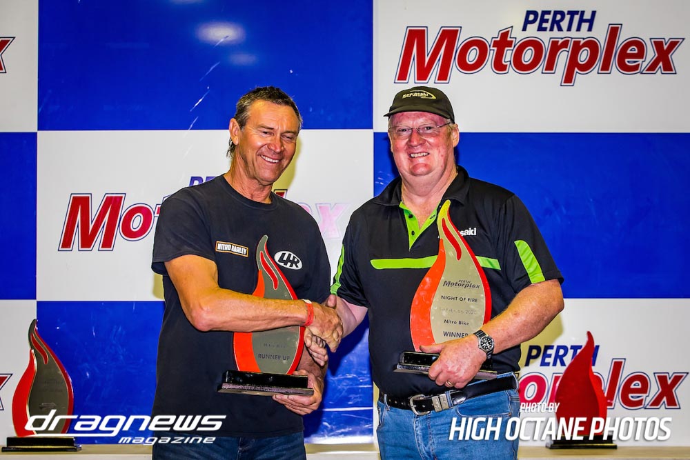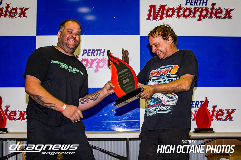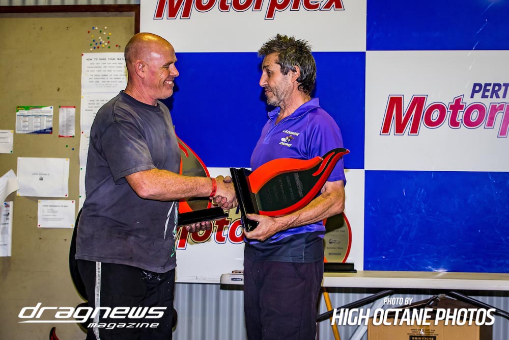 Other winners for the night included Russell Ladbrook (Top Comp), Jake Chaisty (Super Comp), Justin Townson (Competition Bike), Jodie Mellitt (Supercharged Outlaws), Alby Bakranich (Top Sportsman), Kevin Boulton (Outlaw Radial), Nicholas Wroe (Modified), Mick Fenton (Super Sedan), Ian Read (Modified Bike), Joel Trotman (Super Street) and Brodie Zappia (Junior Dragster).