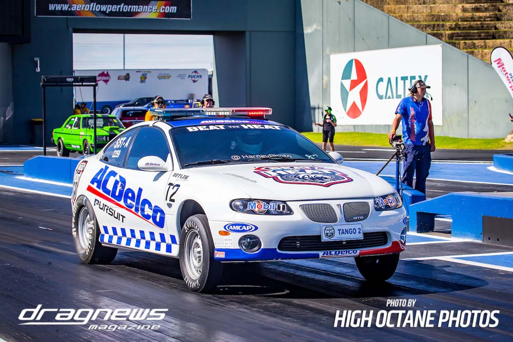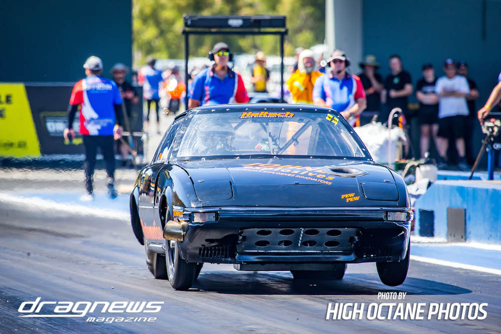 Racing did not see the pace ease up. Steve Aldridge won over a power standing Matt Abel, though he did not receive an elapsed time. Chapman used another 5.98 to defeat Stuart Moresby’s 6.21, Gregorini clocked a 5.68 to outrun Kelvin Lyle’s 5.80, Pino Priolo soloed to a 6.50 when Dack had problems, while Zappia went 5.63 to get by a red lighting Ryan Moresby.