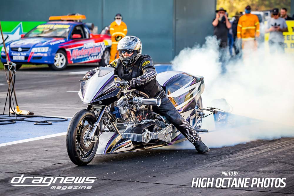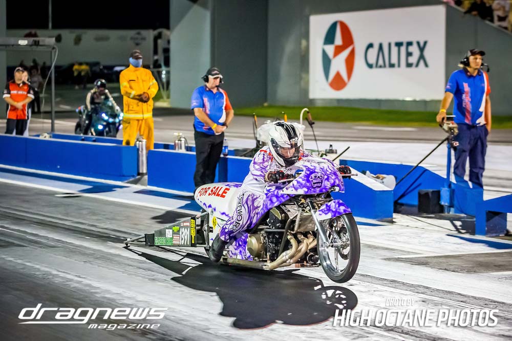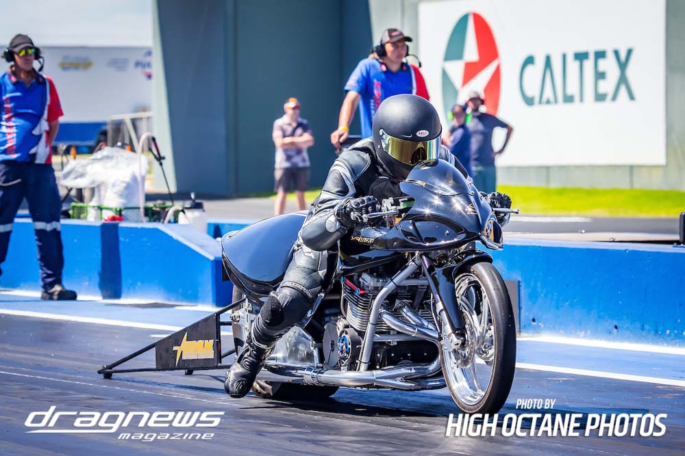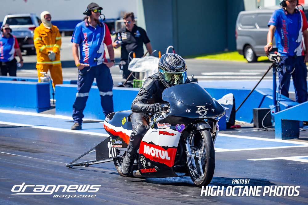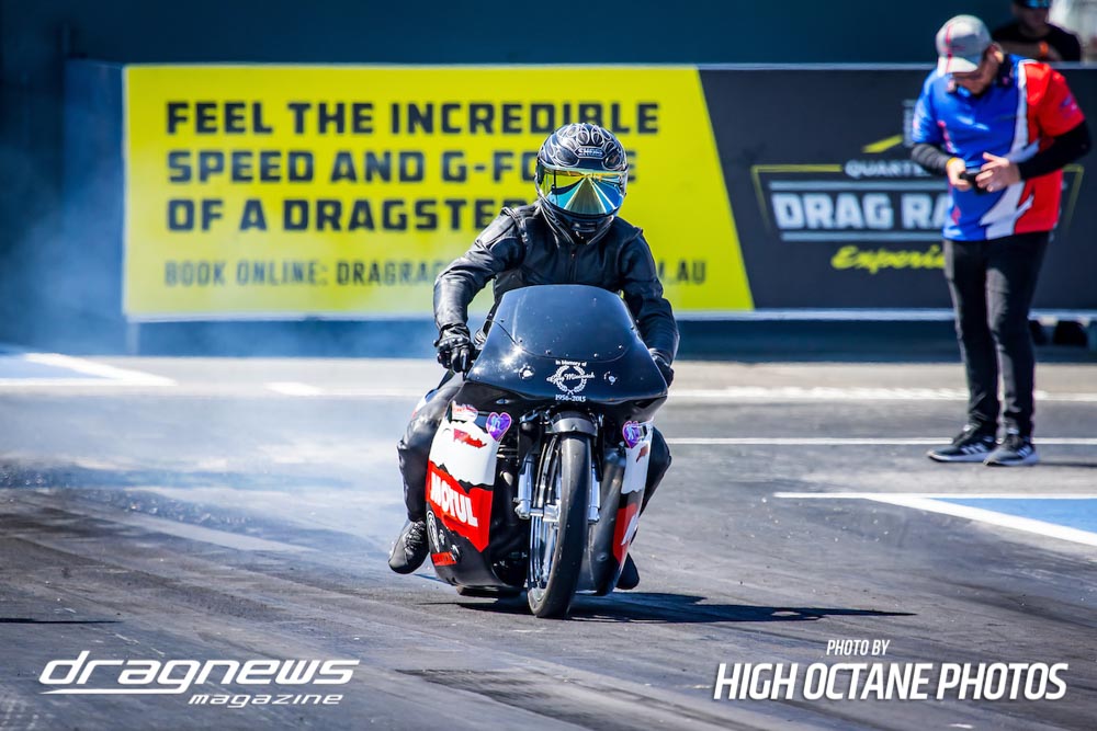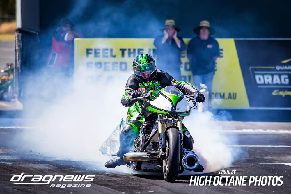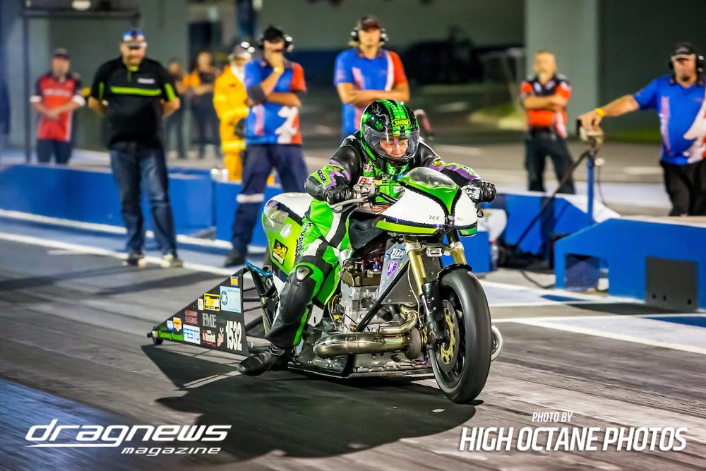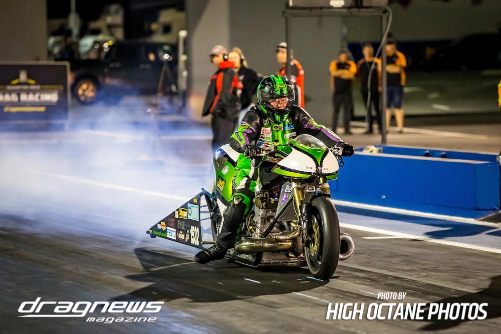 The Nitro Bike class saw Greg Durack run a new personal best time of 6.77sec. aboard his turbocharged Kawasaki, defeating Les Holden in the final round.