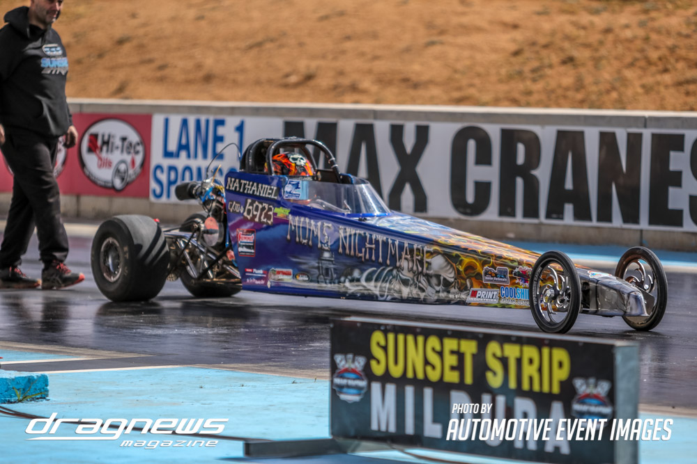 In the Modified ranks, defending champion and top qualifier Adam Mundy got his championship defence off to a strong start with a Sunset Strip Nationals event victory. Mundy was treated to two bye runs across the first round and the fourth round of racing today, defeating Matt Ponton and Stewart Johnston in rounds two and three. Chris Farrell meanwhile had earlier taken victories from Marino Gregoric (round one), Bradley Hicks (round two) and Josh Baker (round four) and enjoyed a bye run in round three.