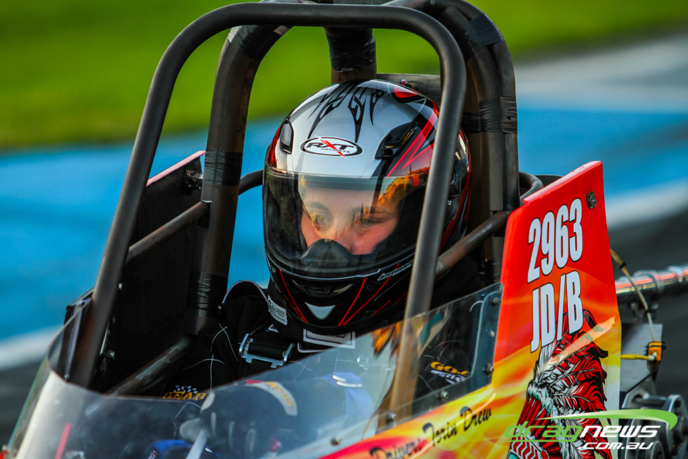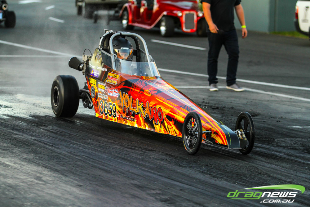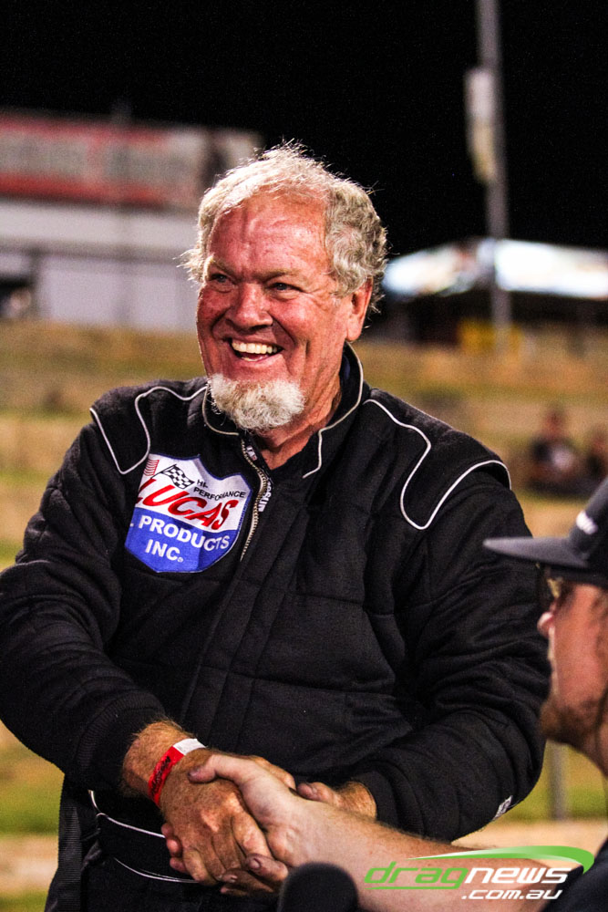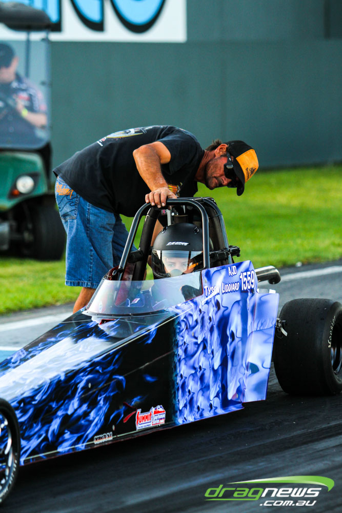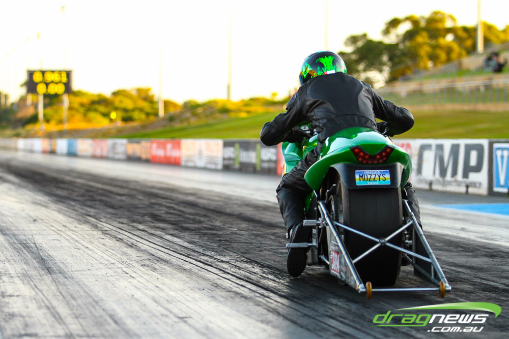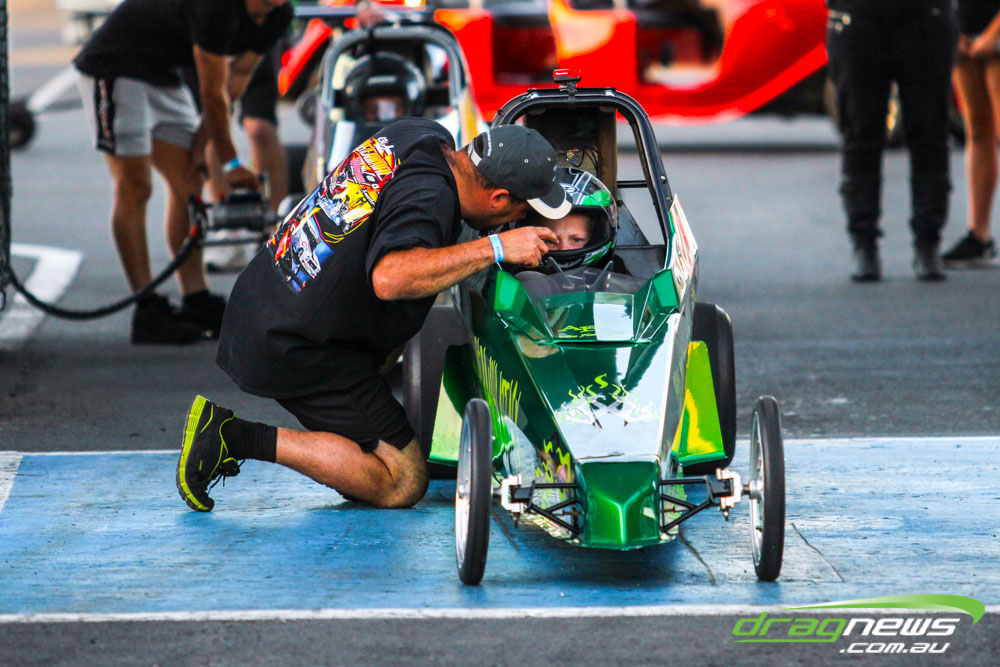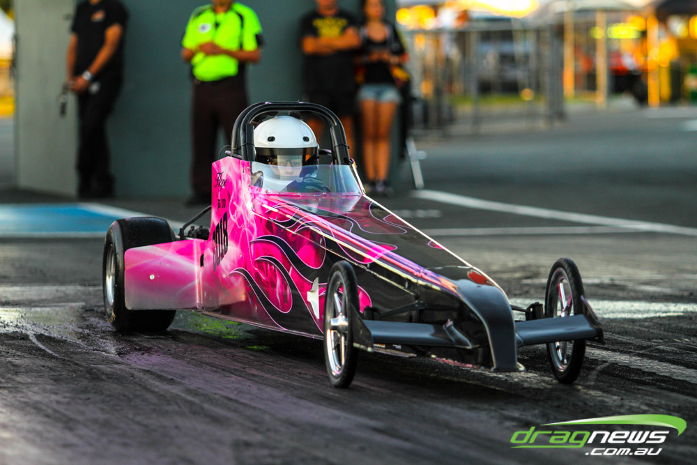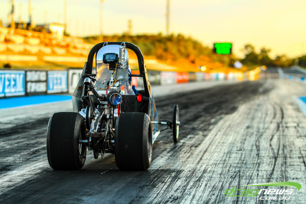 The leaders in the sportsman categories include Errol Quartermaine with a -.19 7.75 (Super Comp), Wayne Patterson on a -.02 8.87 (Competition Bike), Sam Treasure’s 6.52 (Supercharged Outlaws), Brad Baker with an 8.16 (Modified), Colin Davis’ 7.61 (Super Sedan), Martin Palmer on an 8.49 (Modified Bike), Graeme Smith’s 11.05 (Super Street) and Beau Higgins’s 8.08 (Junior Dragster).