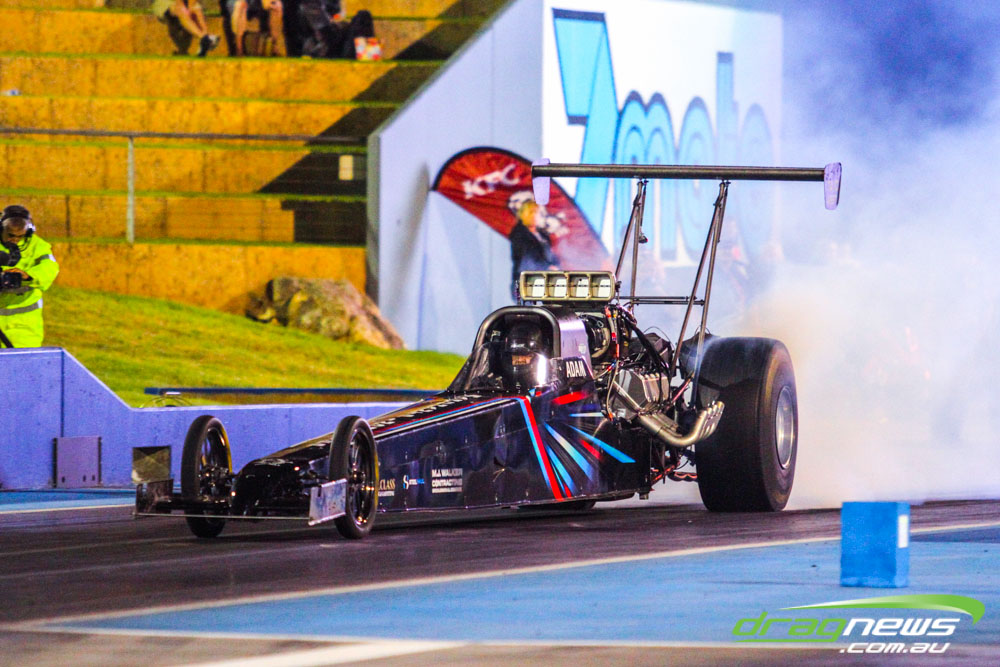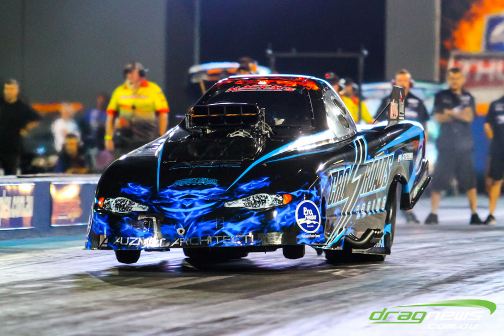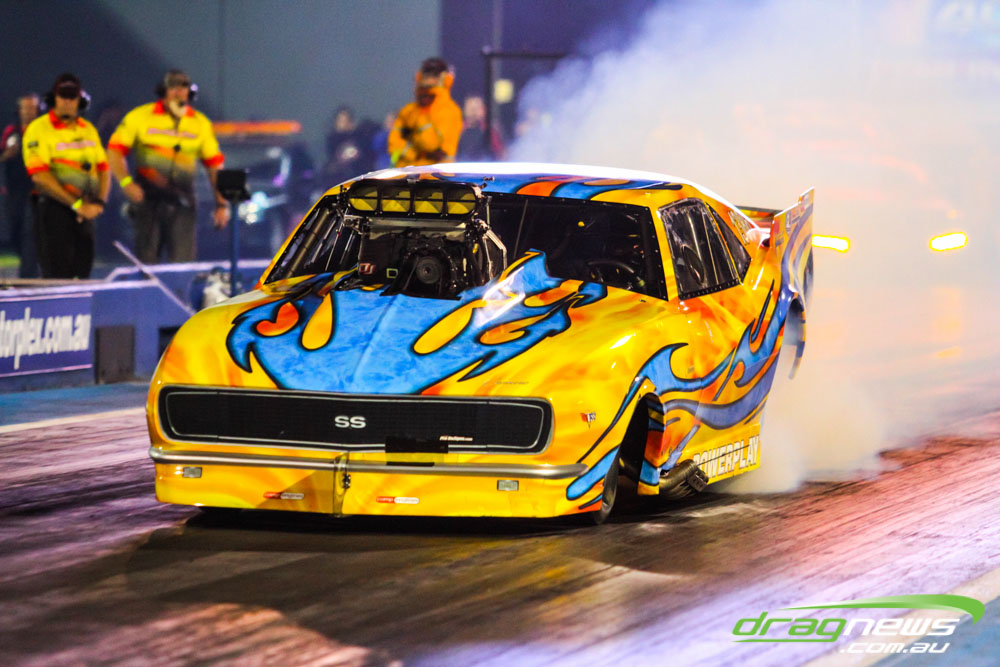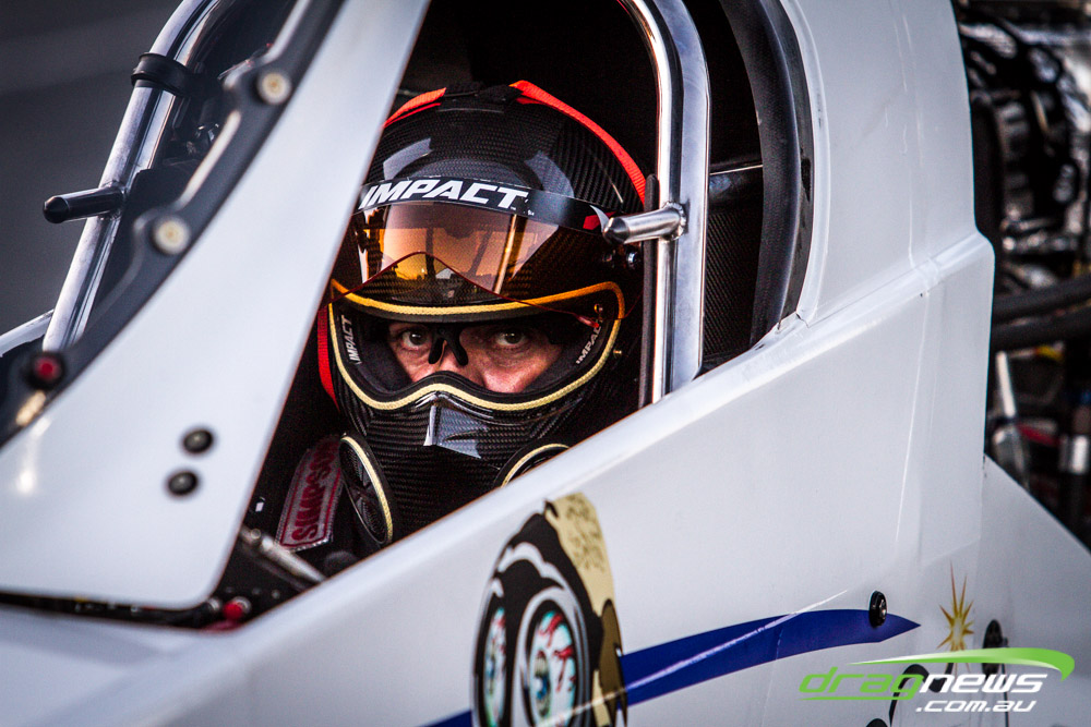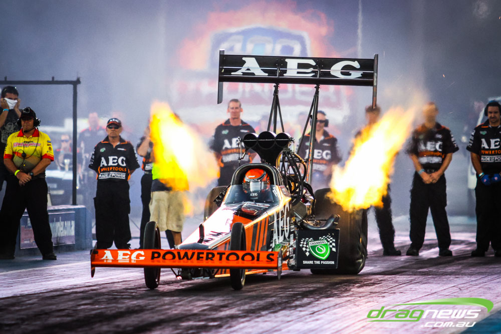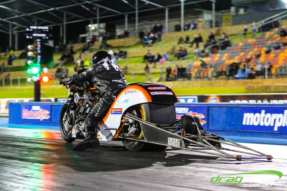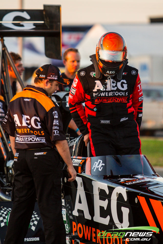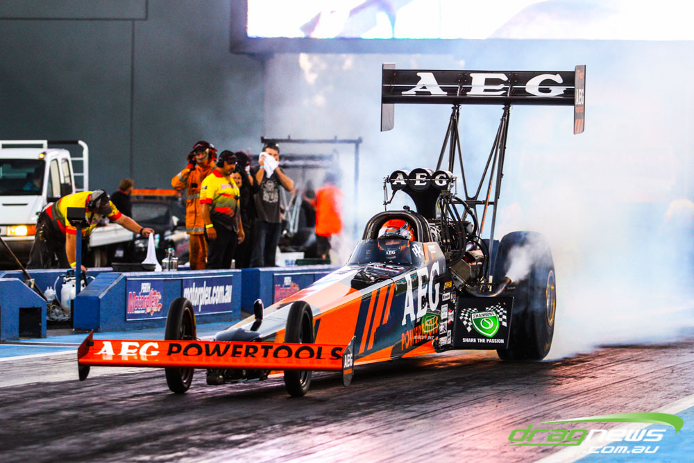 Darren Morgan put in two consistent runs with the AEG Top Fuel dragster to lead that field going into race day. Morgan’s 4.748 at 504kmh held off a 4.89 from Wayne Newby and a 4.91 from Damien Harris, while Mark Sheehan struggled on two runs with engine dramas, settling for a best of 5.265.
