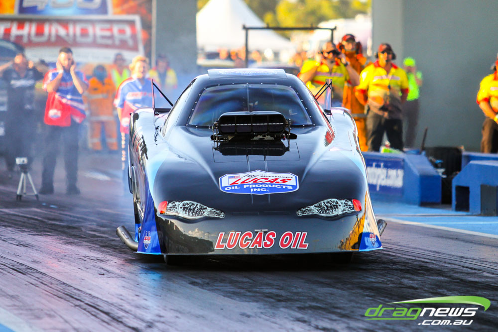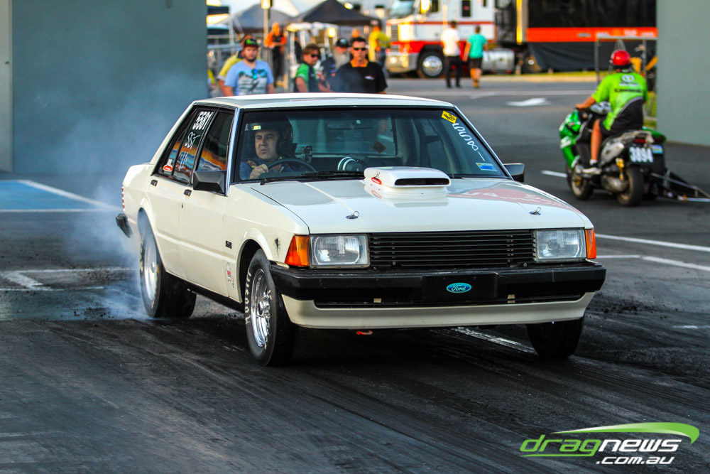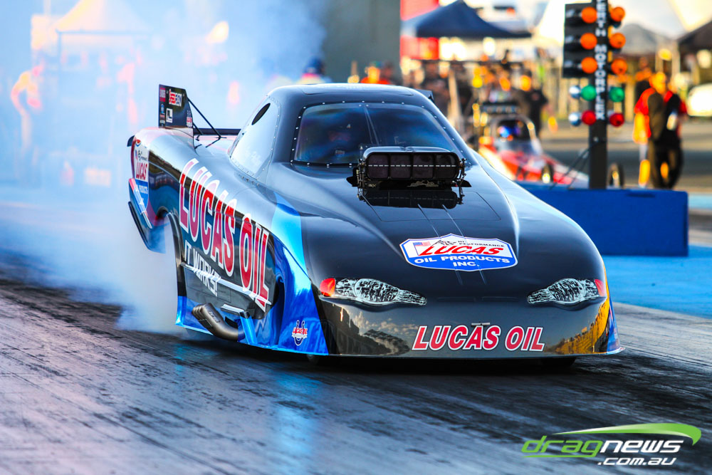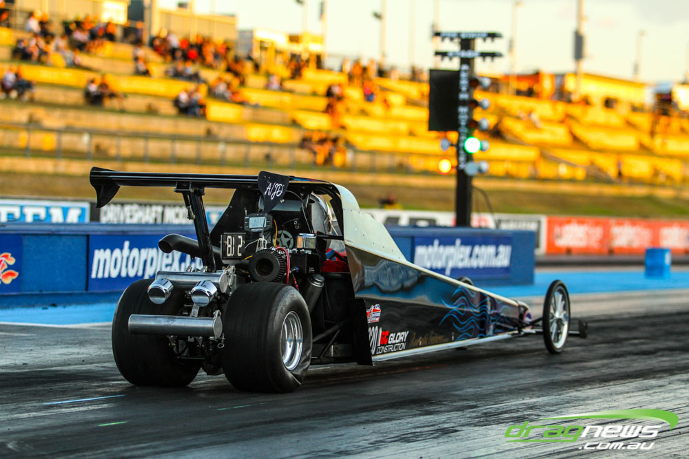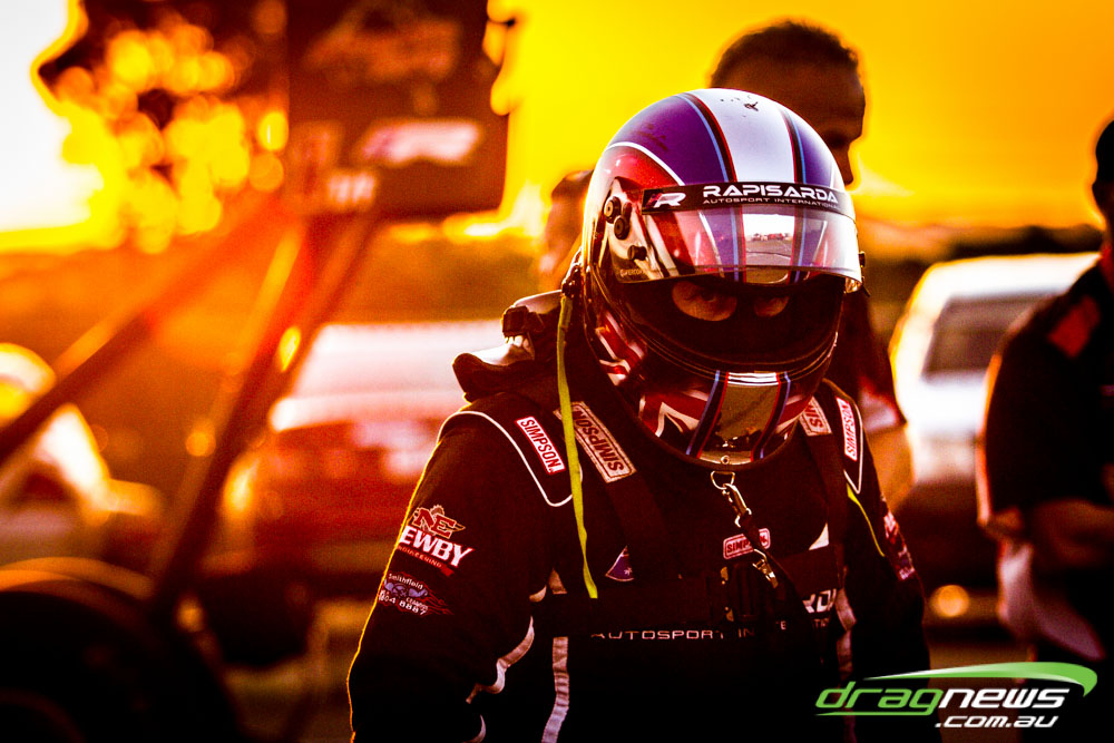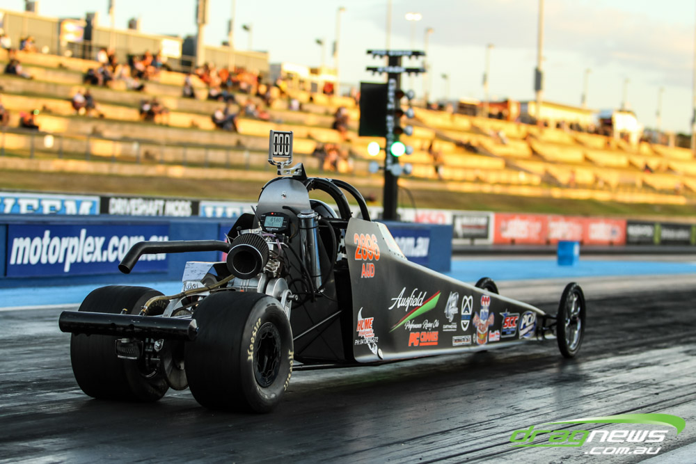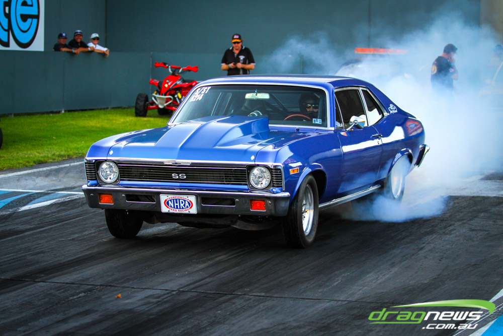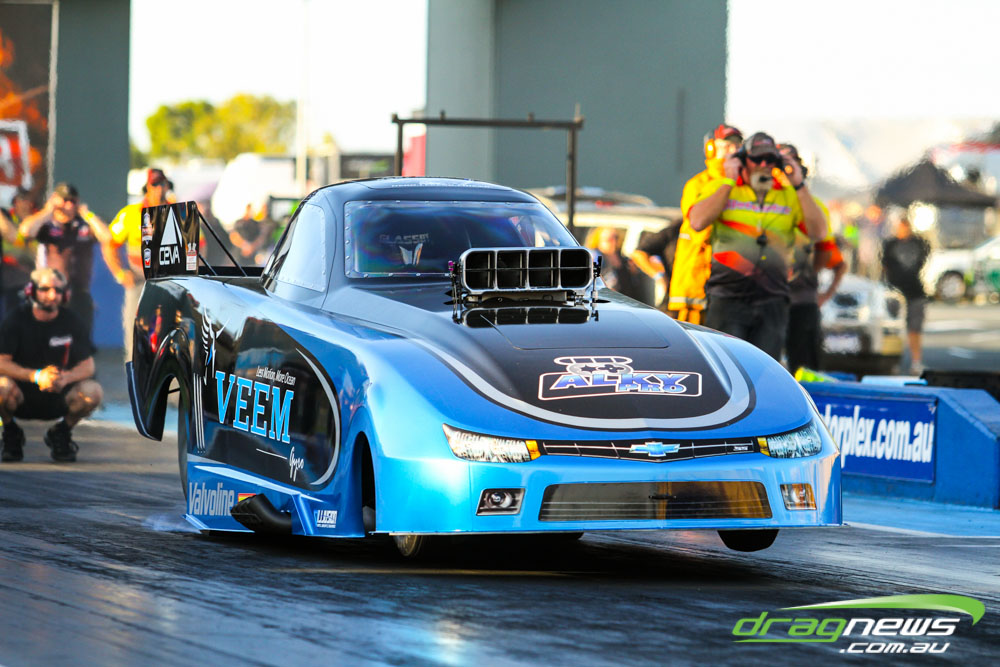 Darren Morgan put in two consistent runs with the AEG Top Fuel dragster to lead that field going into race day. Morgan’s 4.748 at 504kmh held off a 4.89 from Wayne Newby and a 4.91 from Damien Harris, while Mark Sheehan struggled on two runs with engine dramas, settling for a best of 5.265.