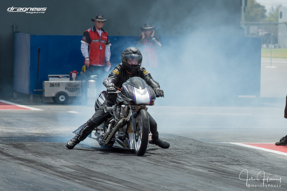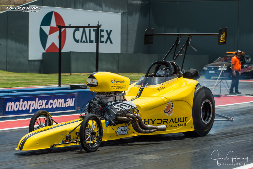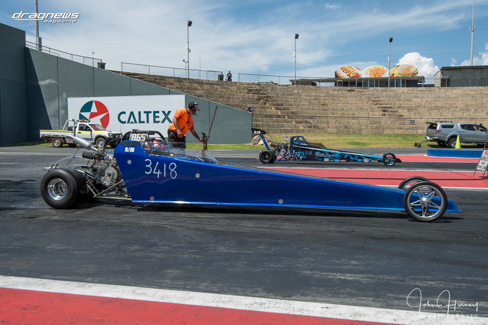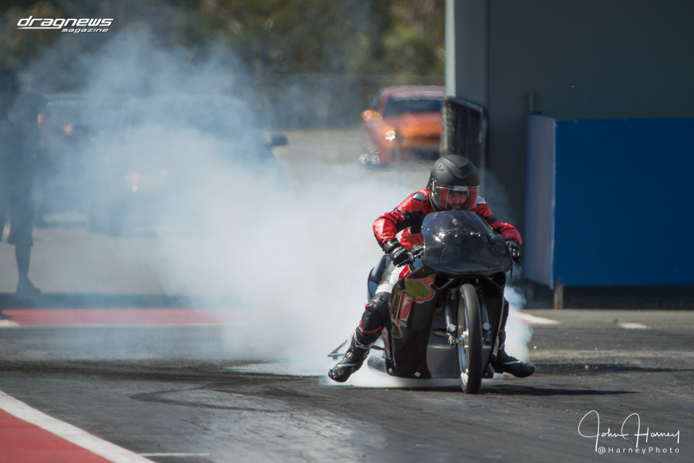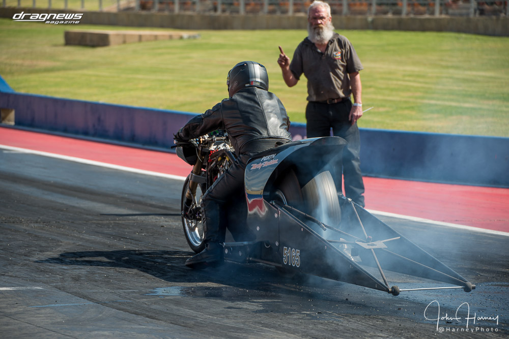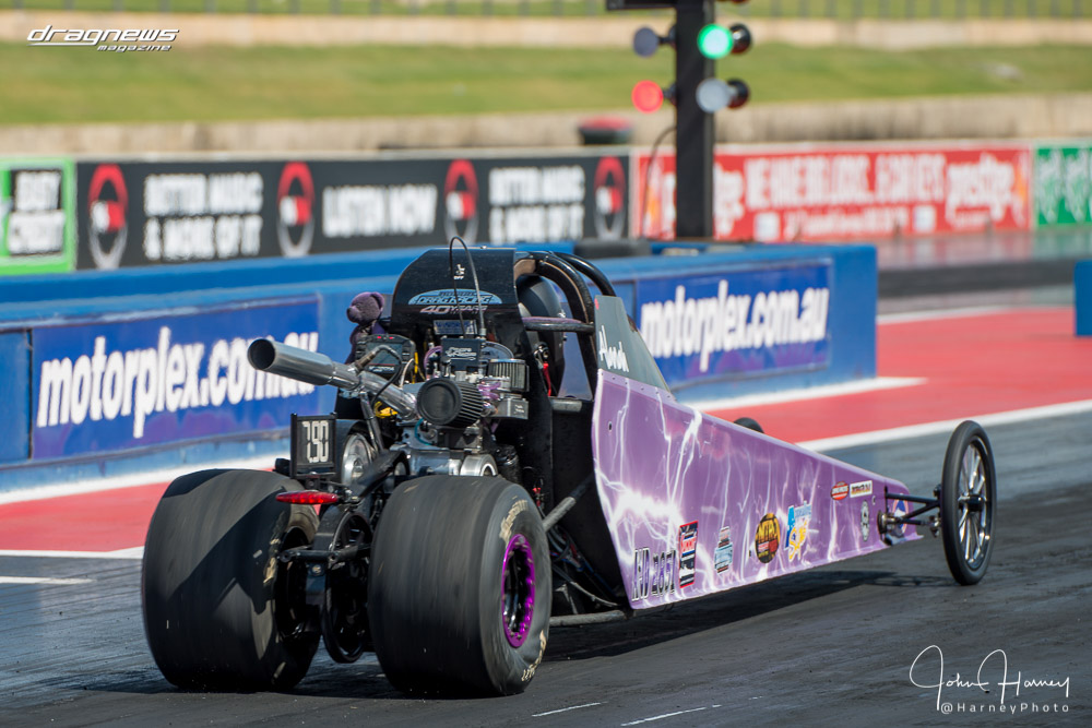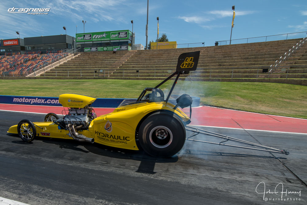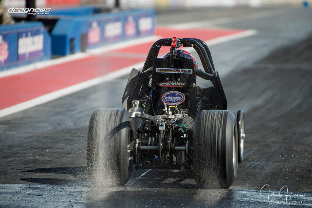 Tracey De Jager had a shocker of a day, after a gearbox problem during the first startup of the Nitro Nanna Thunderbird. The team decided to pack the car into the transporter and head for home to strip down the troublesome box. Tracey is hoping to break the Australian AA/APA record after being only 0.002 off the record last time, in what would be a fitting end to the Thunderbird before it is sold to make room for their Outlaw Nitro Funny Car.