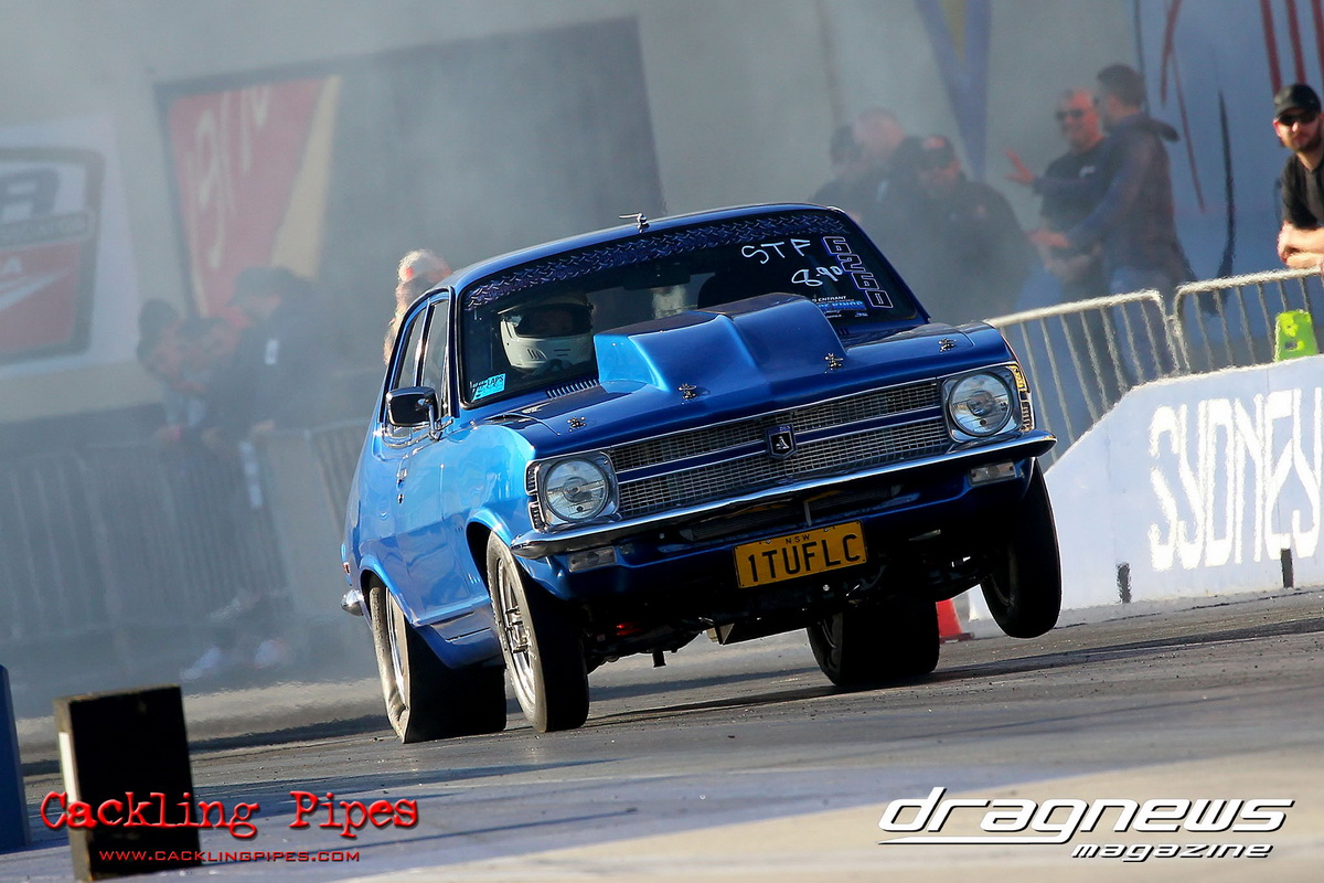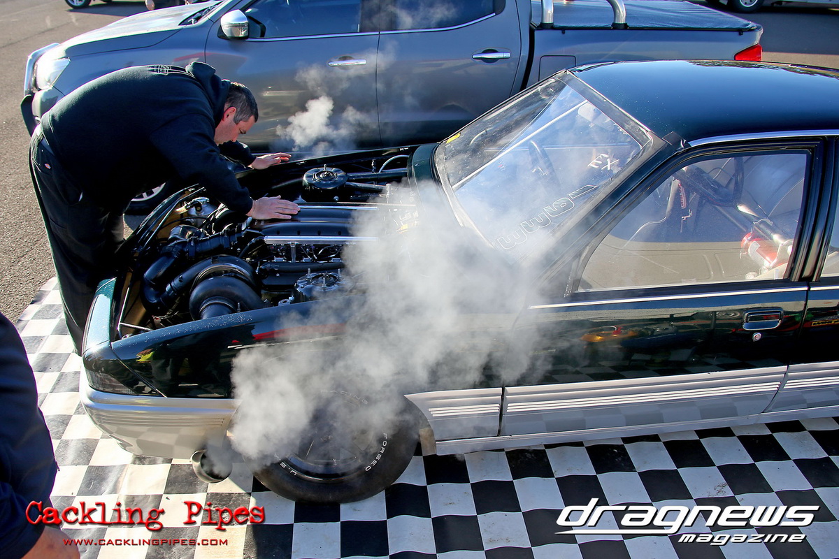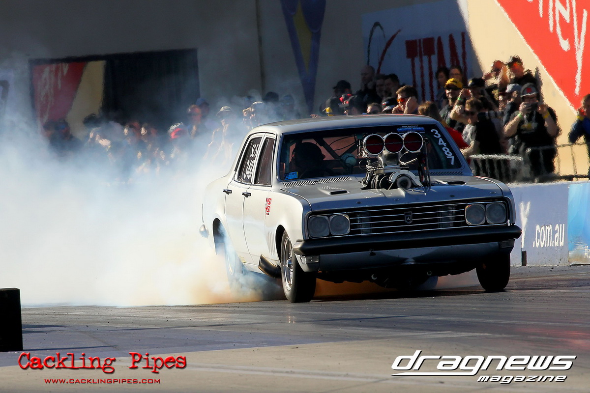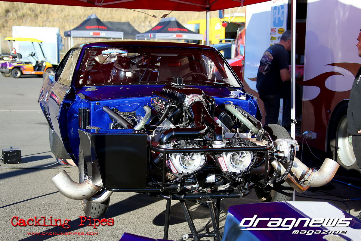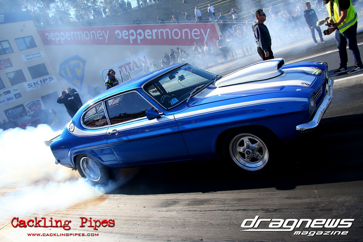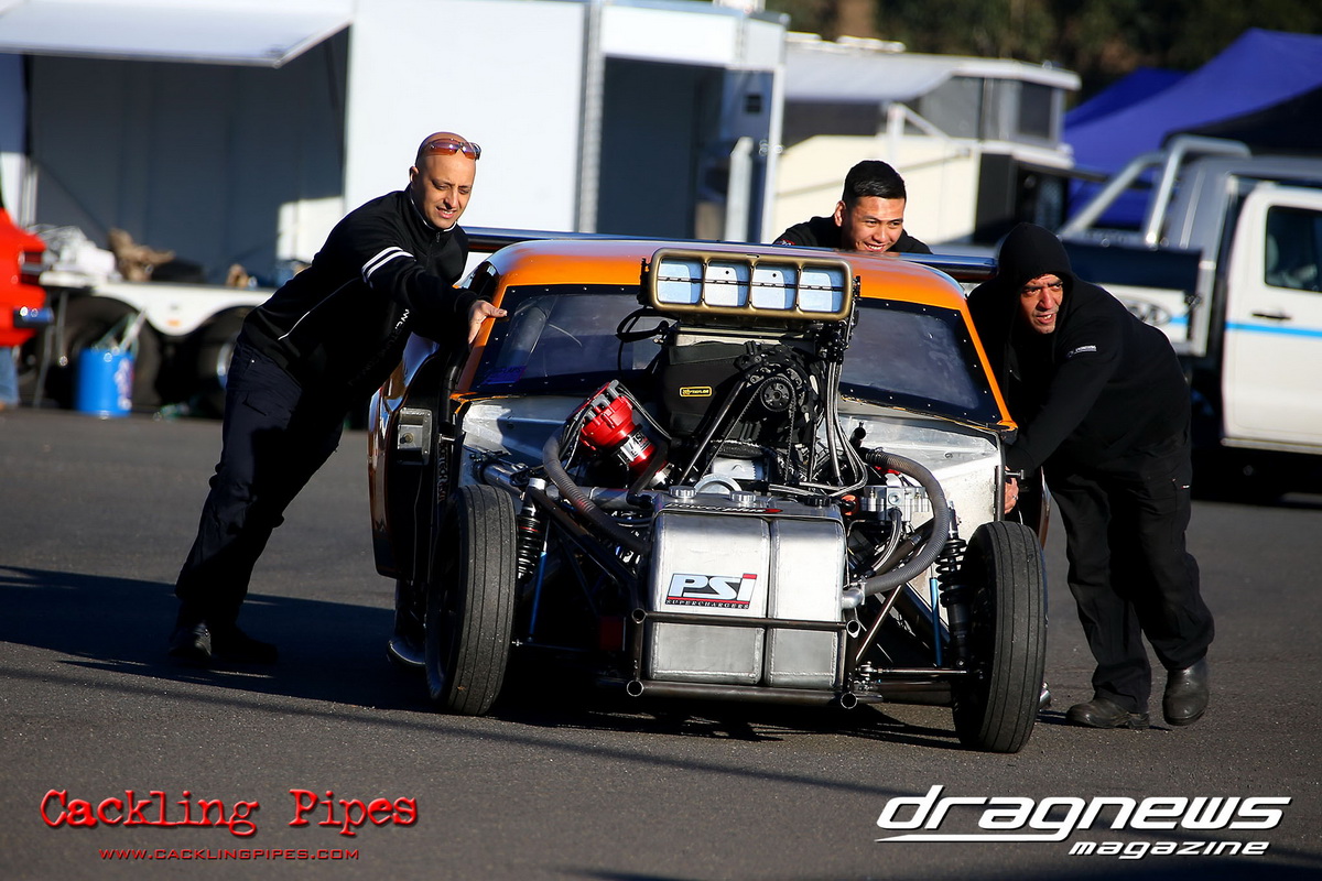 With no qualifying in the format, the first round is straight off the trailer, racers drew opponents and lane before racing for their match ups, and first up was Kit Hunter versus Craig Burns. With Burns a strong favourite following a string of 6.0s in testing from his blown Mustang, Hunter would need some luck. As luck would have it for Burn’s it was of the bad kind, the Mustang’s blown motor falling silent going into stage and Hunter took off for an unexpected round one win with a 4.59. Two serious contenders rolled out in the second pairing, Russell Taylor’s wheelstanding Torana has melted the internet with PB runs in testing, and Paul Todarello’s show stopping twin turbo Torana. Taylor still a solid favourite like Burns with strong testing results, suffered a similar fate with the blown Torana shut down after fluid was left on the track following the burnout, leaving Todarello would move on. We would not get a paired pass in the next race either with Danny Makdessi jumping through the beams in his Valiant trying to take on Jeremy Callaghan’s 481X powered Camaro, which would of been tough to beat anyway with a 4.120. Steve Bezzina put his wild XW through to the next round with a 4.64 win over a bunny hopping rotary of Frank Cannistra. Craig Hewitt had left the big shoes off and stayed on the radials for the event with the team happy to keep the blown Monaro a dedicated radial machine, and took an easy win over Darren Hubbard’s blown Holden 4.37 to a 5.98. Wrapping up the first round was Jason Mansweto in the iconic Capri and David Hellyer with the only aspirated car in the field. The sniff of nitrous getting the BBF Capri home with a 4.49 to a 4.57.