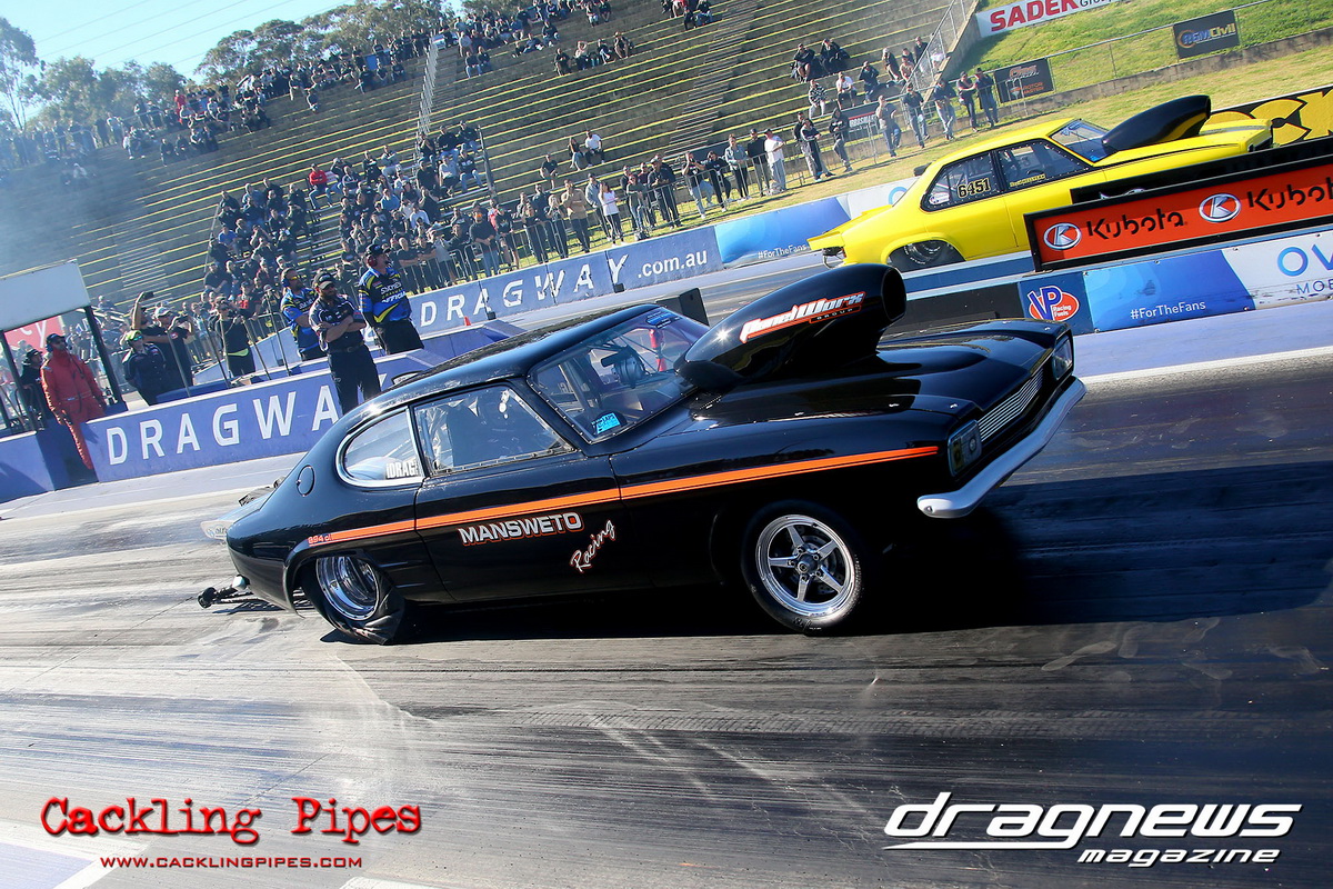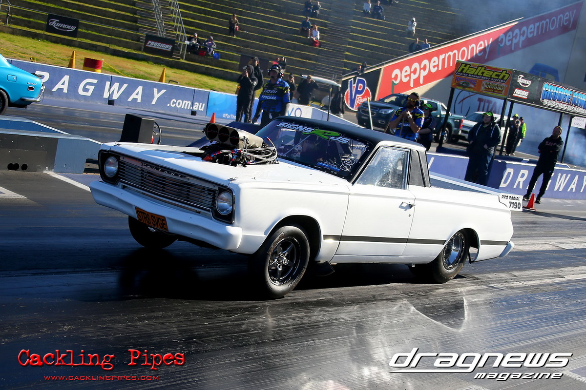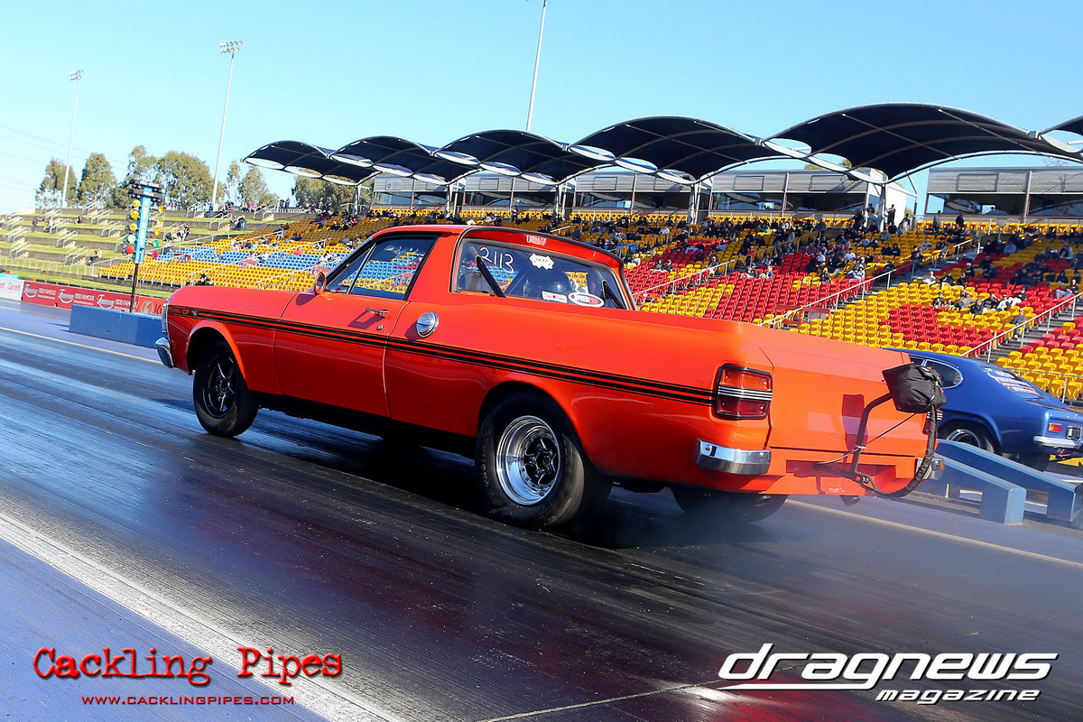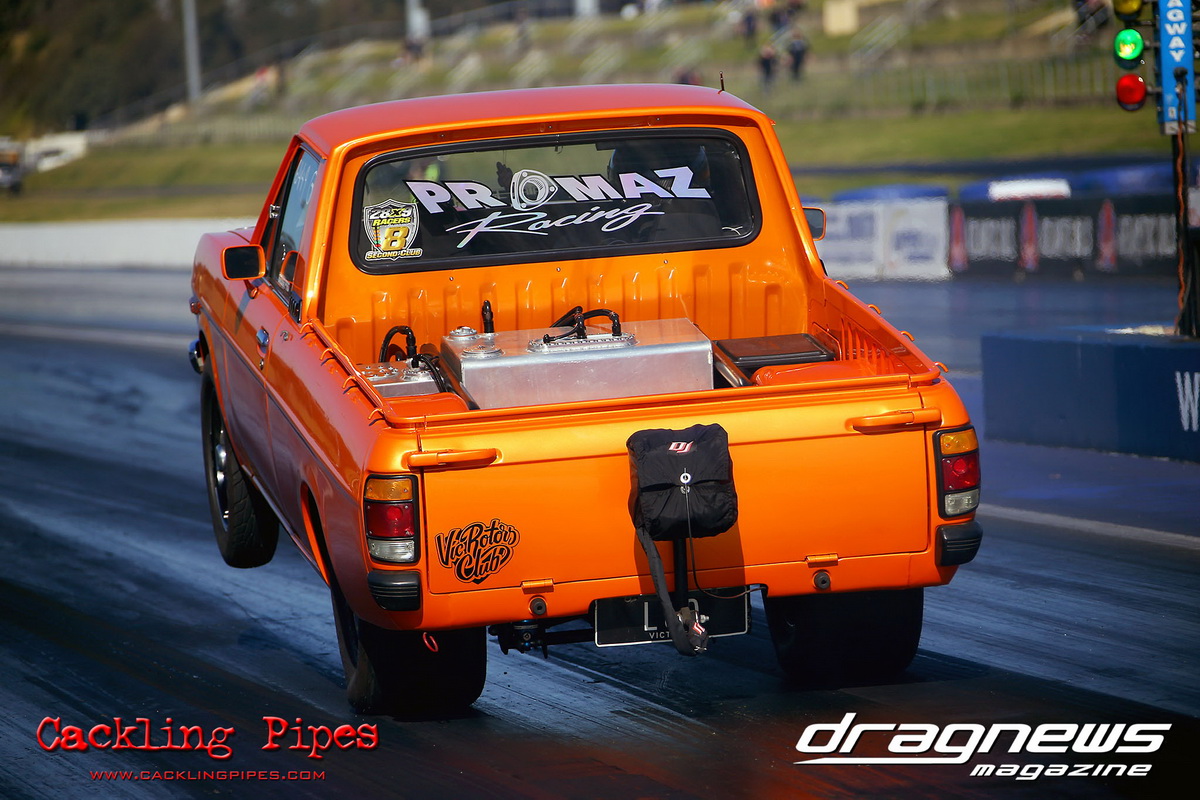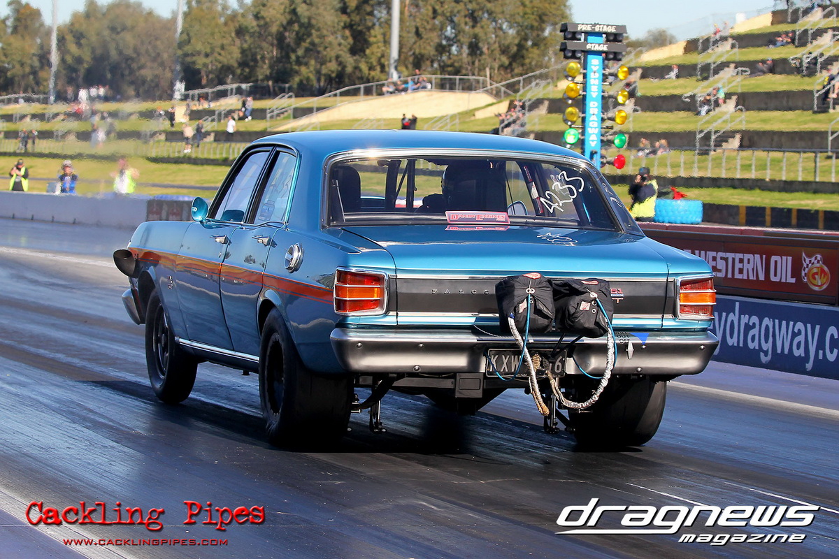 With no qualifying in the format, the first round is straight off the trailer, racers drew opponents and lane before racing for their match ups, and first up was Kit Hunter versus Craig Burns. With Burns a strong favourite following a string of 6.0s in testing from his blown Mustang, Hunter would need some luck. As luck would have it for Burn’s it was of the bad kind, the Mustang’s blown motor falling silent going into stage and Hunter took off for an unexpected round one win with a 4.59. Two serious contenders rolled out in the second pairing, Russell Taylor’s wheelstanding Torana has melted the internet with PB runs in testing, and Paul Todarello’s show stopping twin turbo Torana. Taylor still a solid favourite like Burns with strong testing results, suffered a similar fate with the blown Torana shut down after fluid was left on the track following the burnout, leaving Todarello would move on. We would not get a paired pass in the next race either with Danny Makdessi jumping through the beams in his Valiant trying to take on Jeremy Callaghan’s 481X powered Camaro, which would of been tough to beat anyway with a 4.120. Steve Bezzina put his wild XW through to the next round with a 4.64 win over a bunny hopping rotary of Frank Cannistra. Craig Hewitt had left the big shoes off and stayed on the radials for the event with the team happy to keep the blown Monaro a dedicated radial machine, and took an easy win over Darren Hubbard’s blown Holden 4.37 to a 5.98. Wrapping up the first round was Jason Mansweto in the iconic Capri and David Hellyer with the only aspirated car in the field. The sniff of nitrous getting the BBF Capri home with a 4.49 to a 4.57.