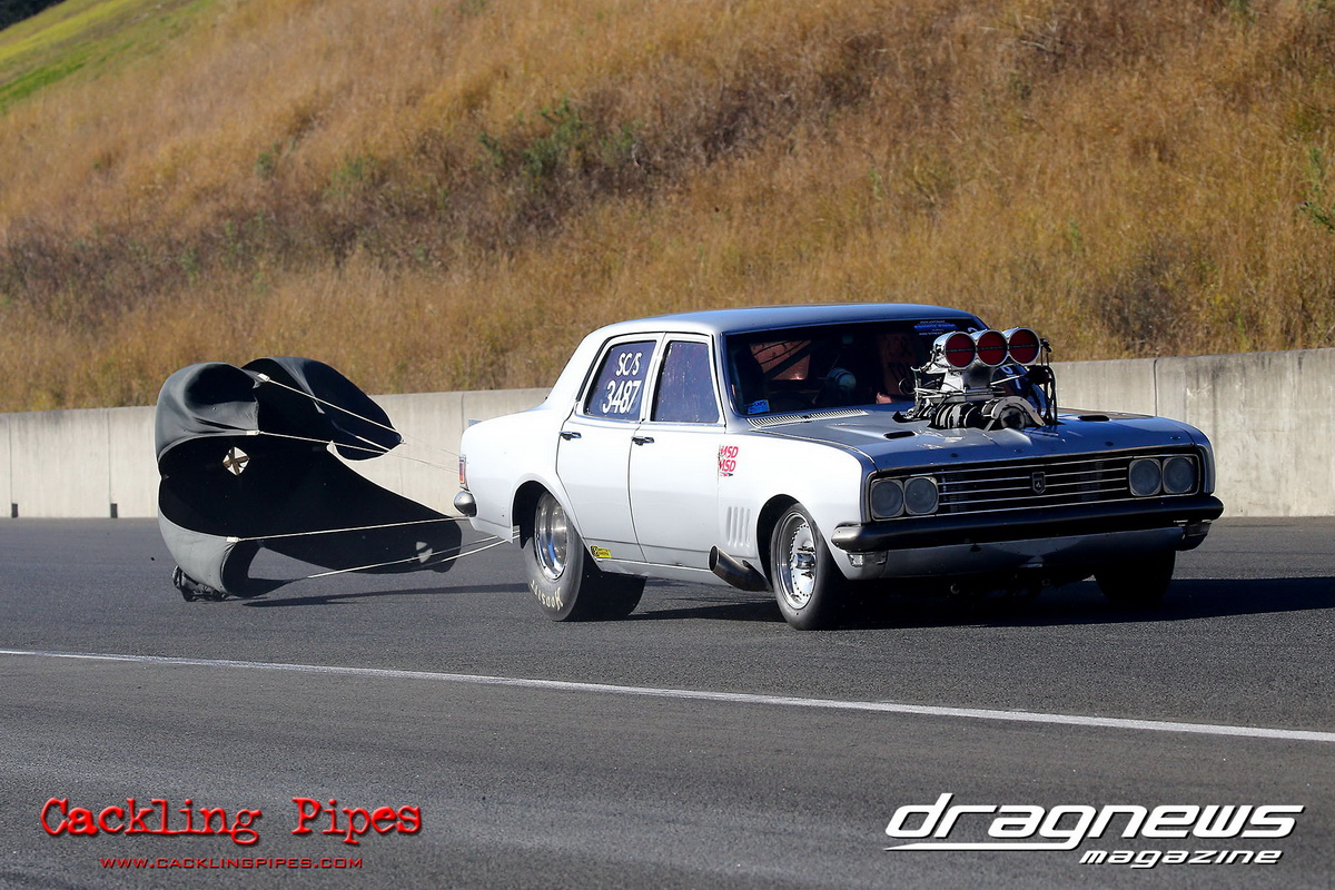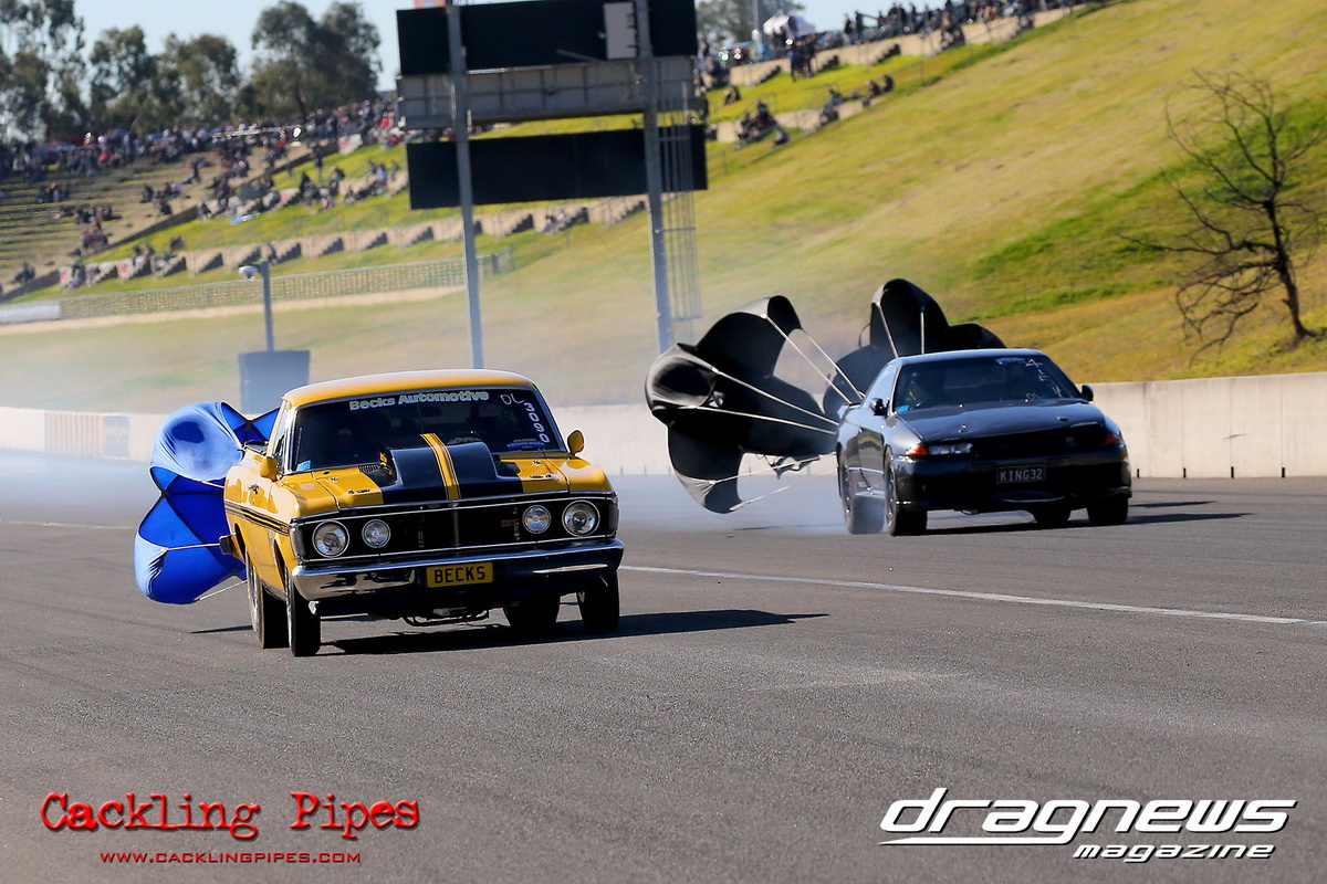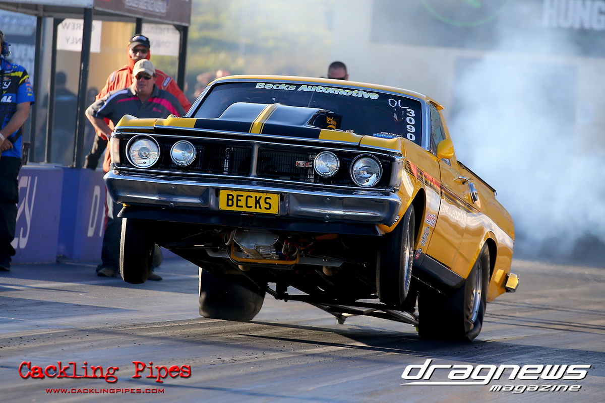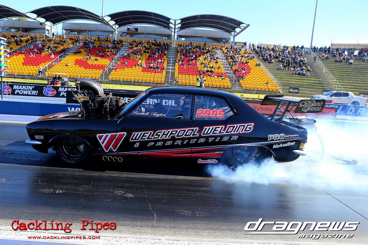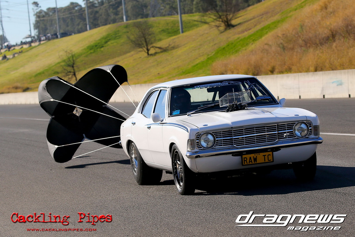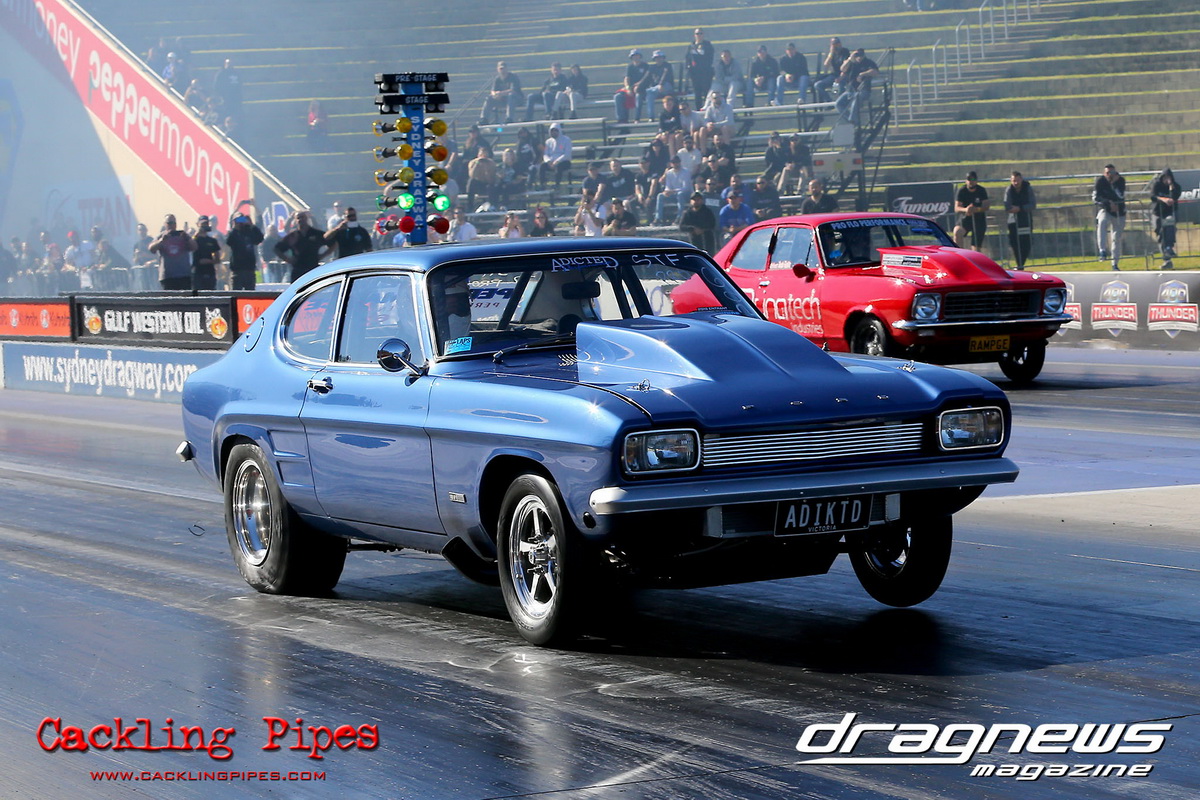 With no qualifying in the format, the first round is straight off the trailer, racers drew opponents and lane before racing for their match ups, and first up was Kit Hunter versus Craig Burns. With Burns a strong favourite following a string of 6.0s in testing from his blown Mustang, Hunter would need some luck. As luck would have it for Burn’s it was of the bad kind, the Mustang’s blown motor falling silent going into stage and Hunter took off for an unexpected round one win with a 4.59. Two serious contenders rolled out in the second pairing, Russell Taylor’s wheelstanding Torana has melted the internet with PB runs in testing, and Paul Todarello’s show stopping twin turbo Torana. Taylor still a solid favourite like Burns with strong testing results, suffered a similar fate with the blown Torana shut down after fluid was left on the track following the burnout, leaving Todarello would move on. We would not get a paired pass in the next race either with Danny Makdessi jumping through the beams in his Valiant trying to take on Jeremy Callaghan’s 481X powered Camaro, which would of been tough to beat anyway with a 4.120. Steve Bezzina put his wild XW through to the next round with a 4.64 win over a bunny hopping rotary of Frank Cannistra. Craig Hewitt had left the big shoes off and stayed on the radials for the event with the team happy to keep the blown Monaro a dedicated radial machine, and took an easy win over Darren Hubbard’s blown Holden 4.37 to a 5.98. Wrapping up the first round was Jason Mansweto in the iconic Capri and David Hellyer with the only aspirated car in the field. The sniff of nitrous getting the BBF Capri home with a 4.49 to a 4.57.