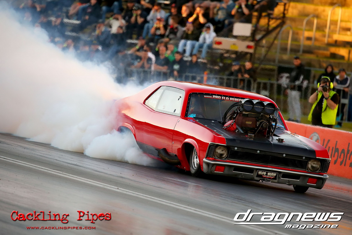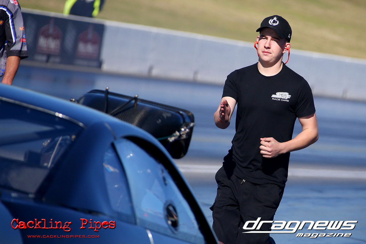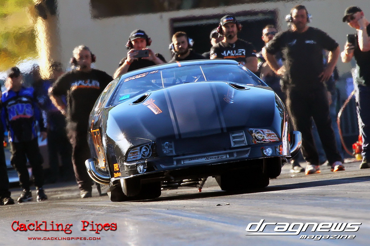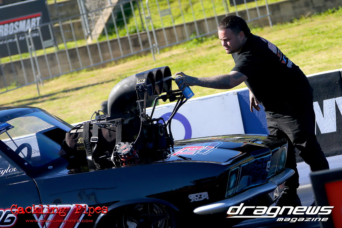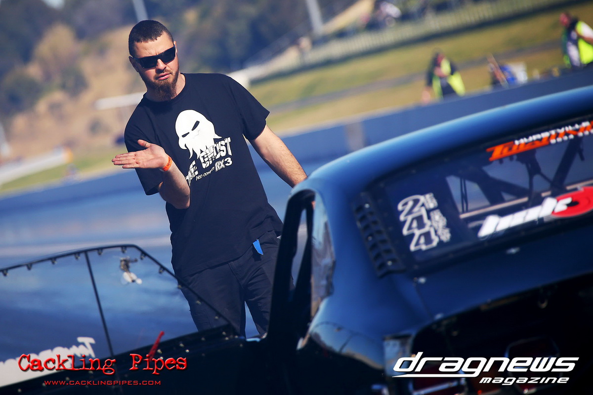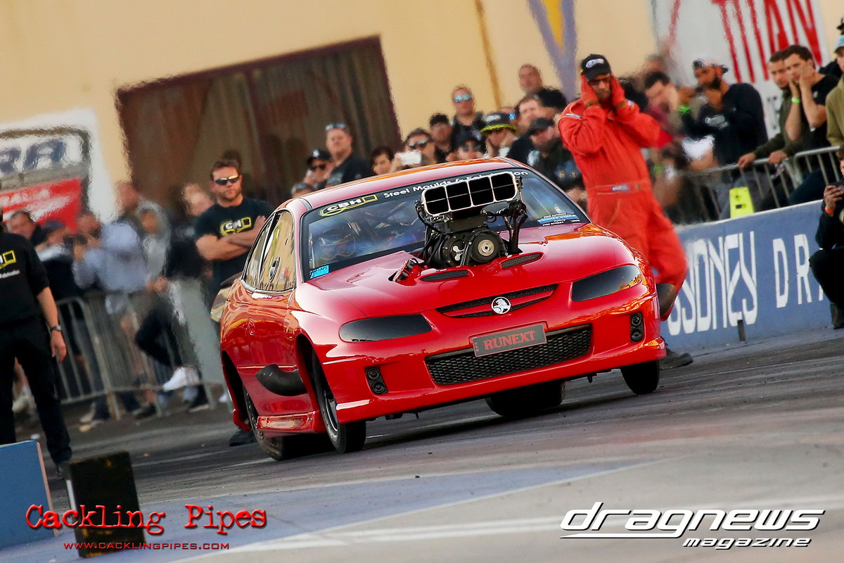 Pro Mod like the rest of brackets left was run over the full distance and on a Chicago Shootout format. In drool-worthy first round match up, Paul Mouhayet drew against Greg ‘Mauler’ Tsakiridis in the former Moits Racing turbo Mustang and the pair did not let the crowd down. Tsakiridis dropped a .021 light on the 400 Thunder Pro Slammer champion but the blown Mustang had rounded up the turbo car quickly before a 272mph top end charge from Tsakiridis pushed ahead for a holeshot 5.63 to 5.61 win. A huge 6.03 PB from Joseph Murina in his Corvette was still no match for Steven Ham’s 5.66, but the crew did not seem to care celebrating the teams best run since buying the former Jeff Wilson doorslammer. Tristan ‘Mincer’ Ockers was subbed in to drive Mick Duggan’s blown Nova and sent it for a 6.36 on a single with Zoran Gajic unable to make the start line in the Gas Racing Mustang.