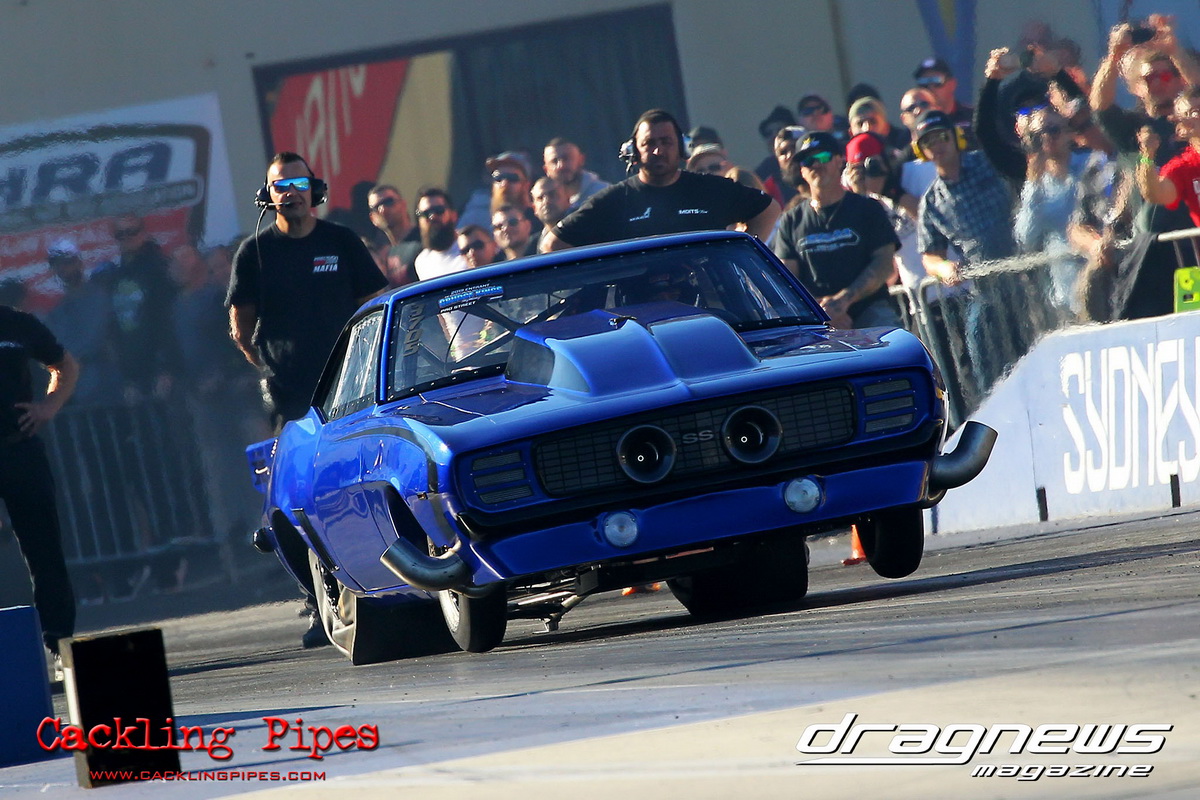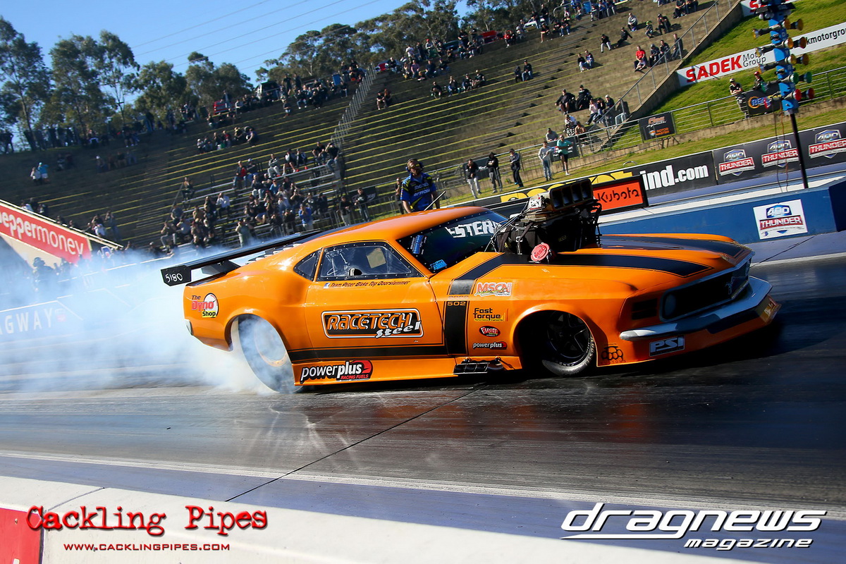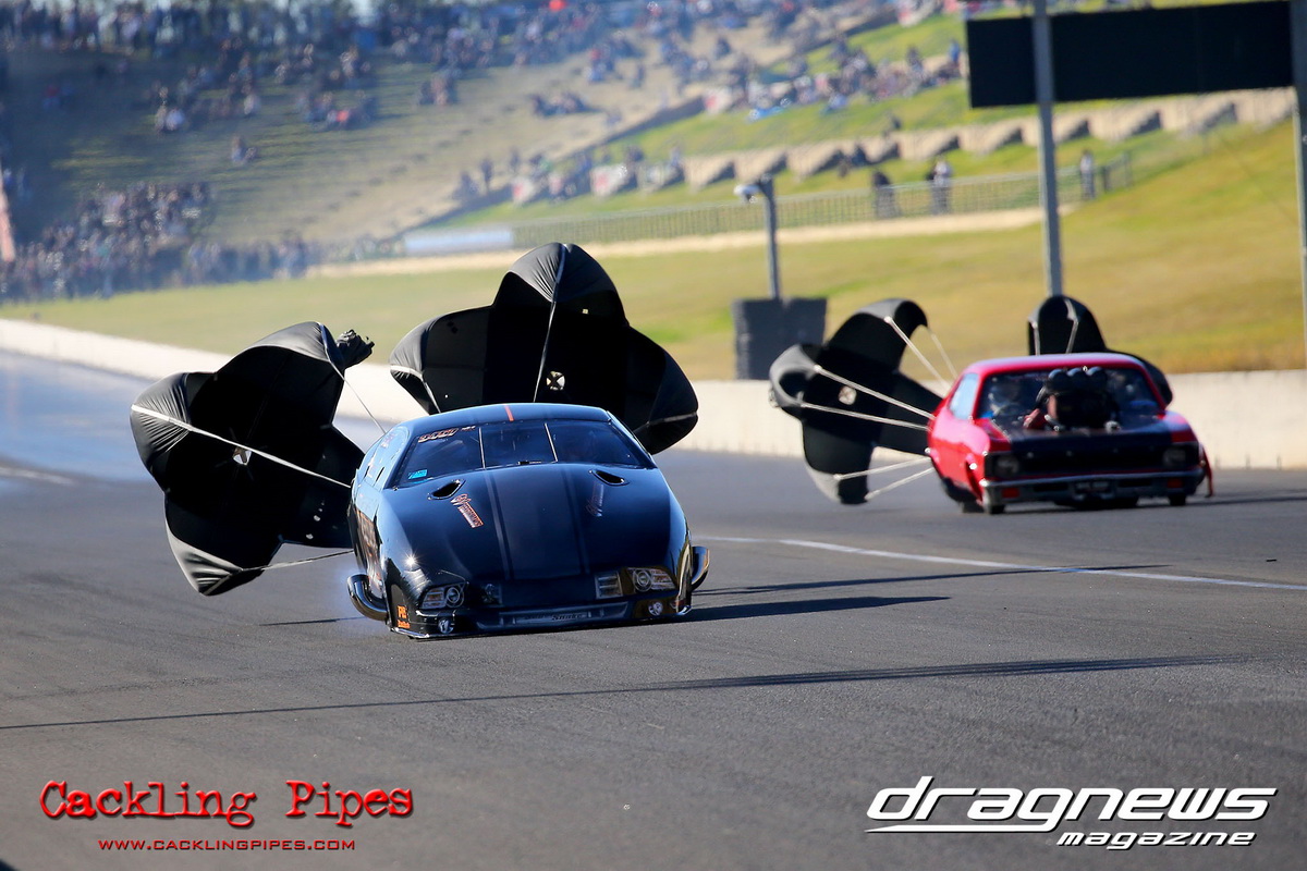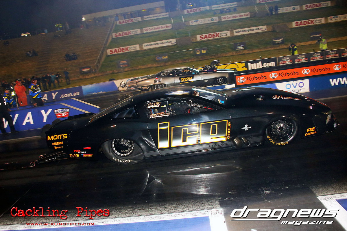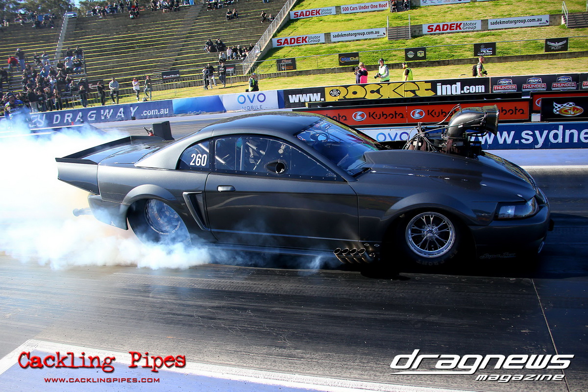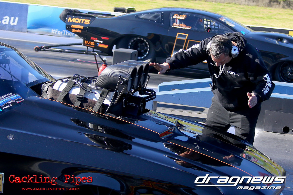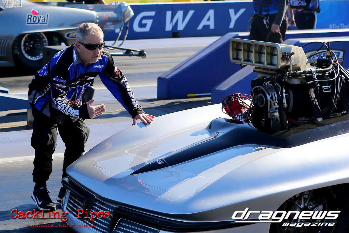 Pro Mod like the rest of brackets left was run over the full distance and on a Chicago Shootout format. In drool-worthy first round match up, Paul Mouhayet drew against Greg ‘Mauler’ Tsakiridis in the former Moits Racing turbo Mustang and the pair did not let the crowd down. Tsakiridis dropped a .021 light on the 400 Thunder Pro Slammer champion but the blown Mustang had rounded up the turbo car quickly before a 272mph top end charge from Tsakiridis pushed ahead for a holeshot 5.63 to 5.61 win. A huge 6.03 PB from Joseph Murina in his Corvette was still no match for Steven Ham’s 5.66, but the crew did not seem to care celebrating the teams best run since buying the former Jeff Wilson doorslammer. Tristan ‘Mincer’ Ockers was subbed in to drive Mick Duggan’s blown Nova and sent it for a 6.36 on a single with Zoran Gajic unable to make the start line in the Gas Racing Mustang.