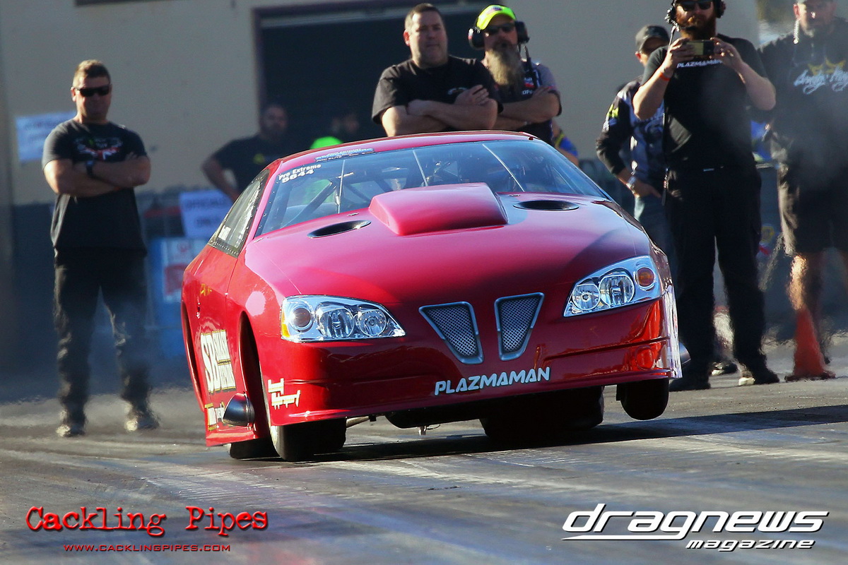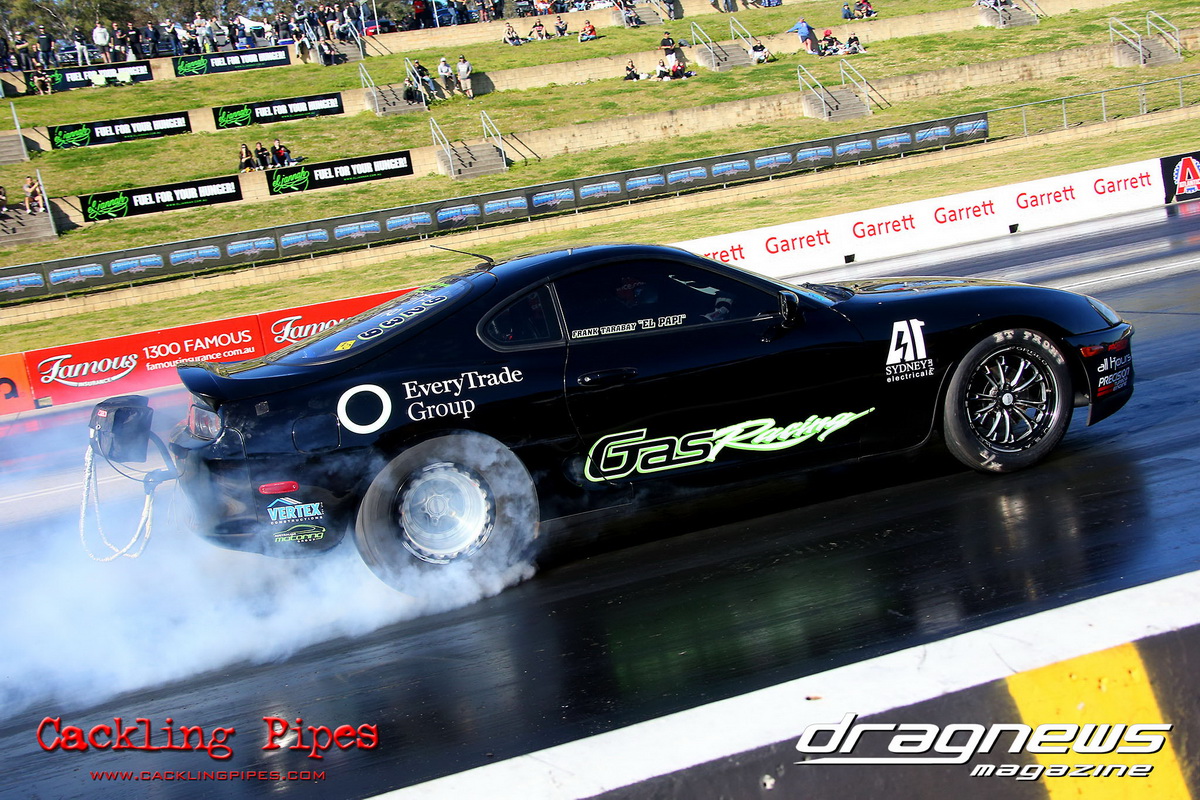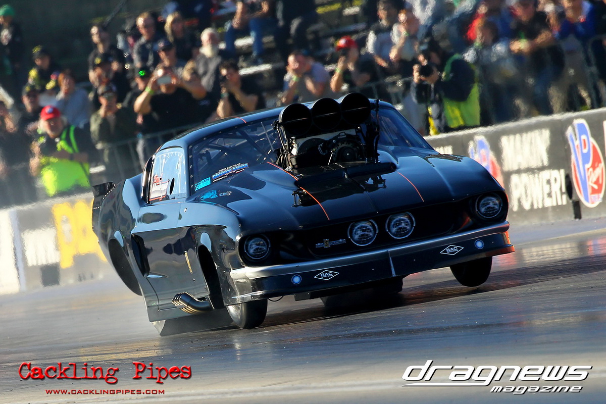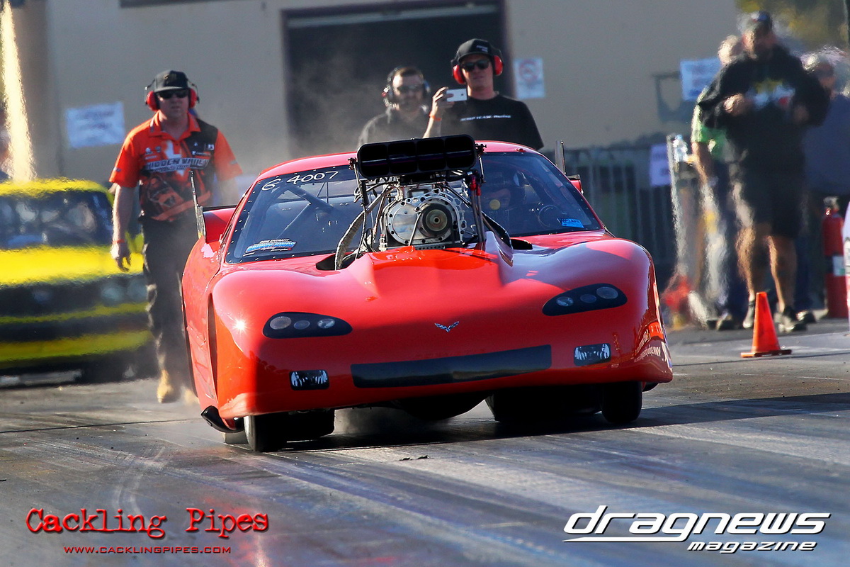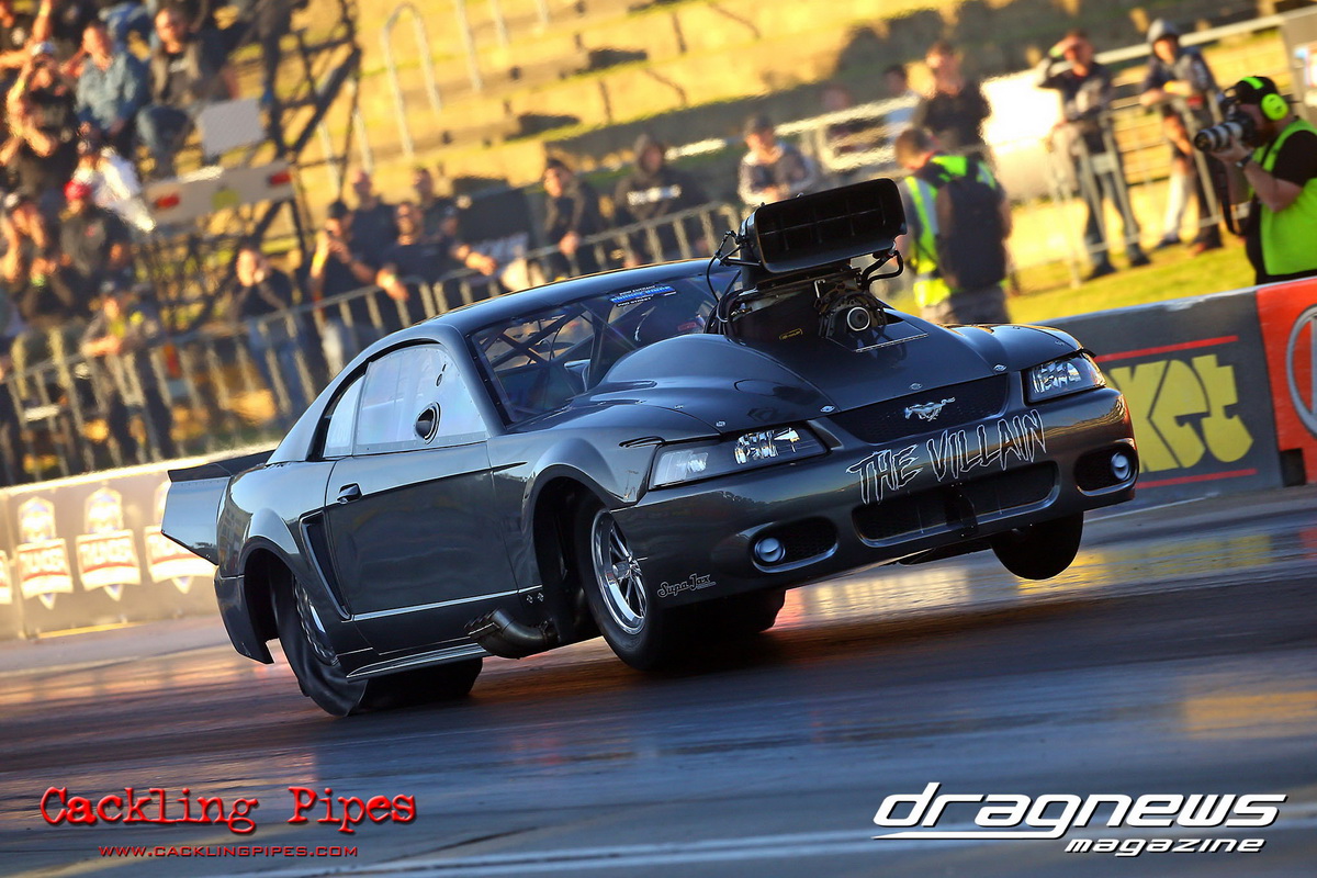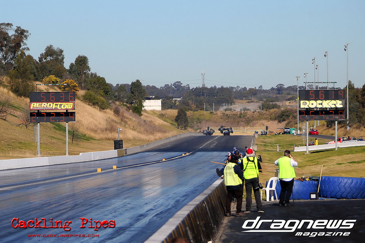 Pro Mod like the rest of brackets left was run over the full distance and on a Chicago Shootout format. In drool-worthy first round match up, Paul Mouhayet drew against Greg ‘Mauler’ Tsakiridis in the former Moits Racing turbo Mustang and the pair did not let the crowd down. Tsakiridis dropped a .021 light on the 400 Thunder Pro Slammer champion but the blown Mustang had rounded up the turbo car quickly before a 272mph top end charge from Tsakiridis pushed ahead for a holeshot 5.63 to 5.61 win. A huge 6.03 PB from Joseph Murina in his Corvette was still no match for Steven Ham’s 5.66, but the crew did not seem to care celebrating the teams best run since buying the former Jeff Wilson doorslammer. Tristan ‘Mincer’ Ockers was subbed in to drive Mick Duggan’s blown Nova and sent it for a 6.36 on a single with Zoran Gajic unable to make the start line in the Gas Racing Mustang.
