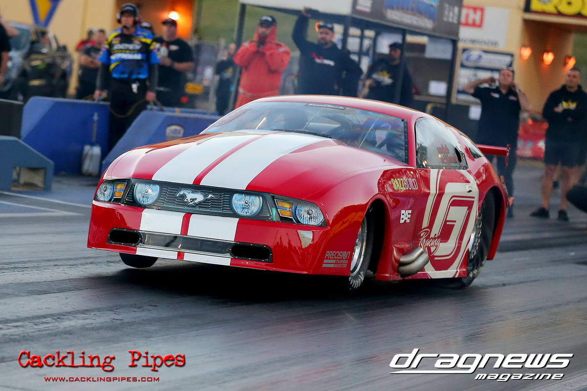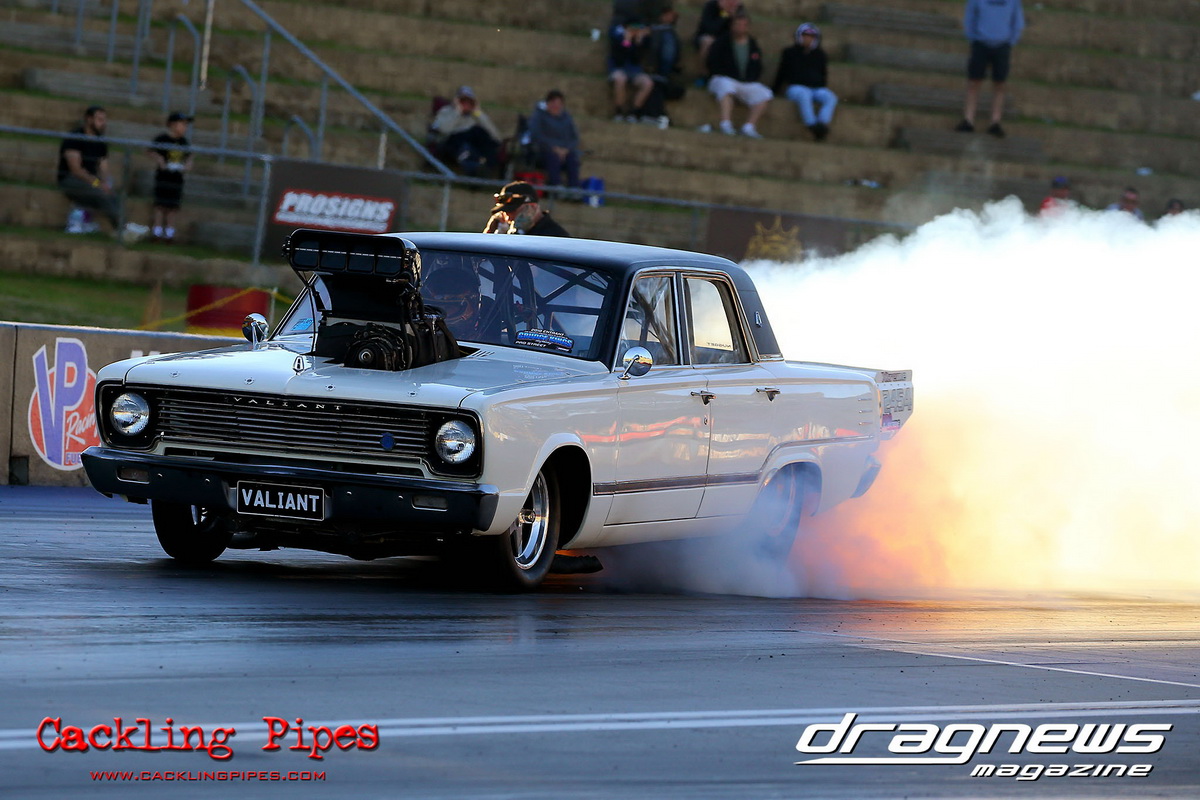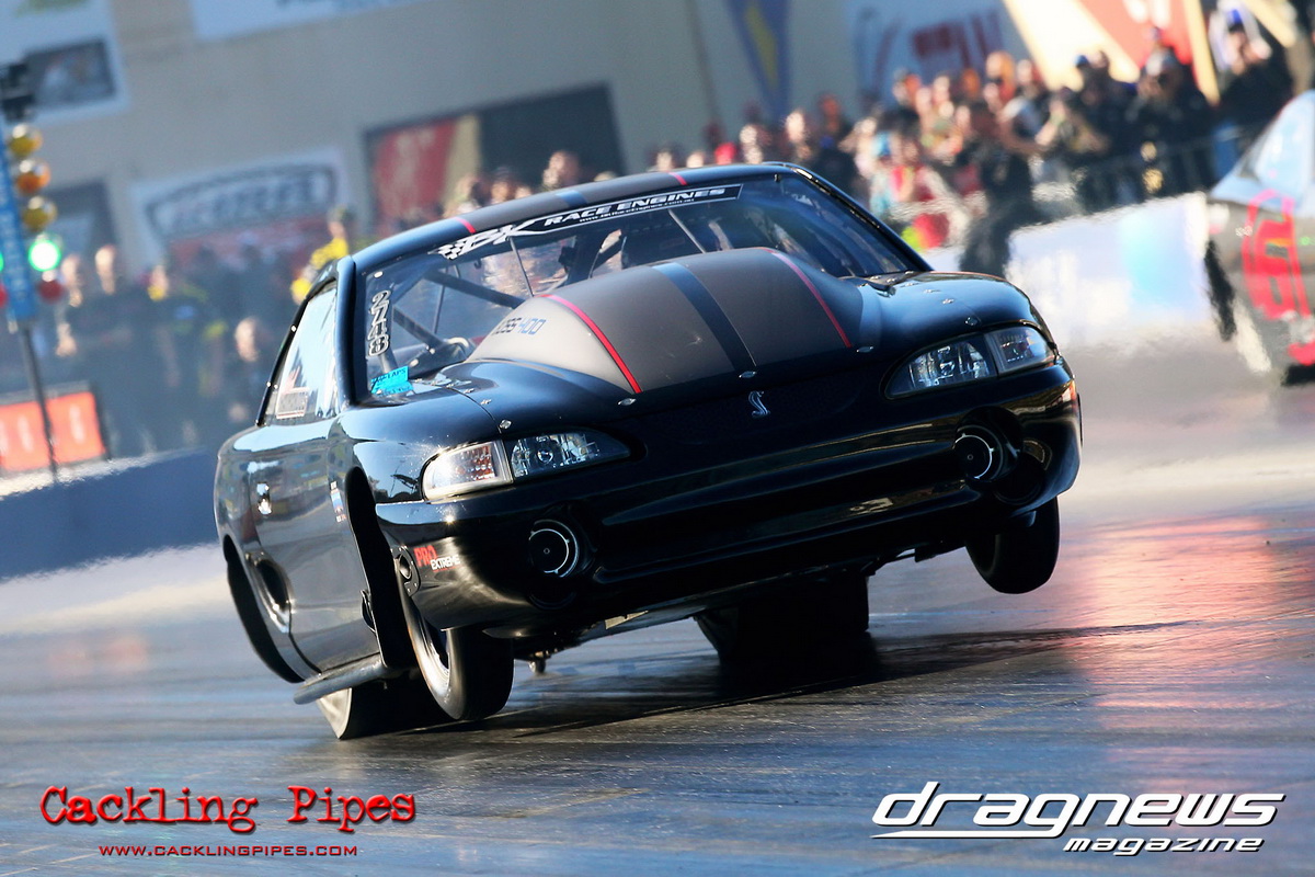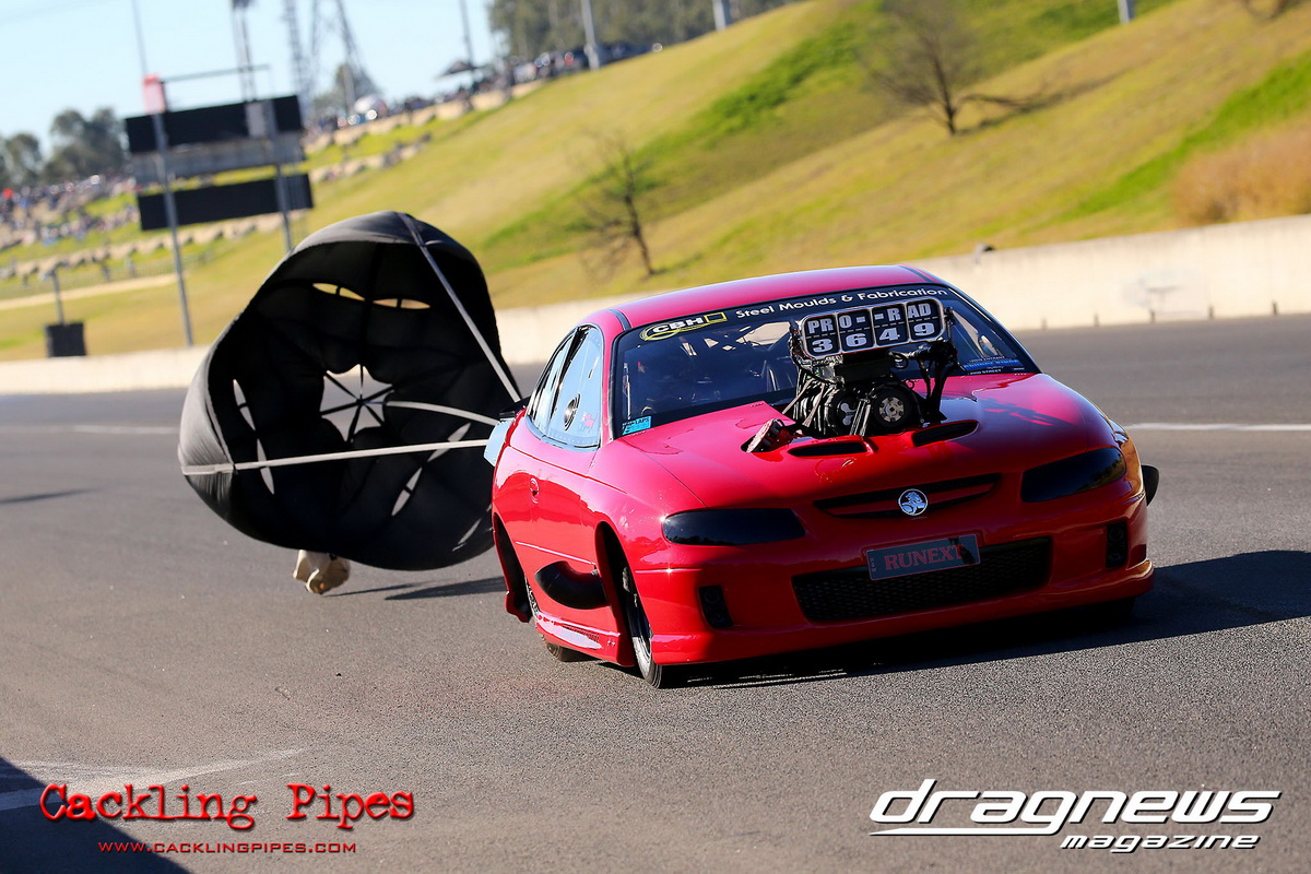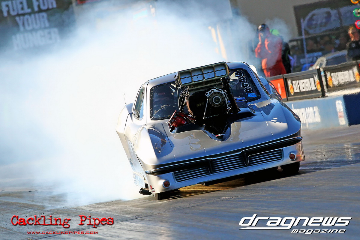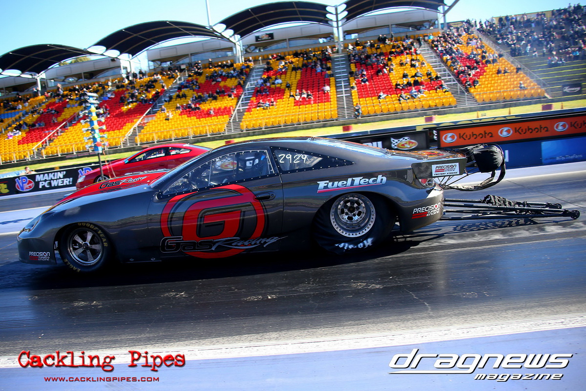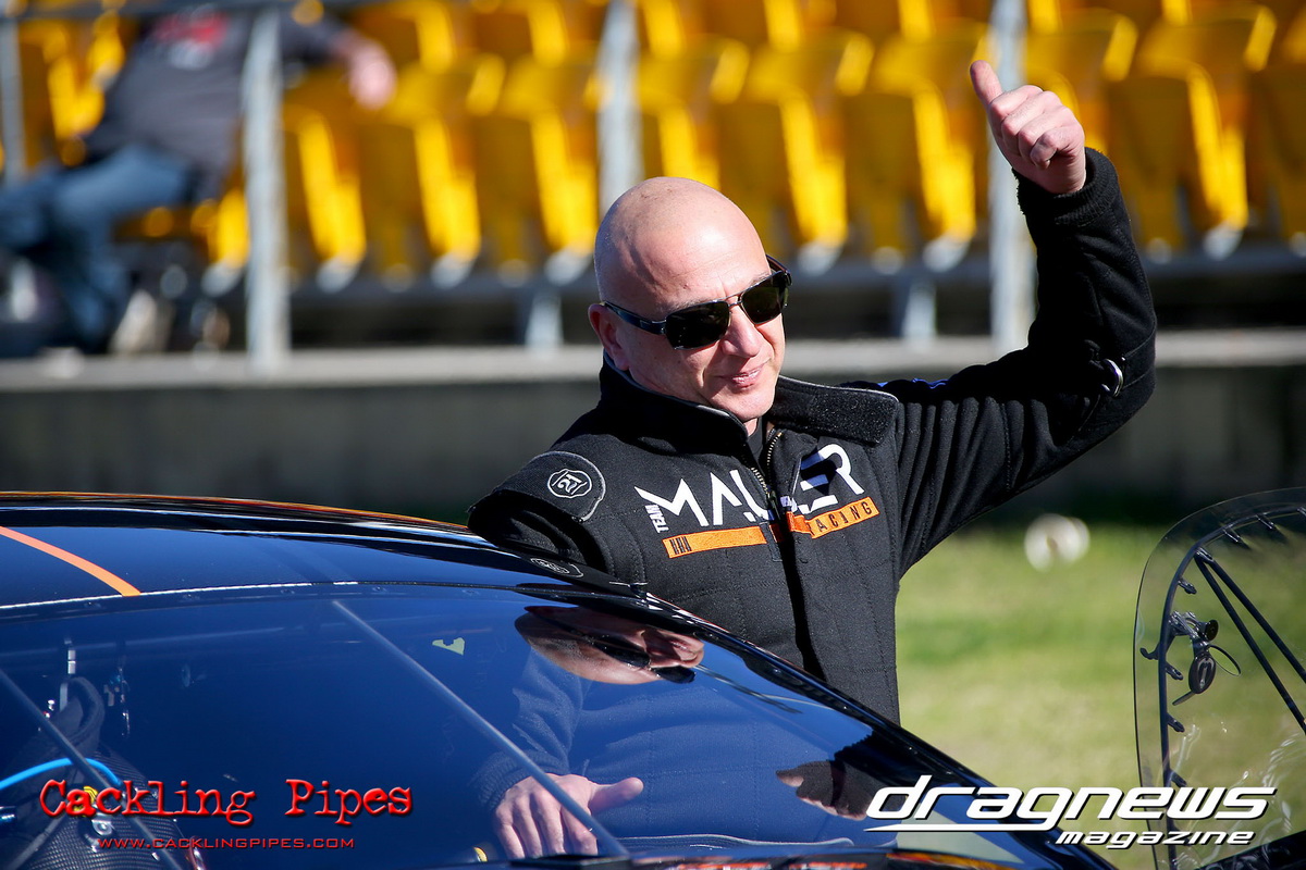 Pro Mod like the rest of brackets left was run over the full distance and on a Chicago Shootout format. In drool-worthy first round match up, Paul Mouhayet drew against Greg ‘Mauler’ Tsakiridis in the former Moits Racing turbo Mustang and the pair did not let the crowd down. Tsakiridis dropped a .021 light on the 400 Thunder Pro Slammer champion but the blown Mustang had rounded up the turbo car quickly before a 272mph top end charge from Tsakiridis pushed ahead for a holeshot 5.63 to 5.61 win. A huge 6.03 PB from Joseph Murina in his Corvette was still no match for Steven Ham’s 5.66, but the crew did not seem to care celebrating the teams best run since buying the former Jeff Wilson doorslammer. Tristan ‘Mincer’ Ockers was subbed in to drive Mick Duggan’s blown Nova and sent it for a 6.36 on a single with Zoran Gajic unable to make the start line in the Gas Racing Mustang.