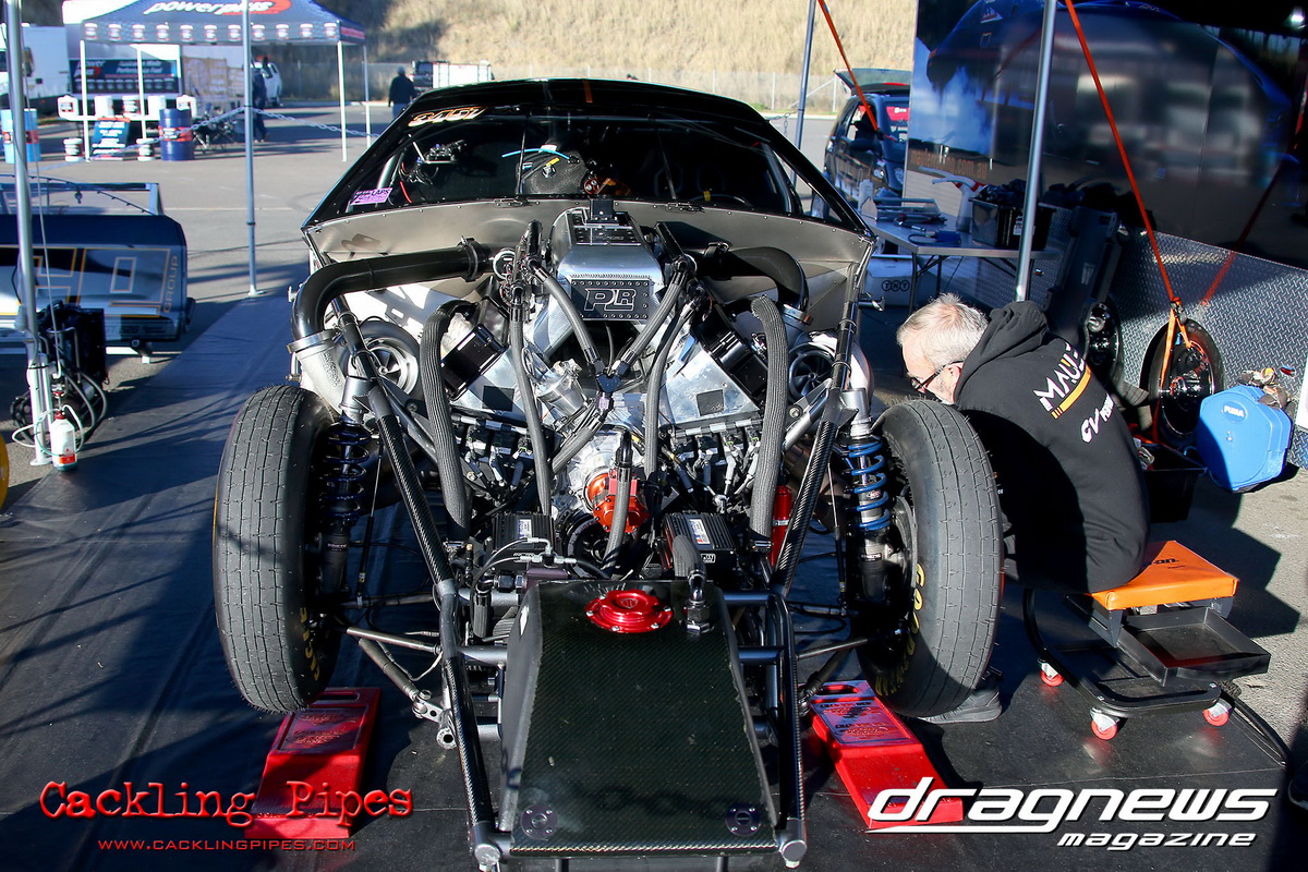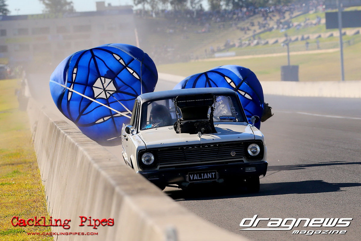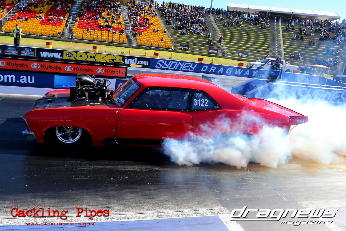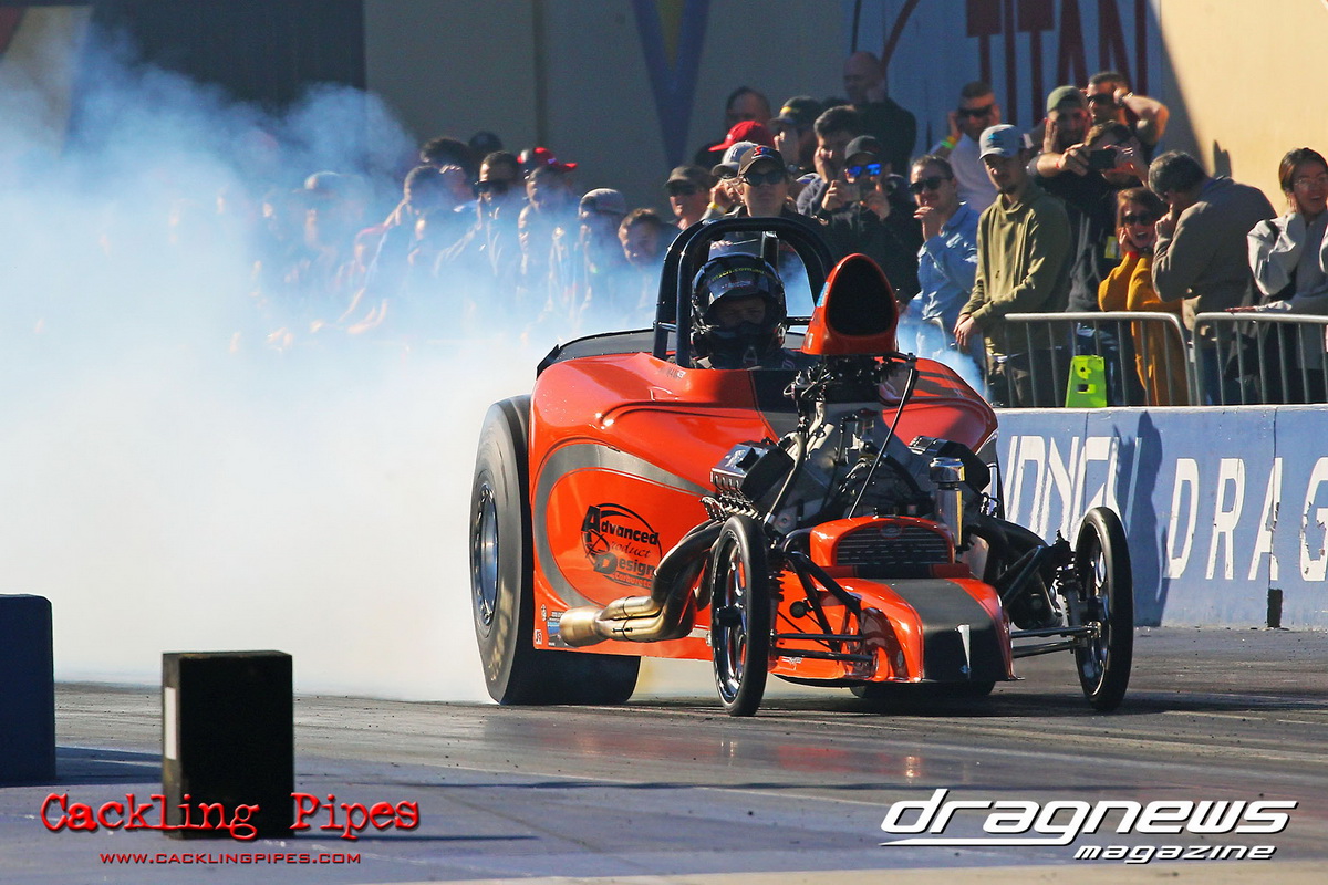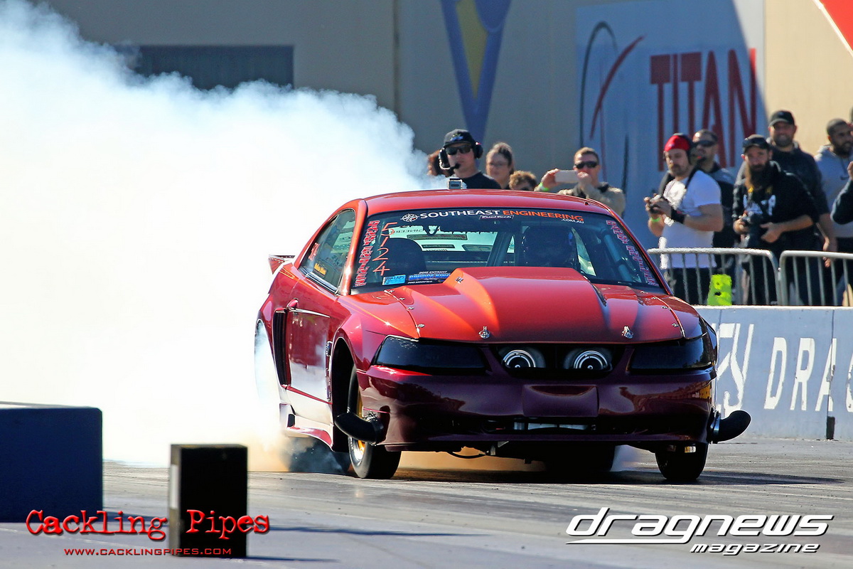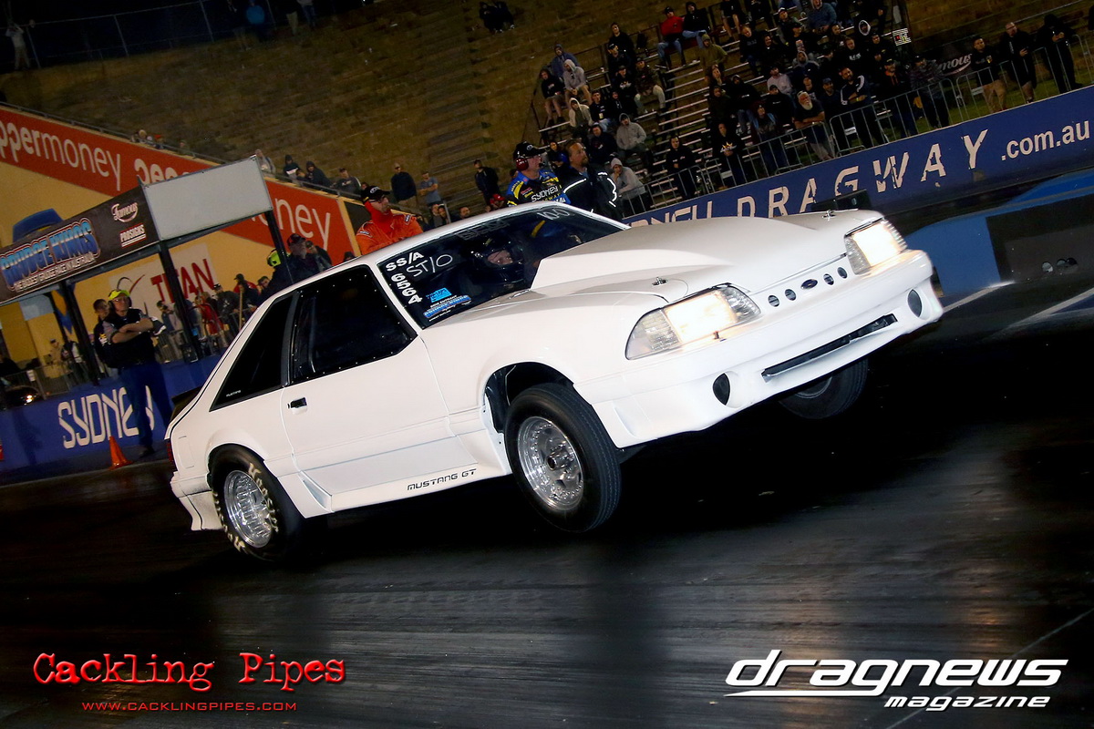 Pro Mod like the rest of brackets left was run over the full distance and on a Chicago Shootout format. In drool-worthy first round match up, Paul Mouhayet drew against Greg ‘Mauler’ Tsakiridis in the former Moits Racing turbo Mustang and the pair did not let the crowd down. Tsakiridis dropped a .021 light on the 400 Thunder Pro Slammer champion but the blown Mustang had rounded up the turbo car quickly before a 272mph top end charge from Tsakiridis pushed ahead for a holeshot 5.63 to 5.61 win. A huge 6.03 PB from Joseph Murina in his Corvette was still no match for Steven Ham’s 5.66, but the crew did not seem to care celebrating the teams best run since buying the former Jeff Wilson doorslammer. Tristan ‘Mincer’ Ockers was subbed in to drive Mick Duggan’s blown Nova and sent it for a 6.36 on a single with Zoran Gajic unable to make the start line in the Gas Racing Mustang.
