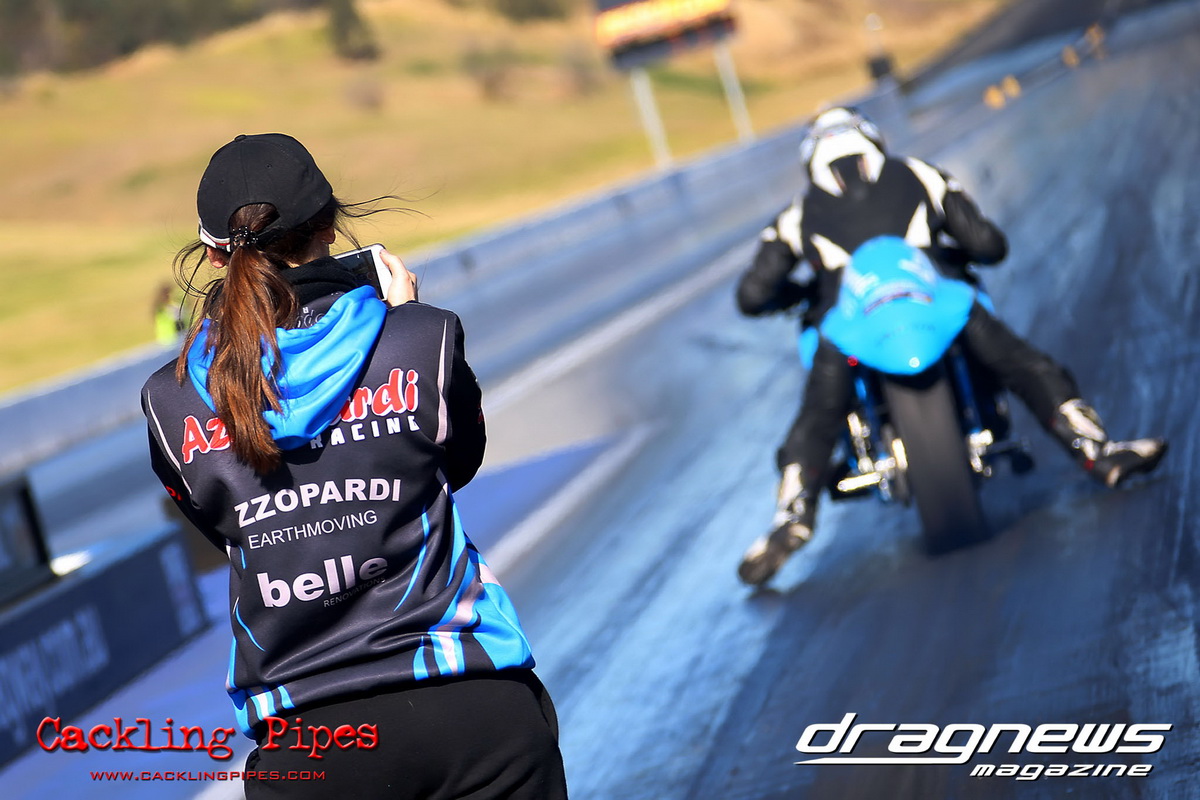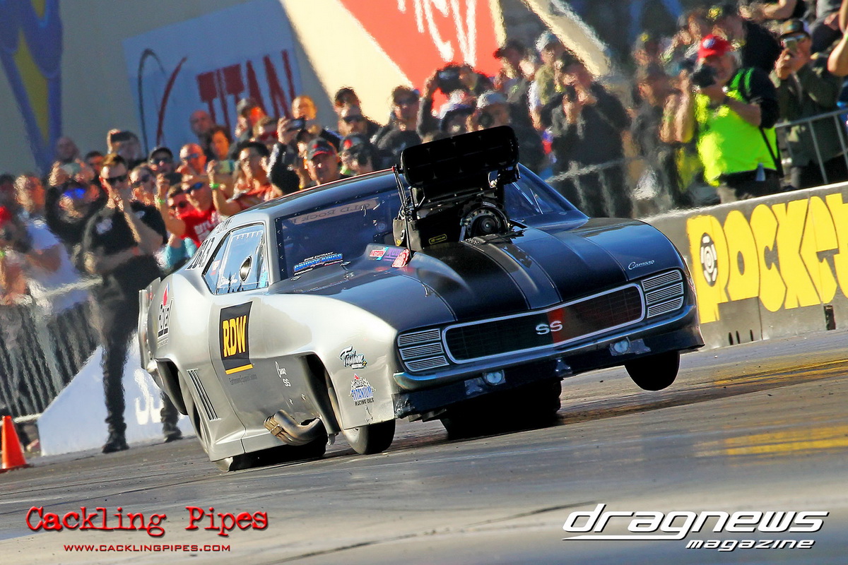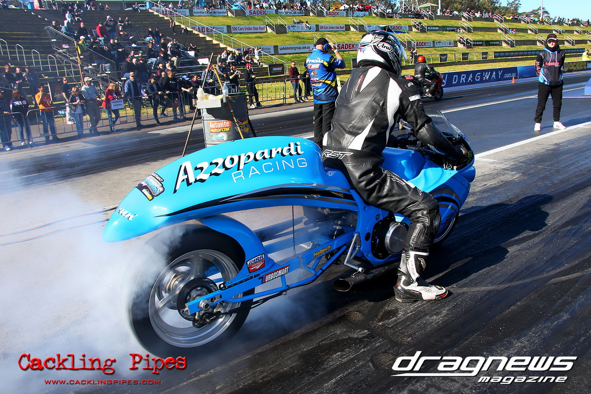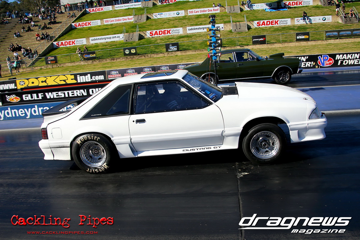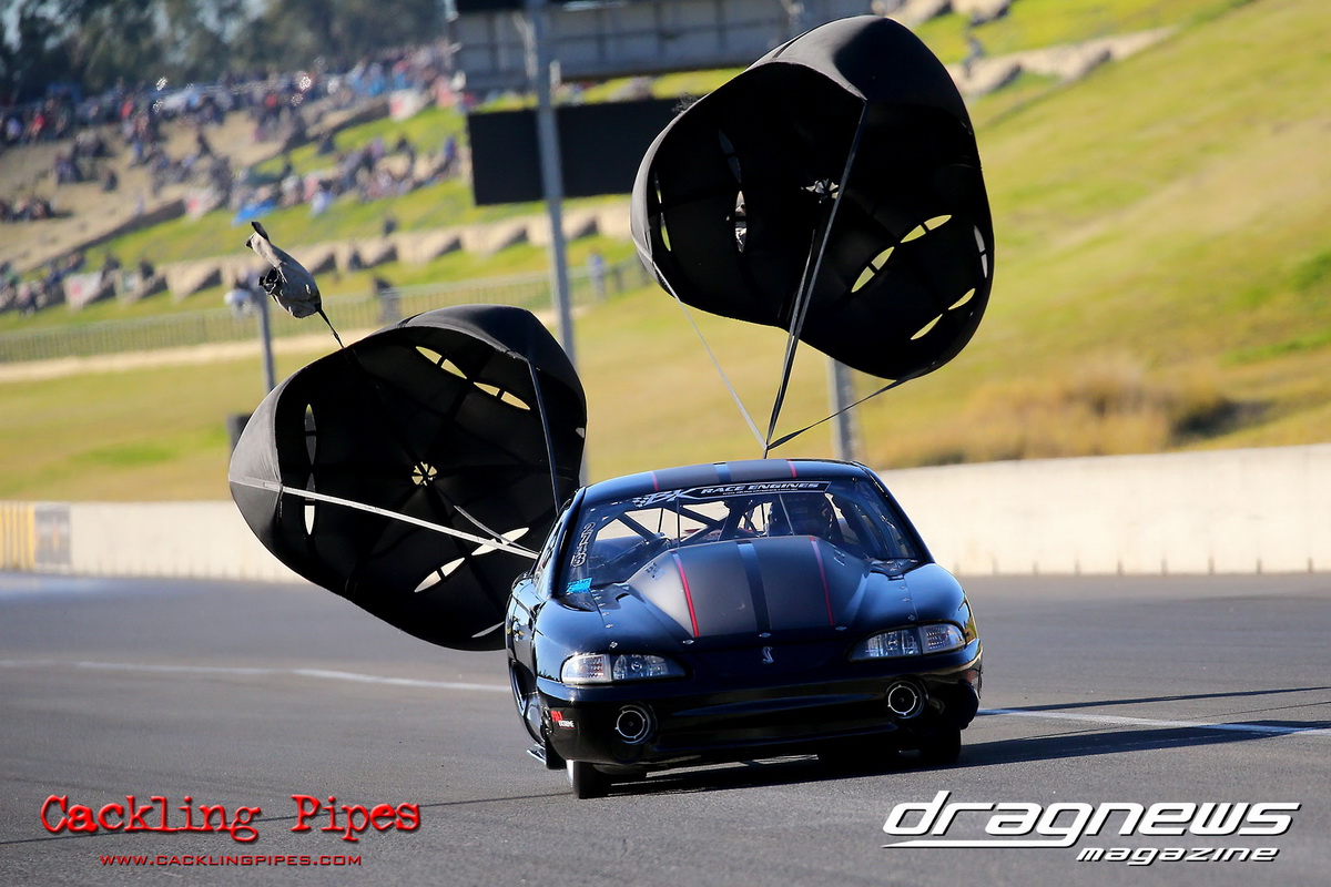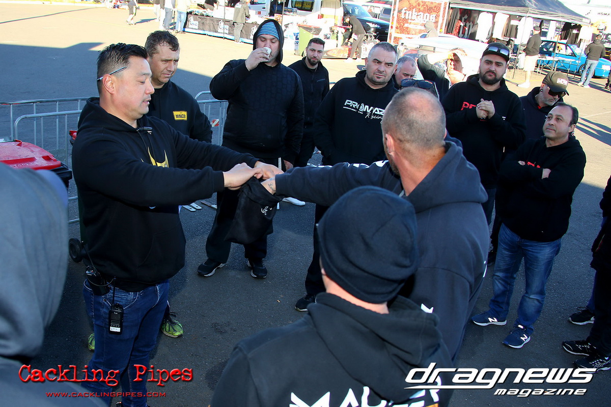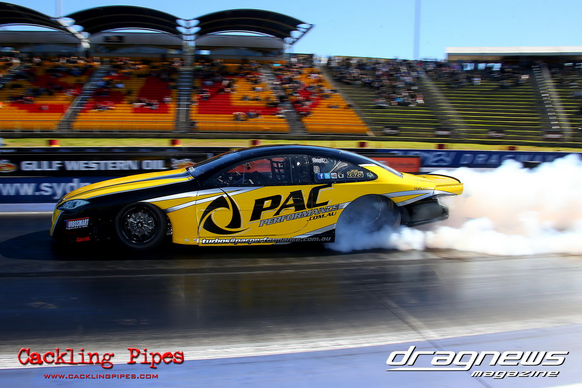 Pro Mod like the rest of brackets left was run over the full distance and on a Chicago Shootout format. In drool-worthy first round match up, Paul Mouhayet drew against Greg ‘Mauler’ Tsakiridis in the former Moits Racing turbo Mustang and the pair did not let the crowd down. Tsakiridis dropped a .021 light on the 400 Thunder Pro Slammer champion but the blown Mustang had rounded up the turbo car quickly before a 272mph top end charge from Tsakiridis pushed ahead for a holeshot 5.63 to 5.61 win. A huge 6.03 PB from Joseph Murina in his Corvette was still no match for Steven Ham’s 5.66, but the crew did not seem to care celebrating the teams best run since buying the former Jeff Wilson doorslammer. Tristan ‘Mincer’ Ockers was subbed in to drive Mick Duggan’s blown Nova and sent it for a 6.36 on a single with Zoran Gajic unable to make the start line in the Gas Racing Mustang.