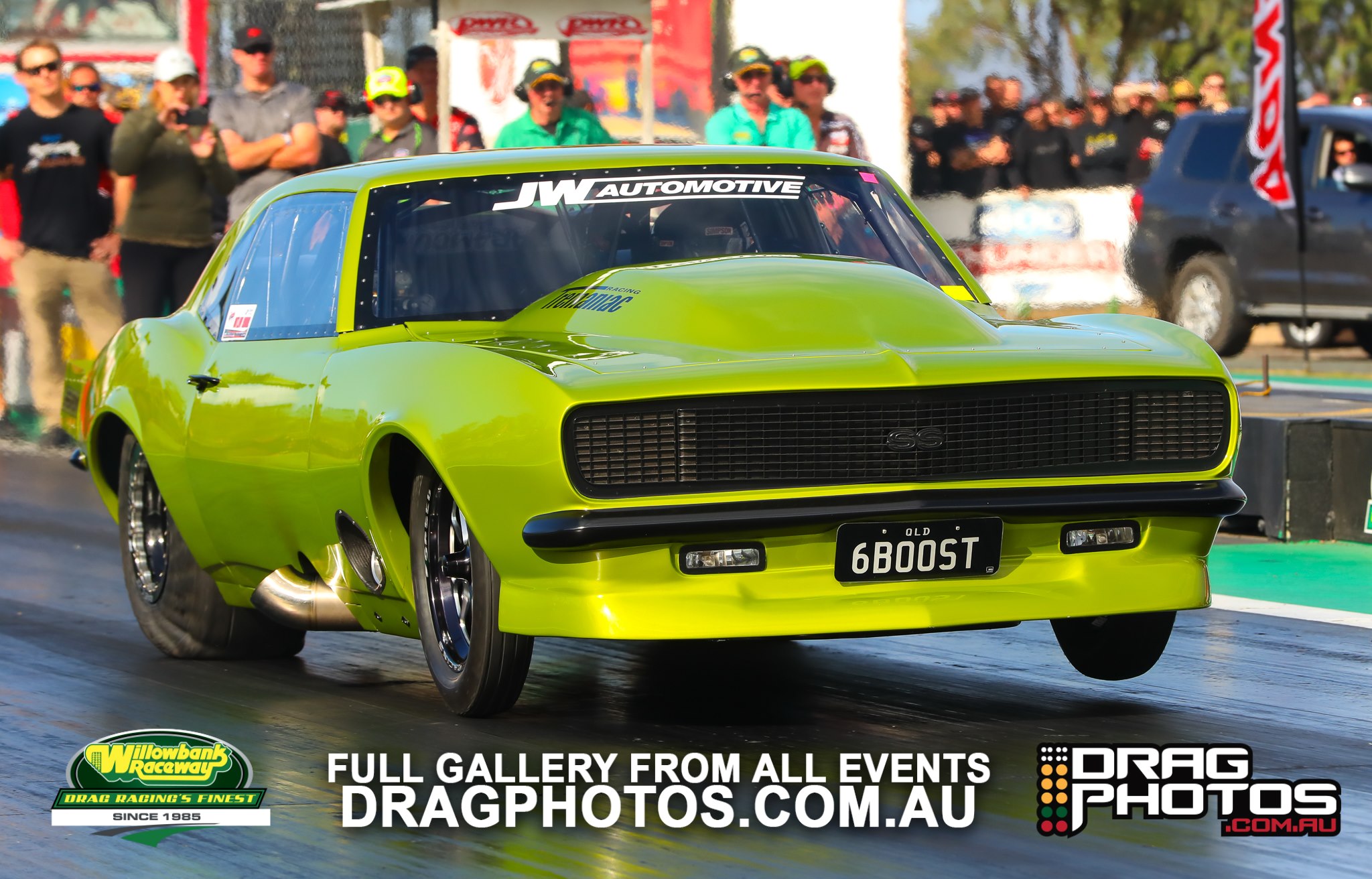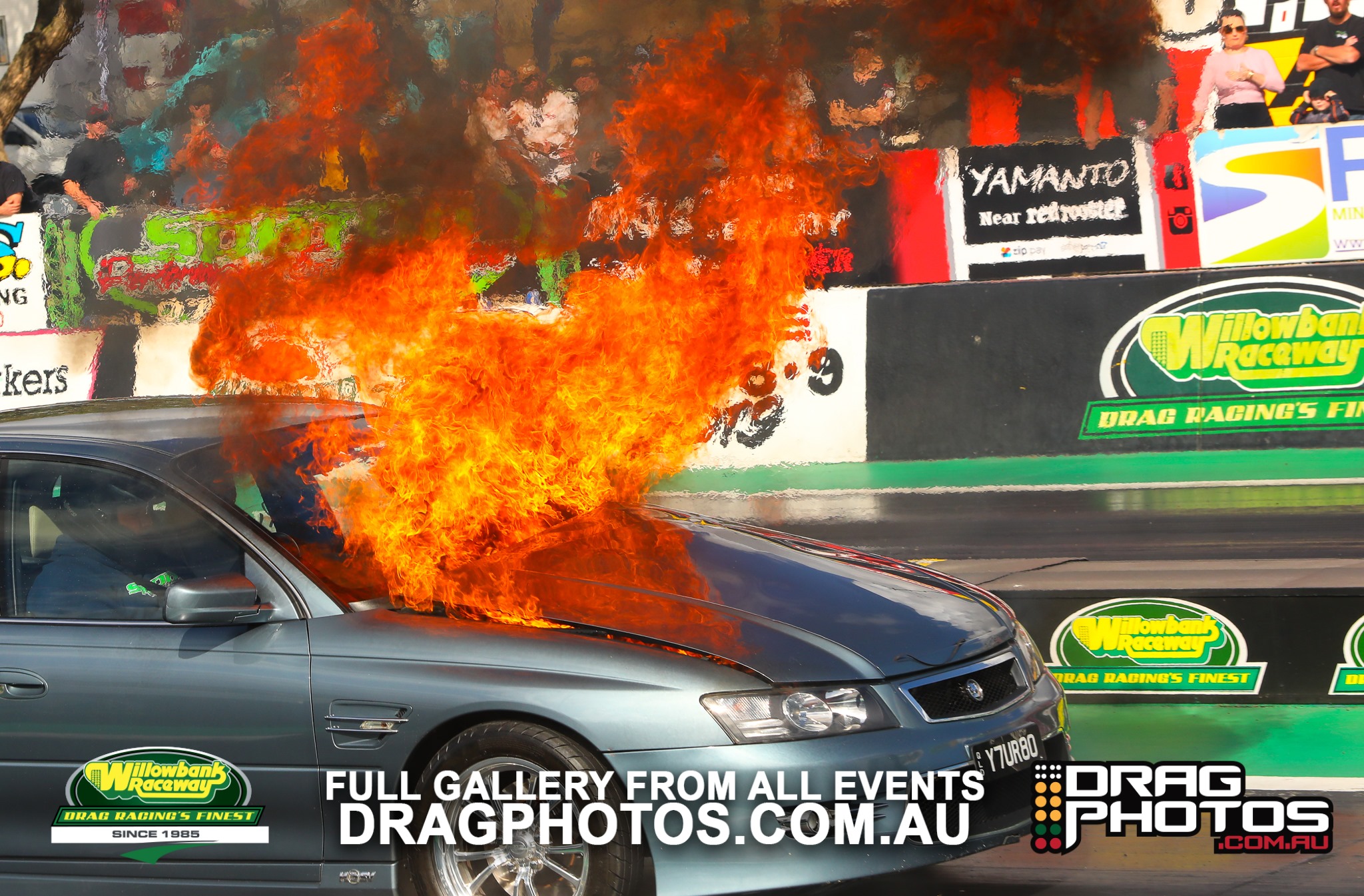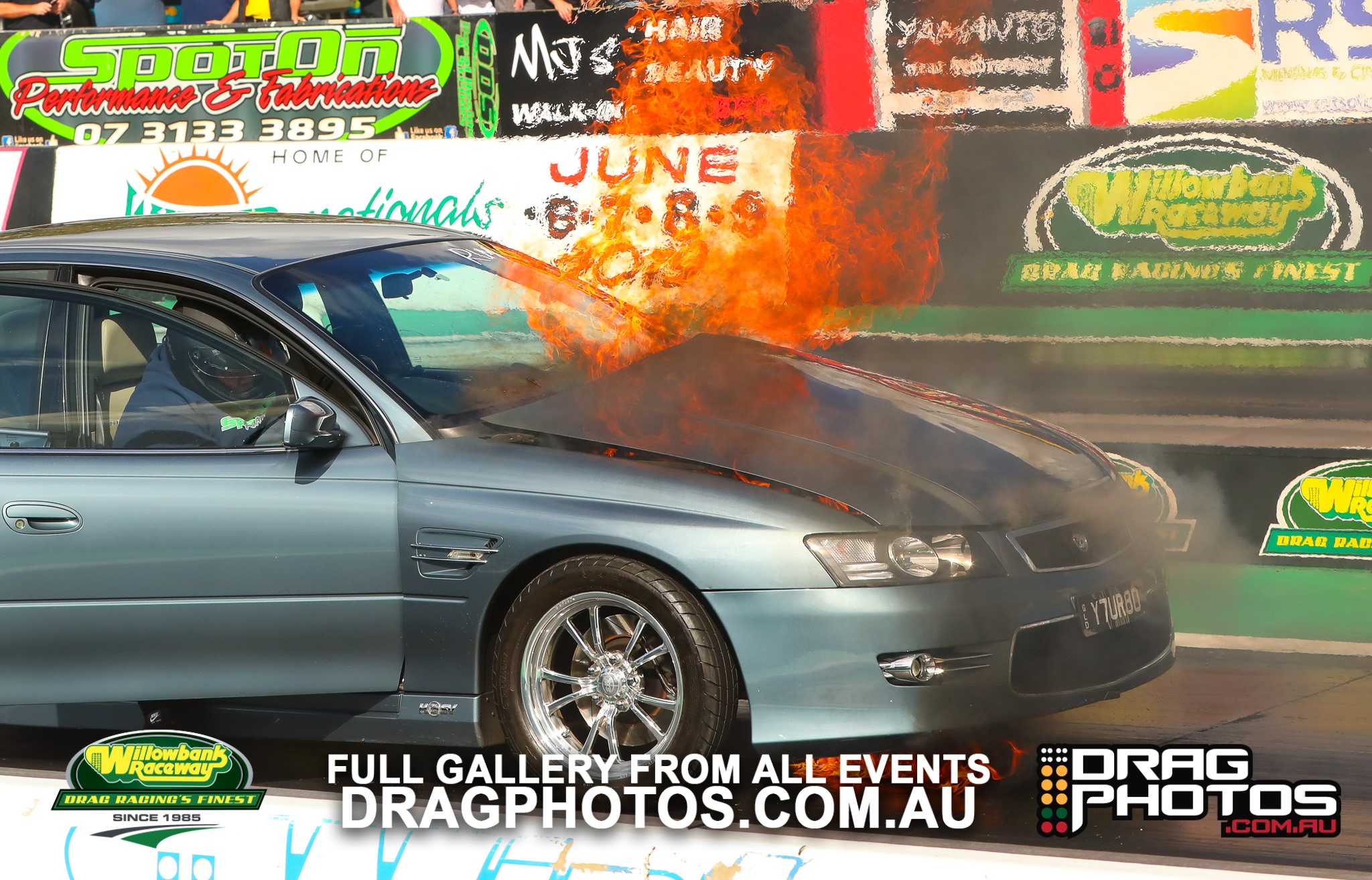 The day delivered plenty of spectacular moments. Tim Goodwin’s nitrous backfire left his Holden Commodore a little scorched.
