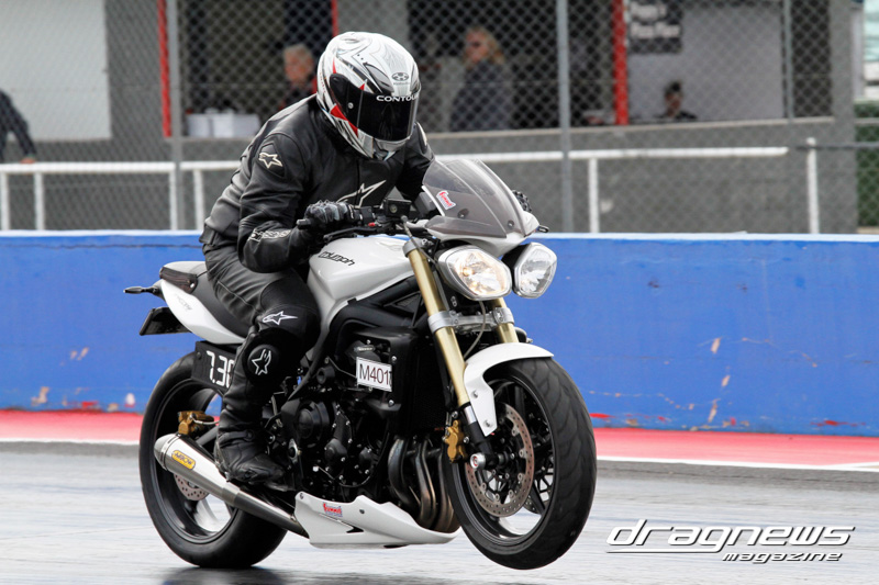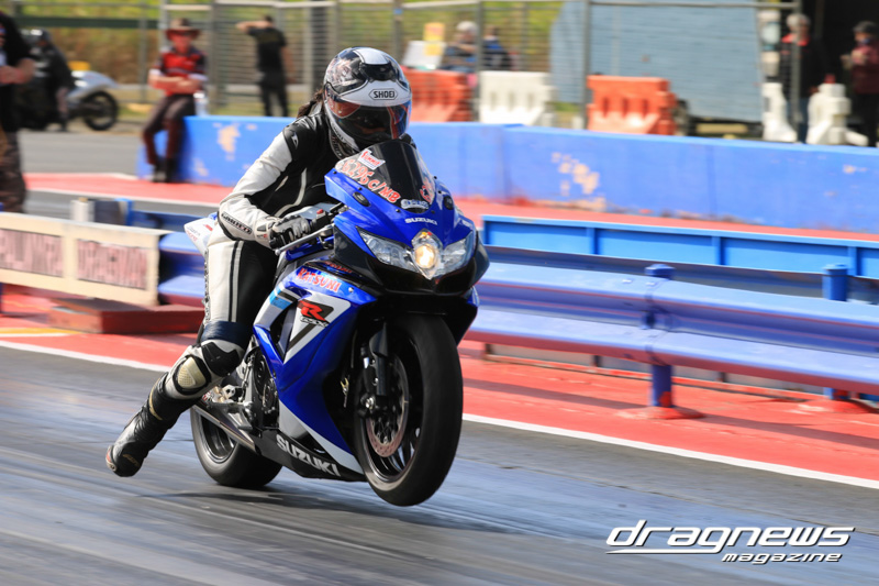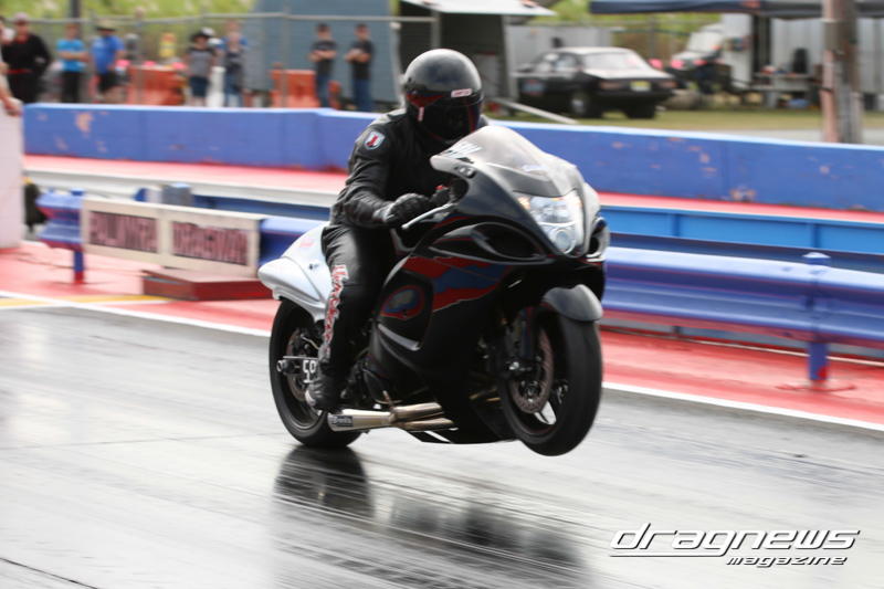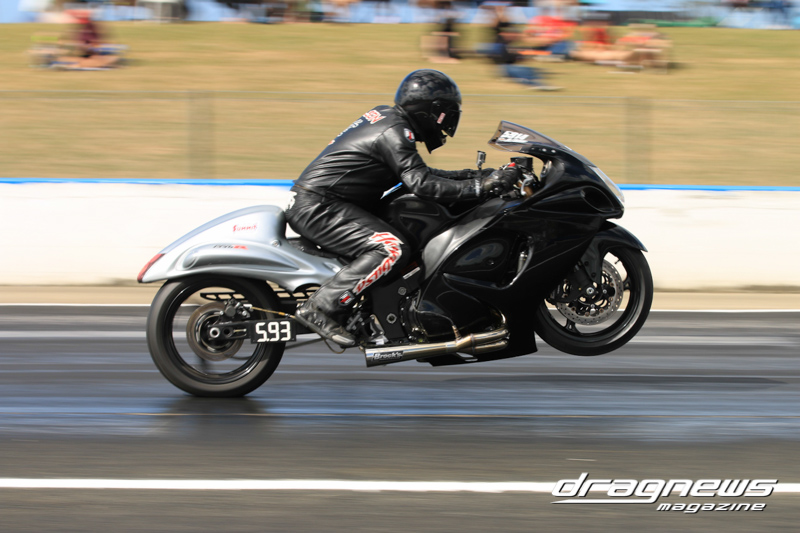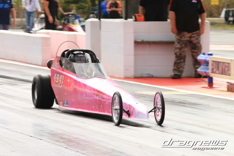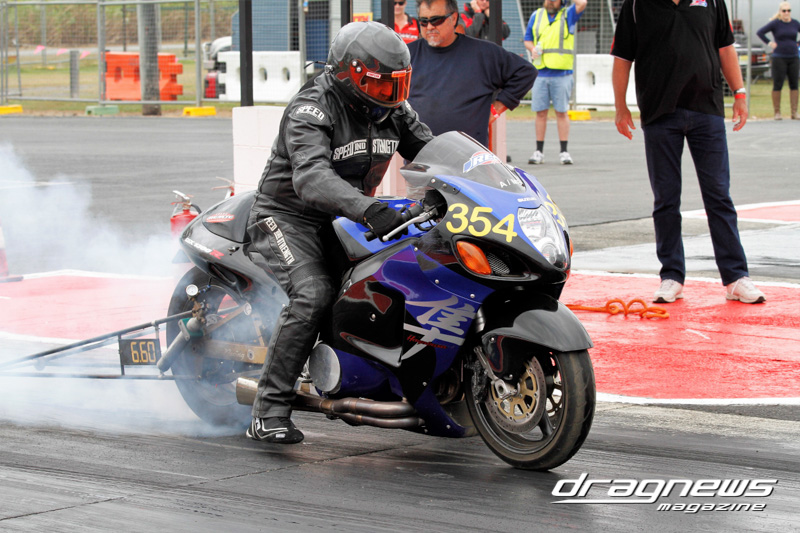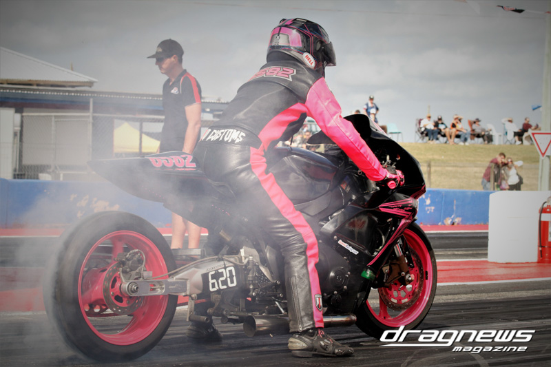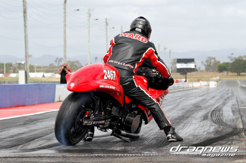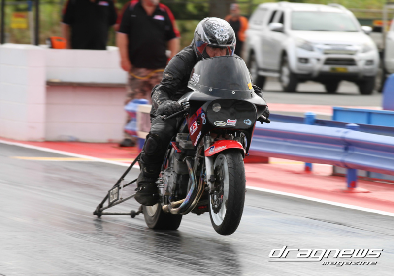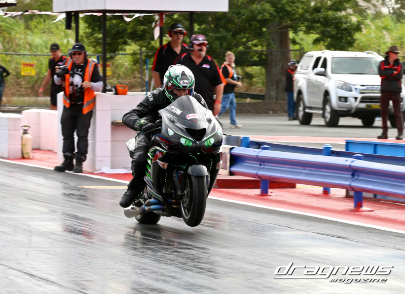 After qualifying in Modified Bike, Reegan Ward from Gladstone, Queensland sat at No.1 with a 5.44 ET on his Suzuki Hayabusa. He was certainly a fan favourite with some wild wheelies over the weekend. Meeting up in the final was Ross Bryant and Russell Bell. On the green Bell (above) had the better reaction and went on to take the win with a .052 over 5.902 to a breaking out .056 under 6.214 on a 6.27 D-I.