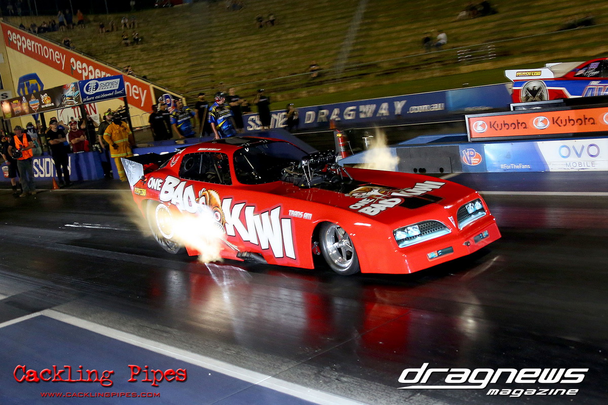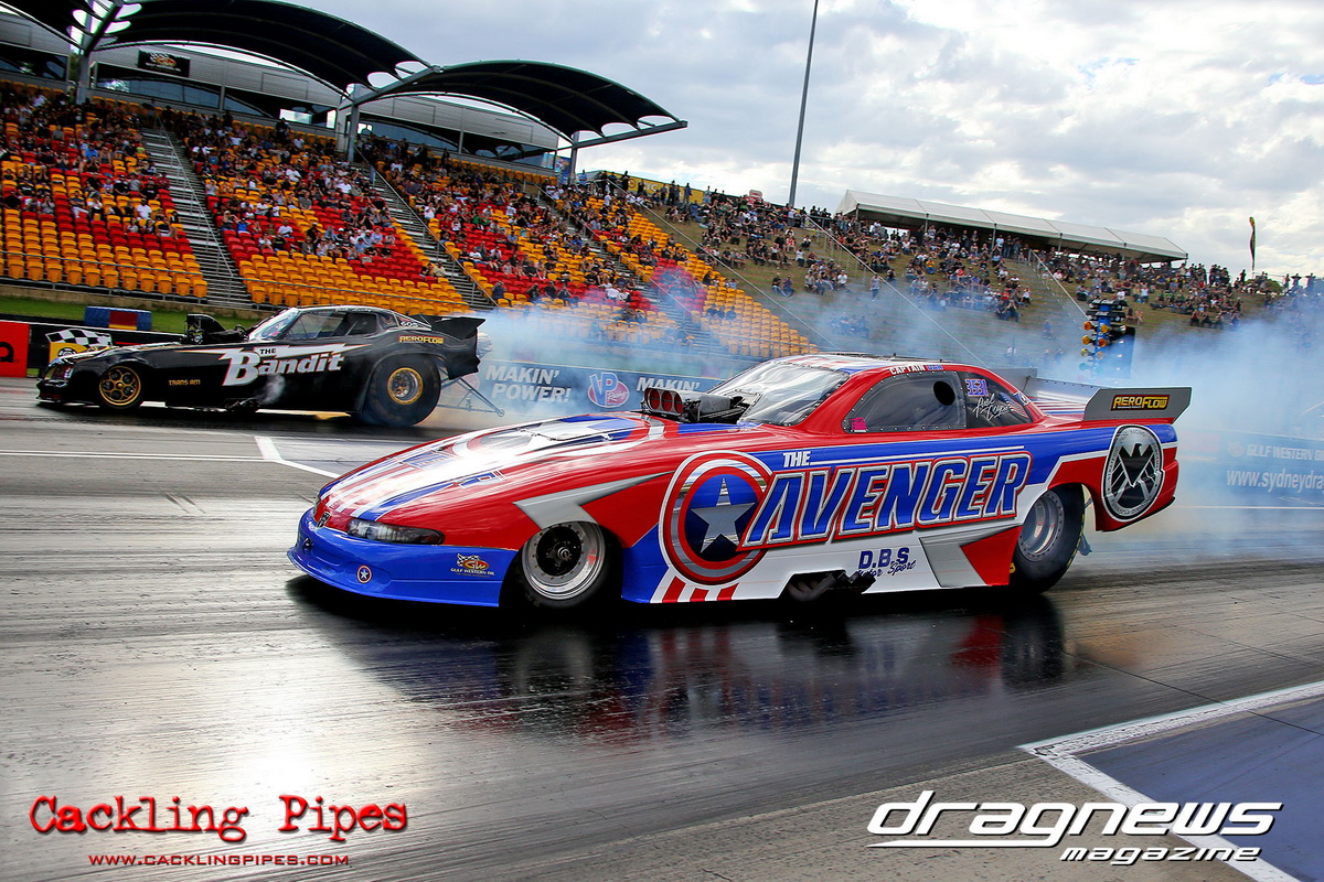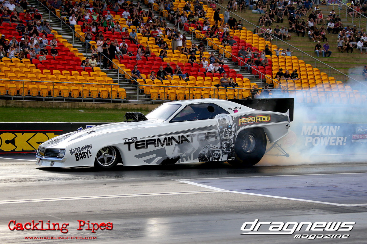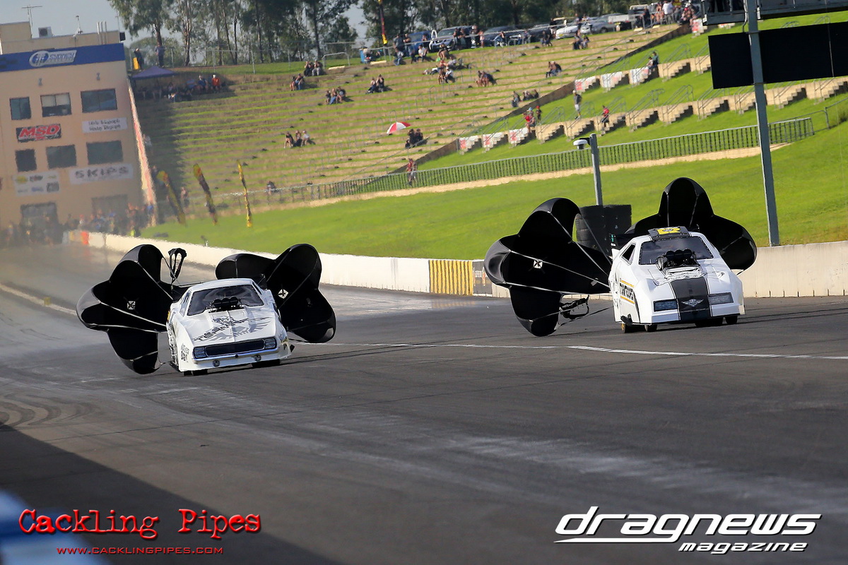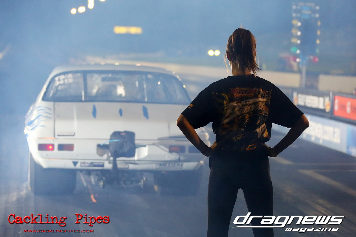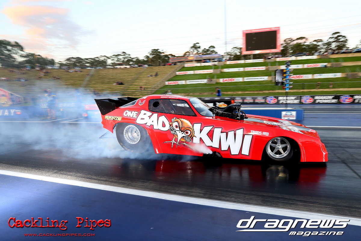 Dark Horse dropped a consistent 5.67 on Red Devil’s 5.73. Let’s Boogie decided it wanted to do a tyre smoke dance on the start line for Emma and she was easily “terminated” by Walshe with a 5.62. McMillin’s One Bad Kiwi took out the other Begley with LA Hooker’s 5.64 coming up short against the Kiwi’s 5.57. The Bandit won out in the Leahy family dual 5.58 to 5.67 against Storm Trooper and the round finished with an unlucky 5.54 from Avenger being trumped by a 5.51 from Nitro Express in one of the quickest side by side Aeroflow Outlaw Nitro Funny Car passes ever.