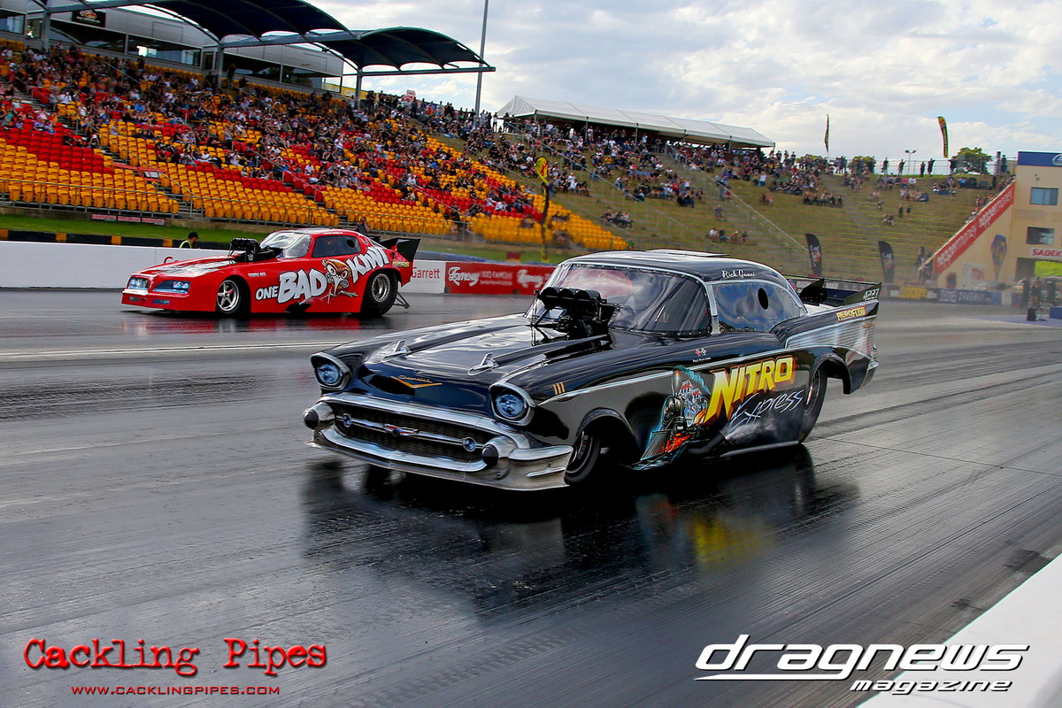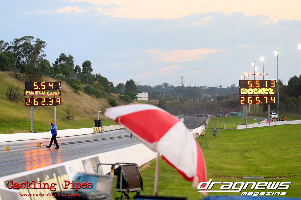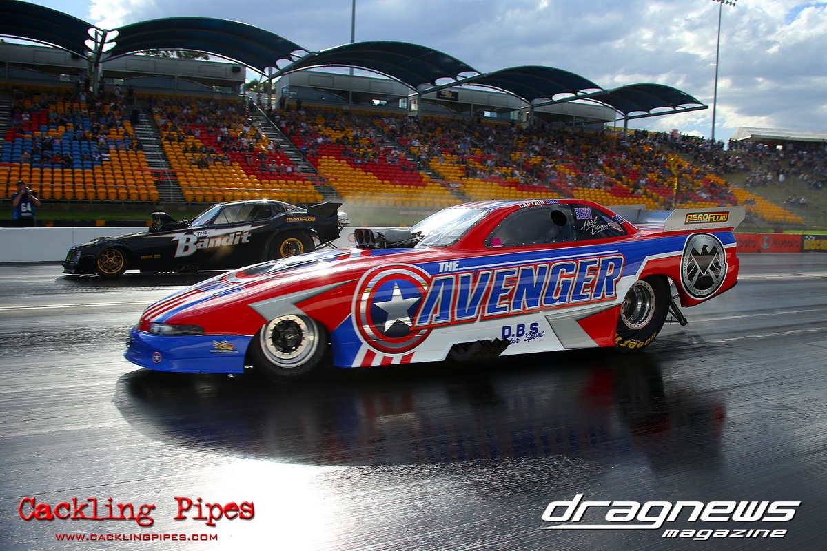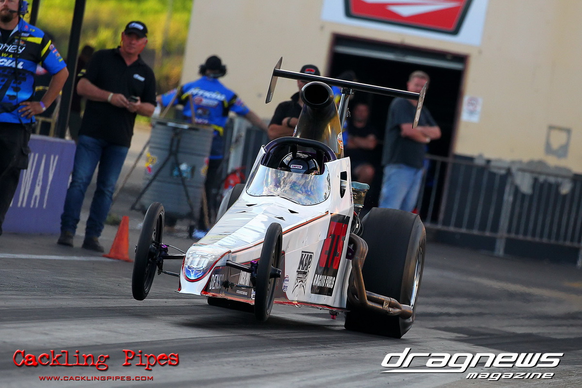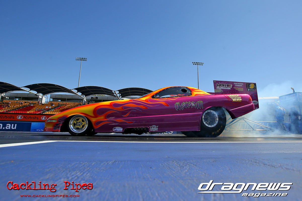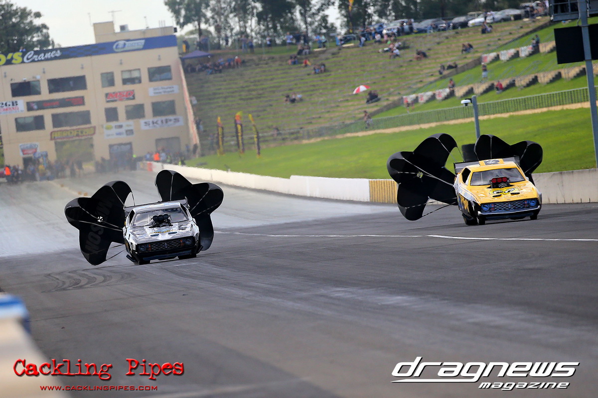 Dark Horse dropped a consistent 5.67 on Red Devil’s 5.73. Let’s Boogie decided it wanted to do a tyre smoke dance on the start line for Emma and she was easily “terminated” by Walshe with a 5.62. McMillin’s One Bad Kiwi took out the other Begley with LA Hooker’s 5.64 coming up short against the Kiwi’s 5.57. The Bandit won out in the Leahy family dual 5.58 to 5.67 against Storm Trooper and the round finished with an unlucky 5.54 from Avenger being trumped by a 5.51 from Nitro Express in one of the quickest side by side Aeroflow Outlaw Nitro Funny Car passes ever.