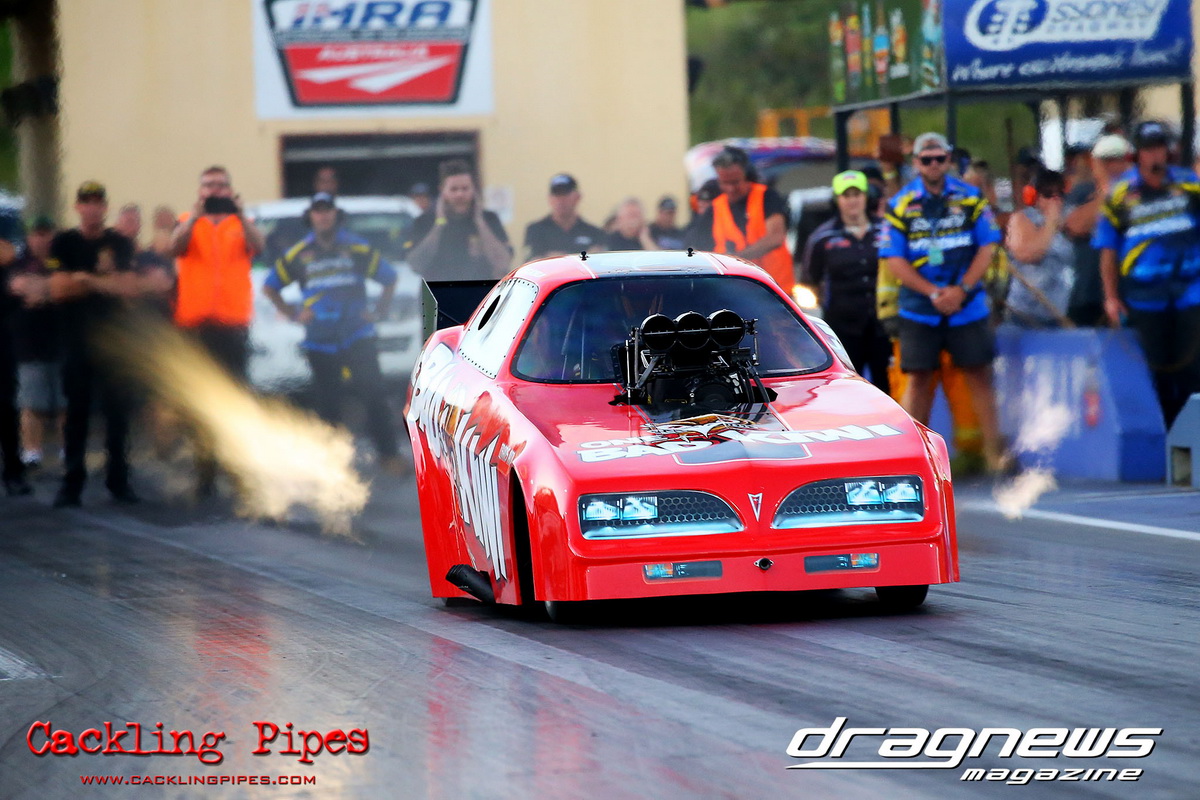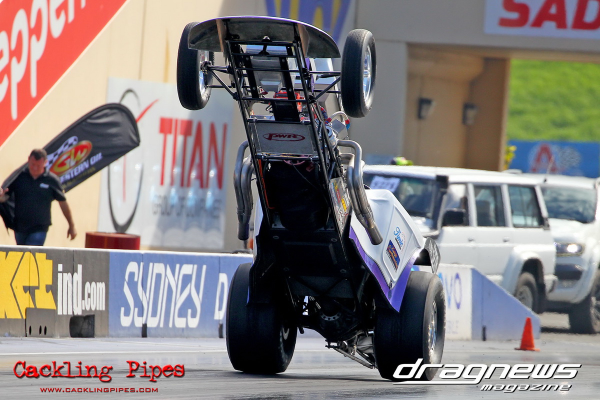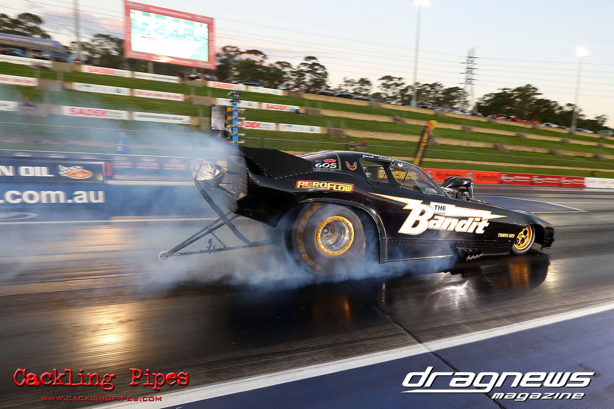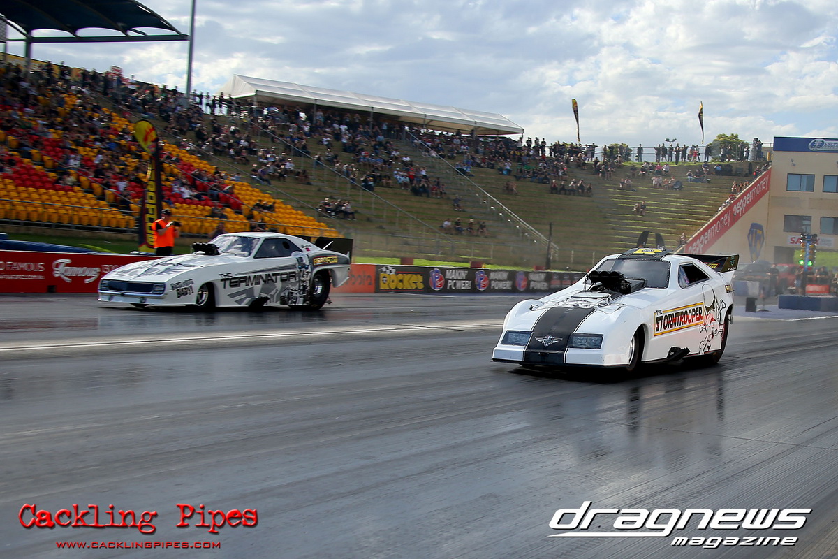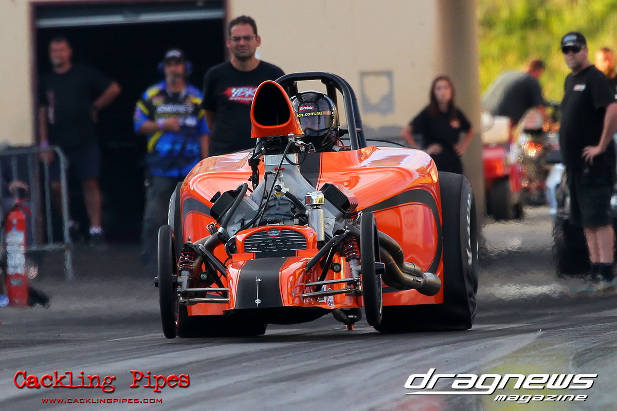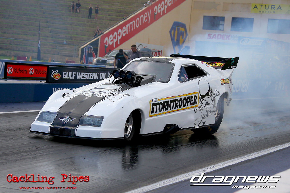 Dark Horse dropped a consistent 5.67 on Red Devil’s 5.73. Let’s Boogie decided it wanted to do a tyre smoke dance on the start line for Emma and she was easily “terminated” by Walshe with a 5.62. McMillin’s One Bad Kiwi took out the other Begley with LA Hooker’s 5.64 coming up short against the Kiwi’s 5.57. The Bandit won out in the Leahy family dual 5.58 to 5.67 against Storm Trooper and the round finished with an unlucky 5.54 from Avenger being trumped by a 5.51 from Nitro Express in one of the quickest side by side Aeroflow Outlaw Nitro Funny Car passes ever.