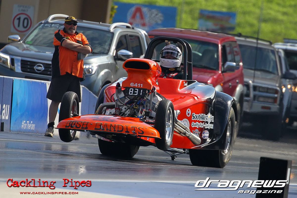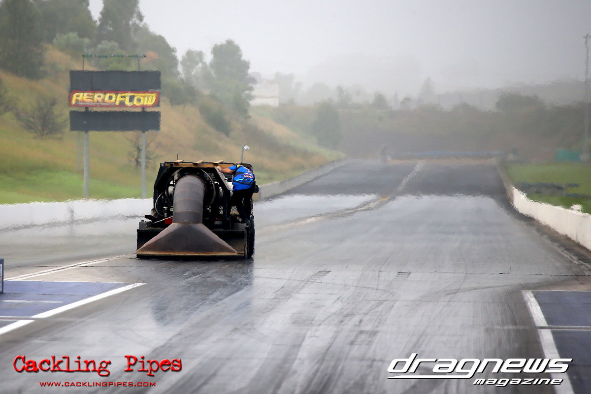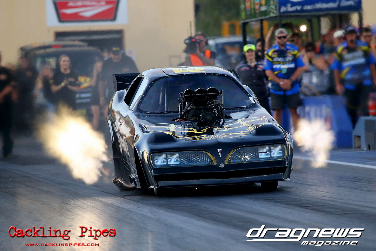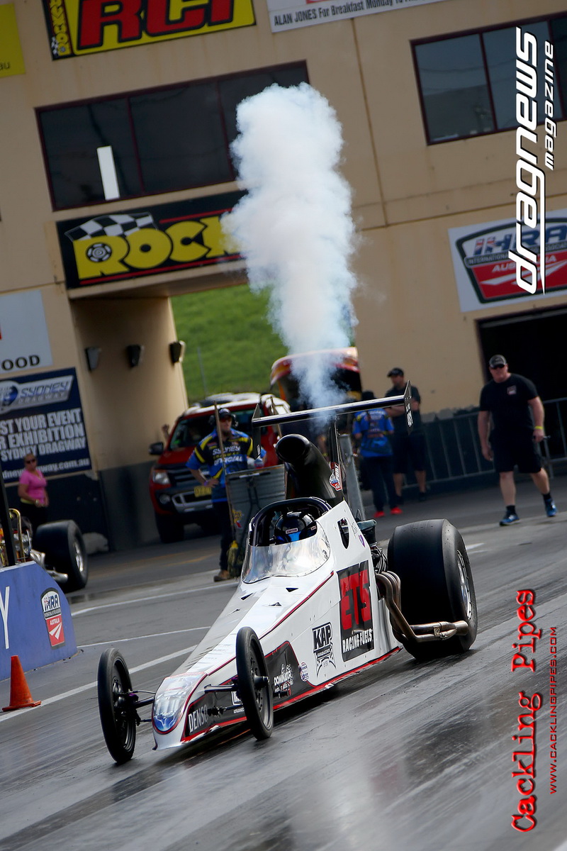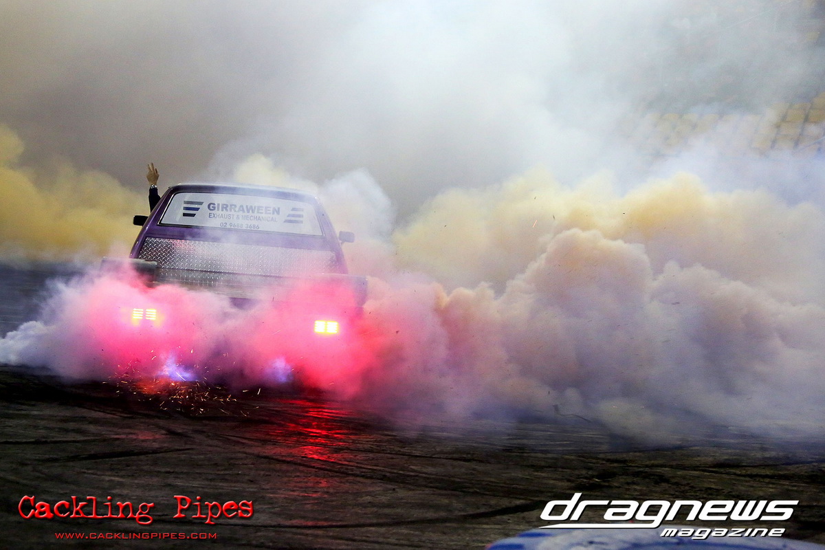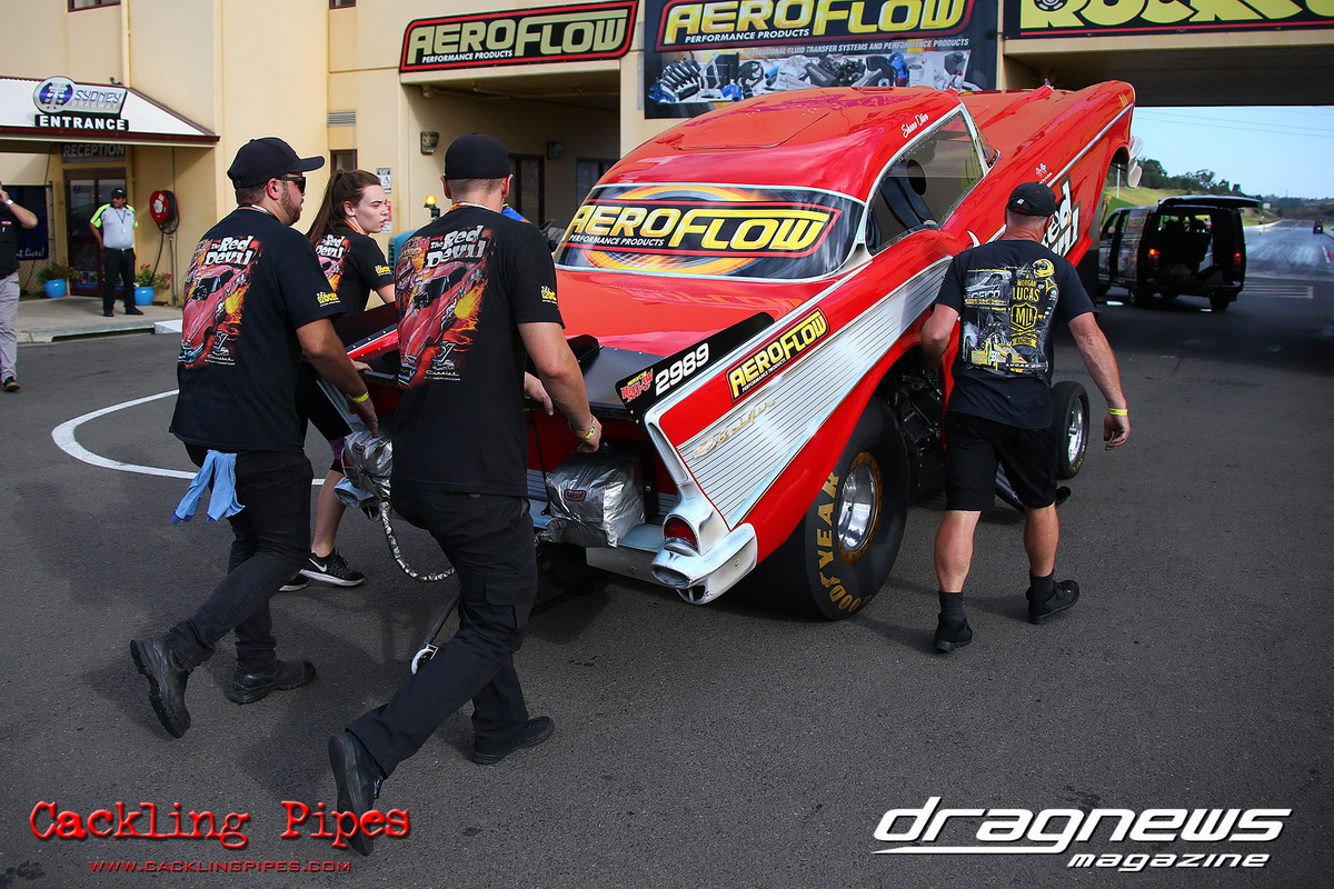 Dark Horse dropped a consistent 5.67 on Red Devil’s 5.73. Let’s Boogie decided it wanted to do a tyre smoke dance on the start line for Emma and she was easily “terminated” by Walshe with a 5.62. McMillin’s One Bad Kiwi took out the other Begley with LA Hooker’s 5.64 coming up short against the Kiwi’s 5.57. The Bandit won out in the Leahy family dual 5.58 to 5.67 against Storm Trooper and the round finished with an unlucky 5.54 from Avenger being trumped by a 5.51 from Nitro Express in one of the quickest side by side Aeroflow Outlaw Nitro Funny Car passes ever.