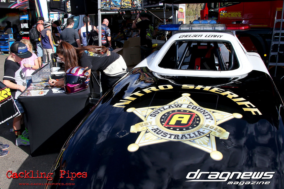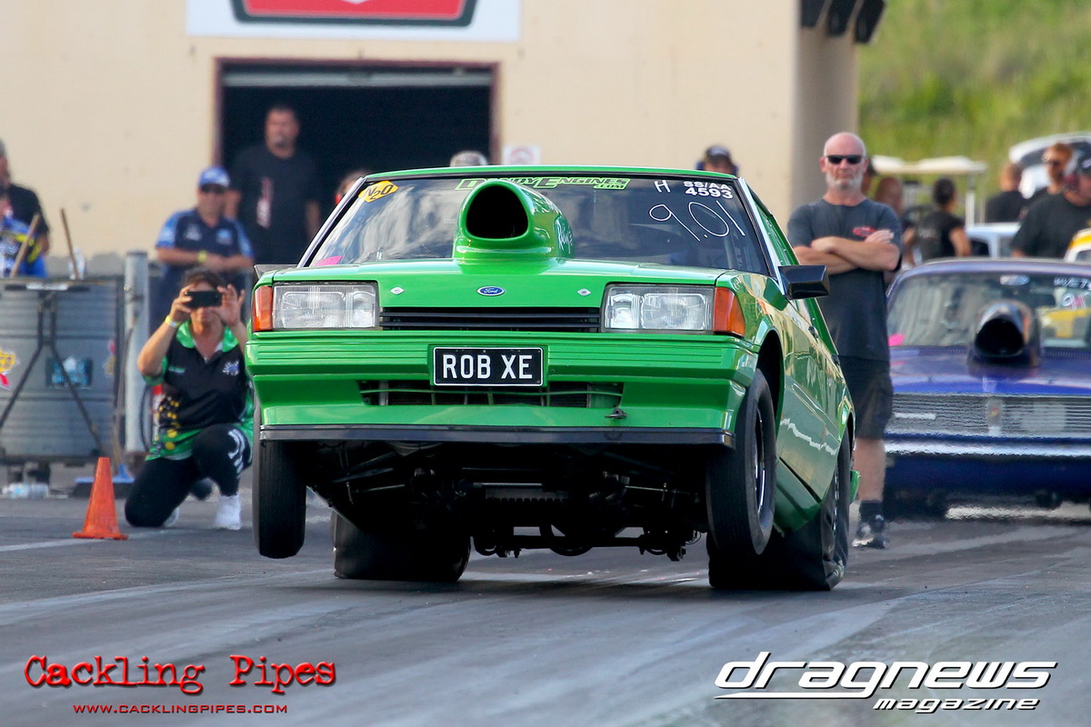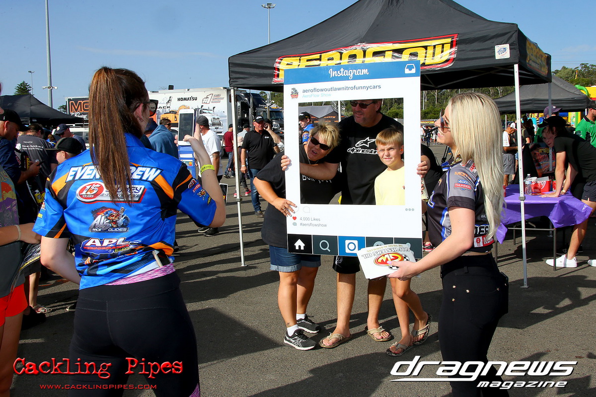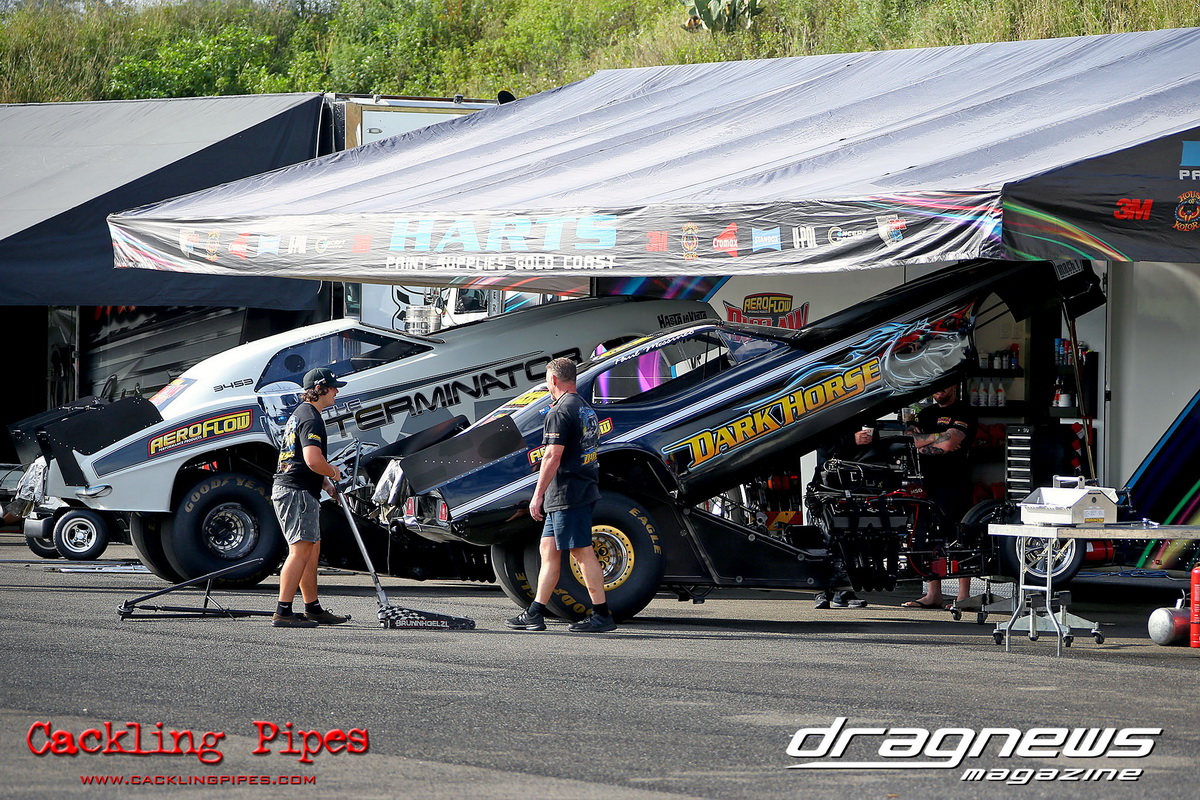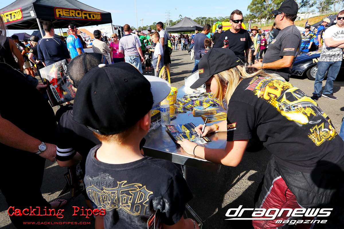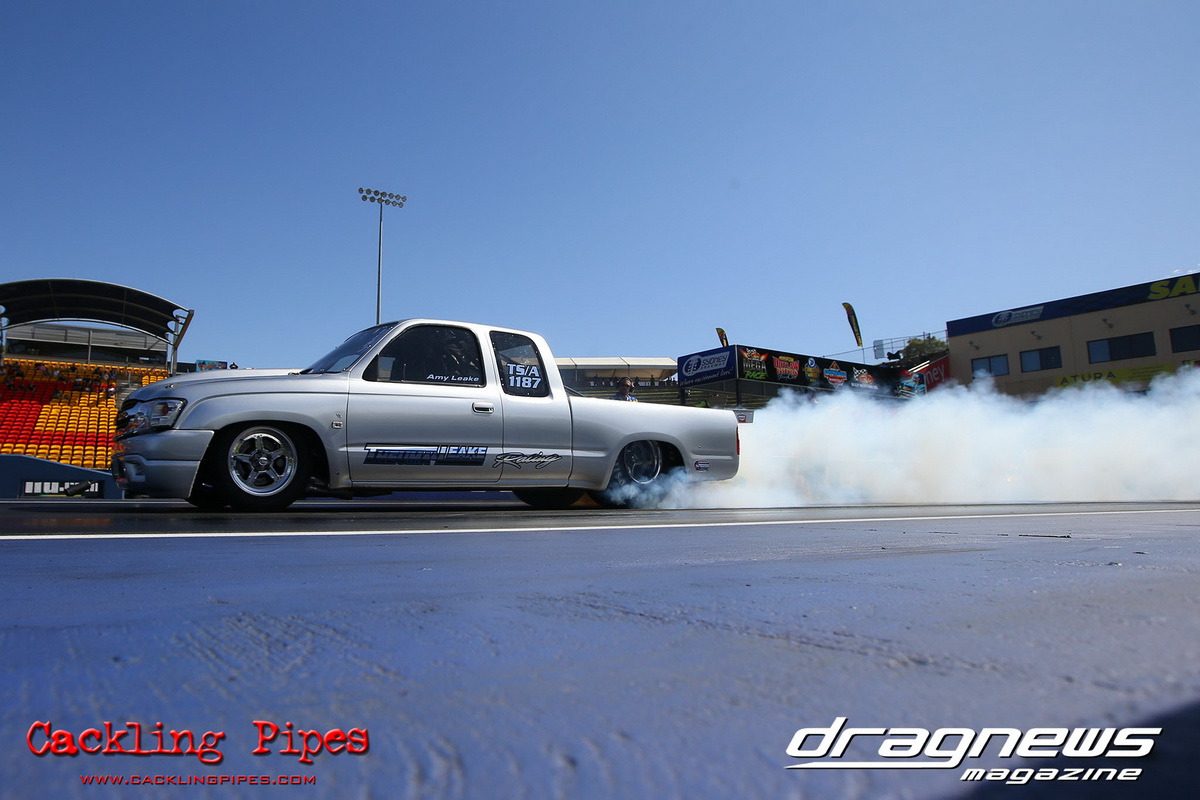 Dark Horse dropped a consistent 5.67 on Red Devil’s 5.73. Let’s Boogie decided it wanted to do a tyre smoke dance on the start line for Emma and she was easily “terminated” by Walshe with a 5.62. McMillin’s One Bad Kiwi took out the other Begley with LA Hooker’s 5.64 coming up short against the Kiwi’s 5.57. The Bandit won out in the Leahy family dual 5.58 to 5.67 against Storm Trooper and the round finished with an unlucky 5.54 from Avenger being trumped by a 5.51 from Nitro Express in one of the quickest side by side Aeroflow Outlaw Nitro Funny Car passes ever.