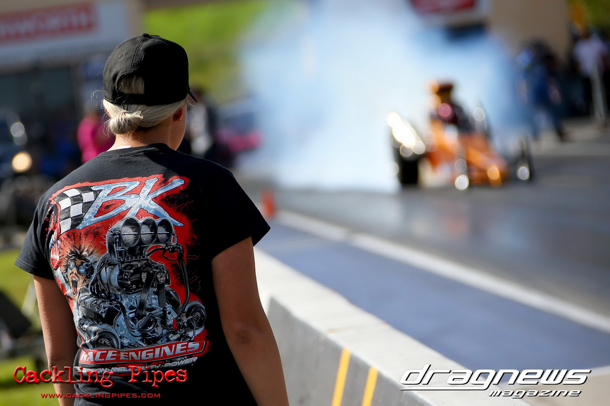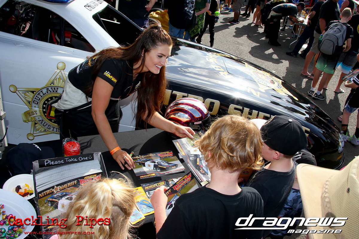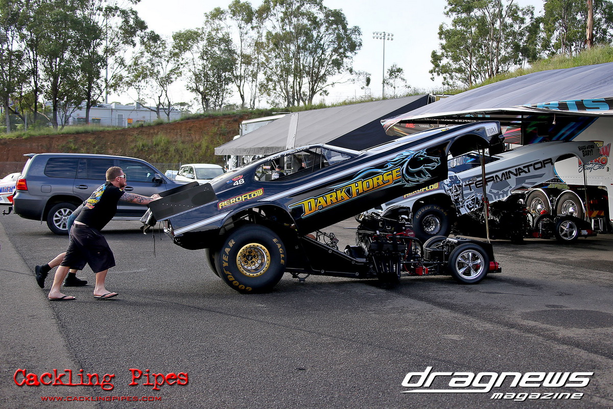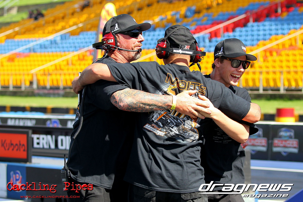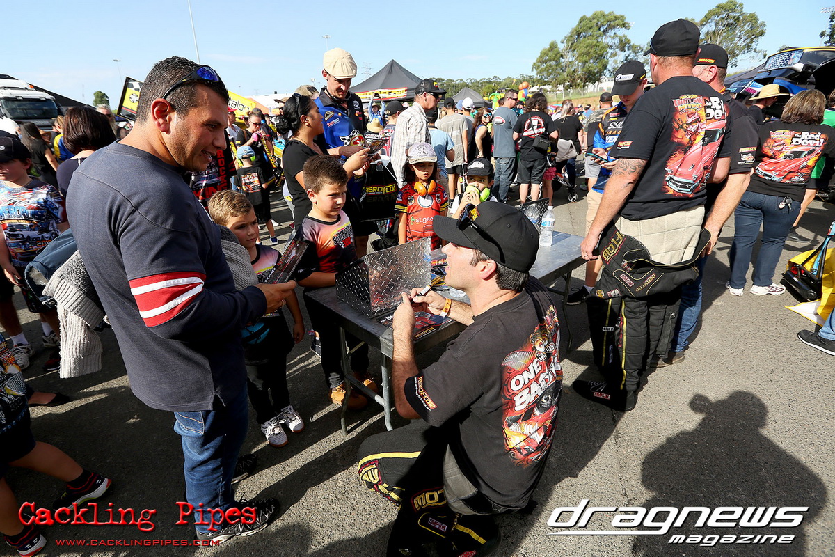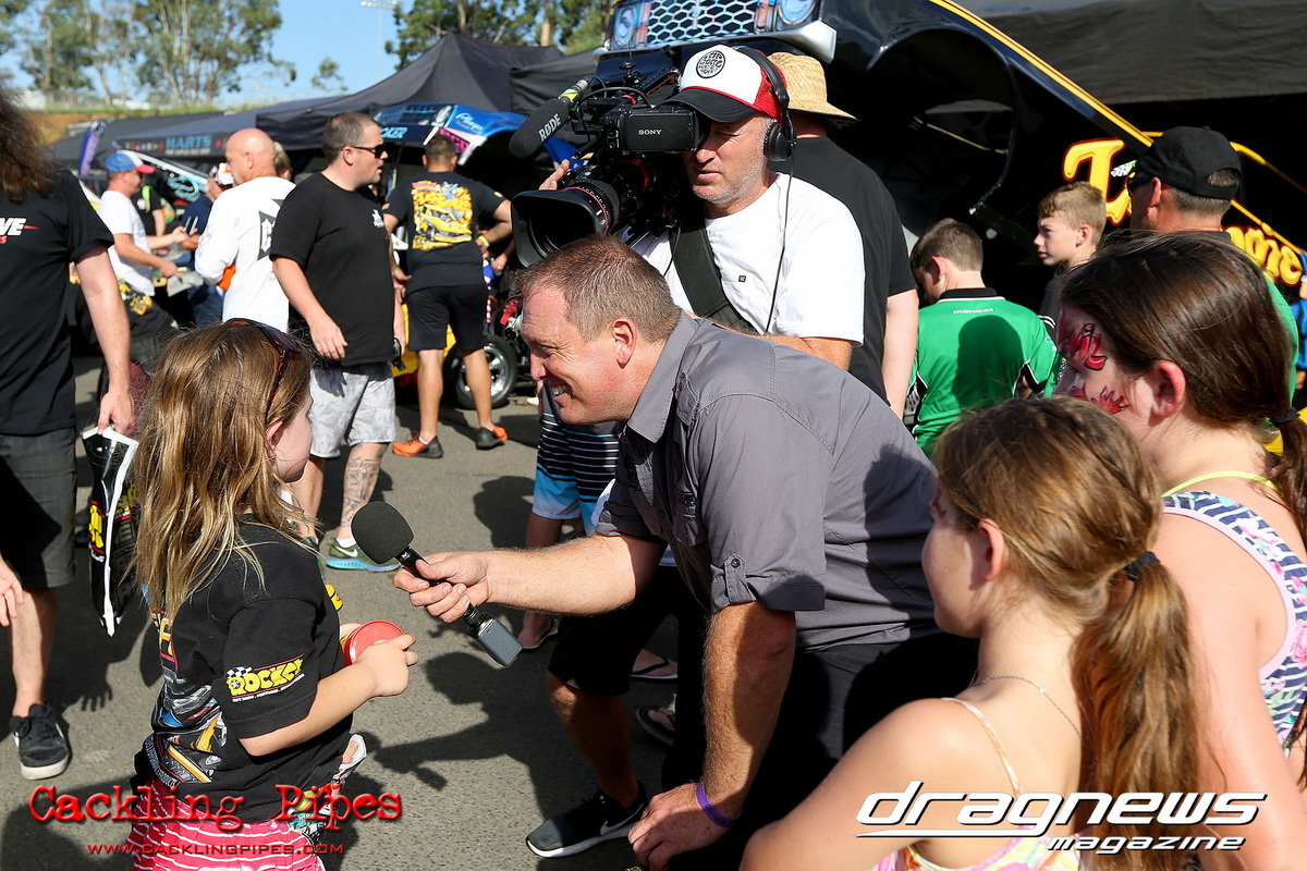 Dark Horse dropped a consistent 5.67 on Red Devil’s 5.73. Let’s Boogie decided it wanted to do a tyre smoke dance on the start line for Emma and she was easily “terminated” by Walshe with a 5.62. McMillin’s One Bad Kiwi took out the other Begley with LA Hooker’s 5.64 coming up short against the Kiwi’s 5.57. The Bandit won out in the Leahy family dual 5.58 to 5.67 against Storm Trooper and the round finished with an unlucky 5.54 from Avenger being trumped by a 5.51 from Nitro Express in one of the quickest side by side Aeroflow Outlaw Nitro Funny Car passes ever.