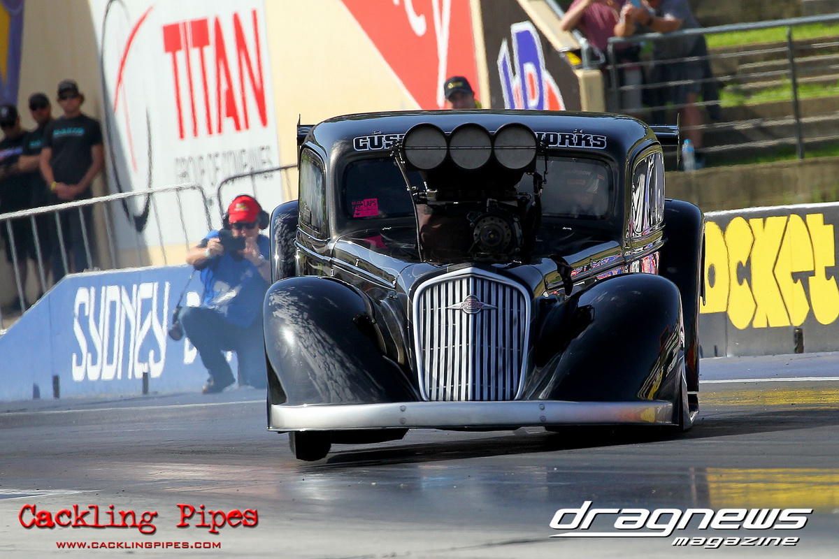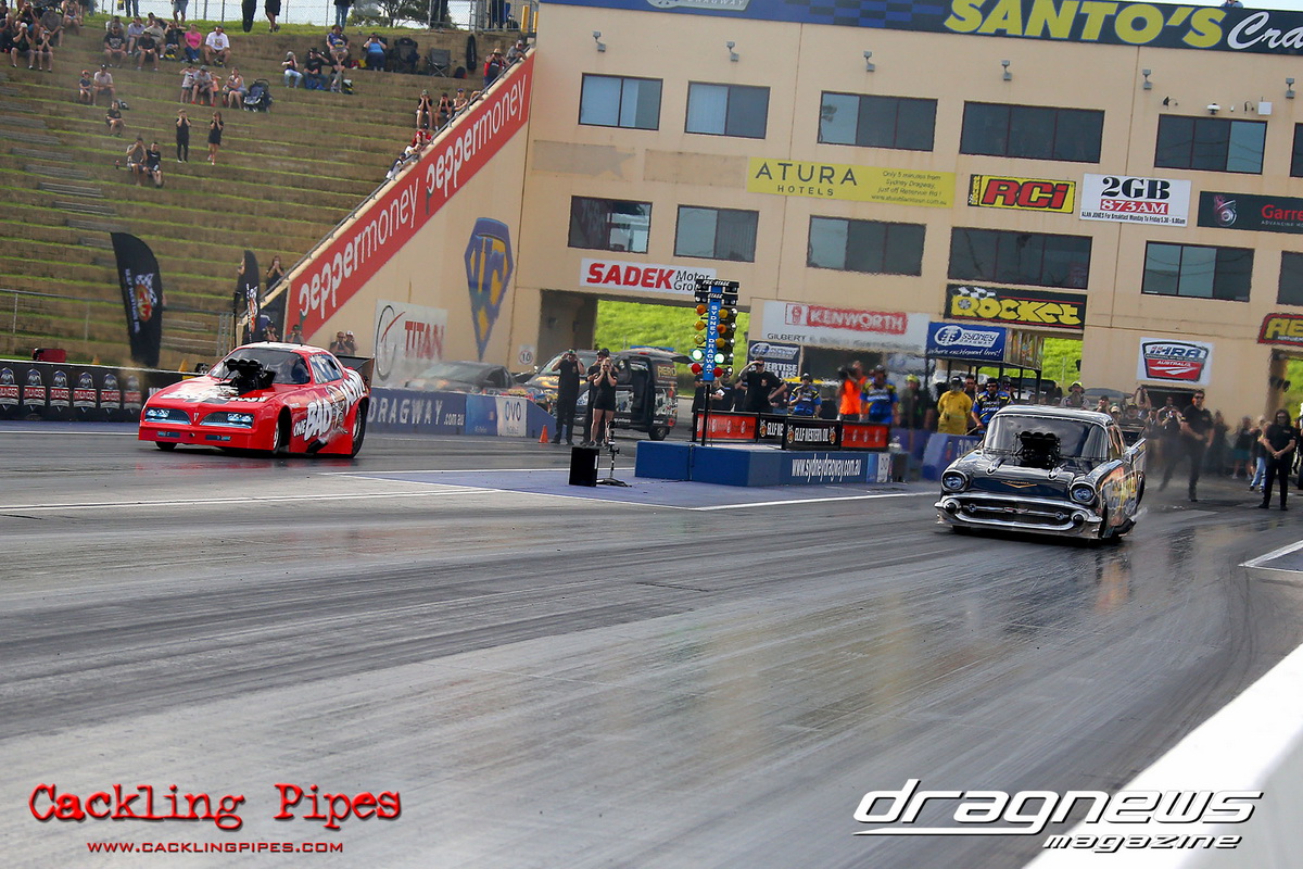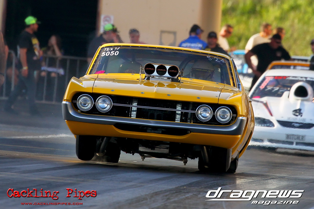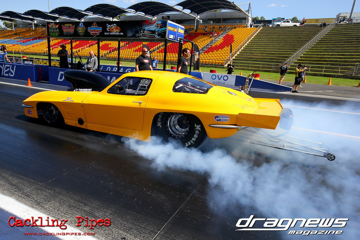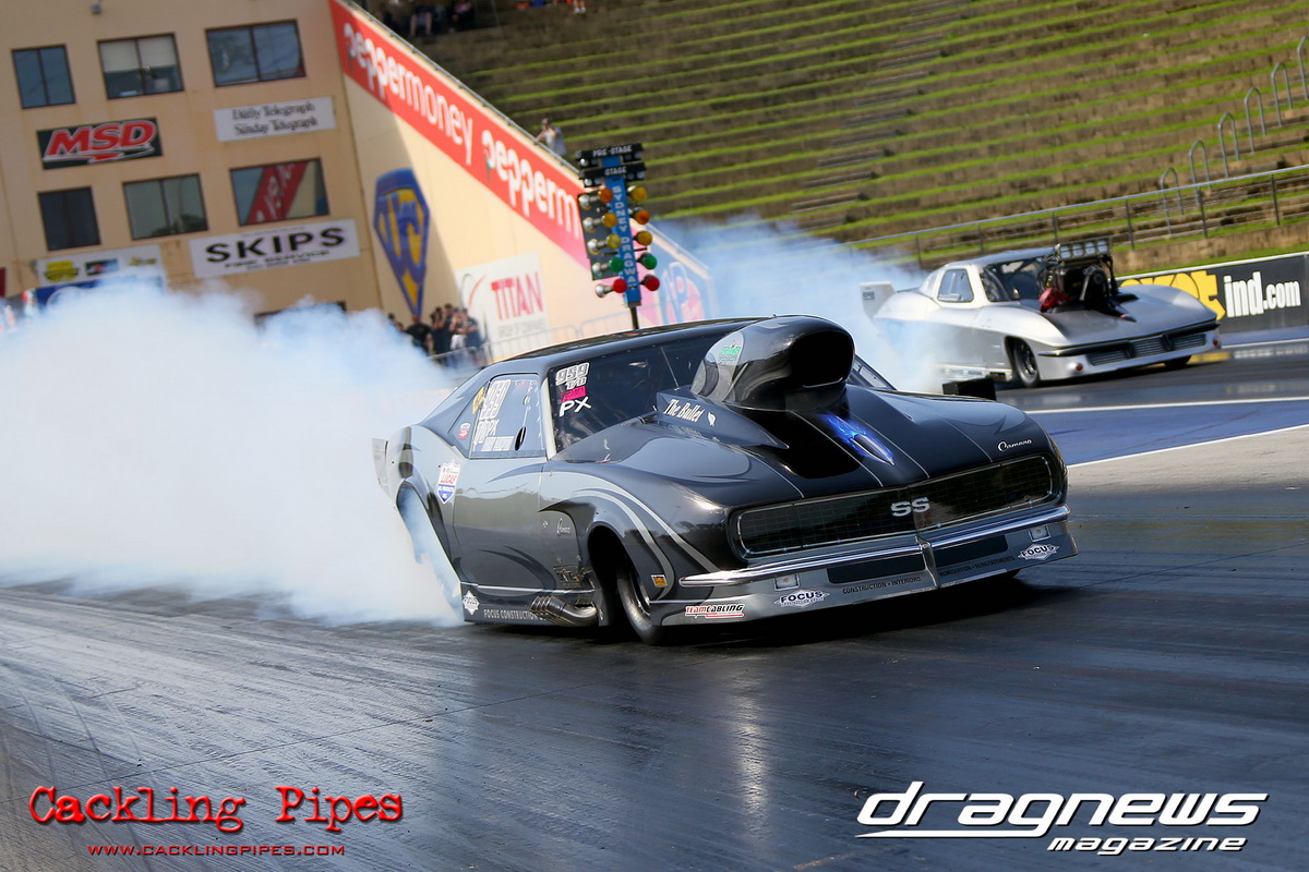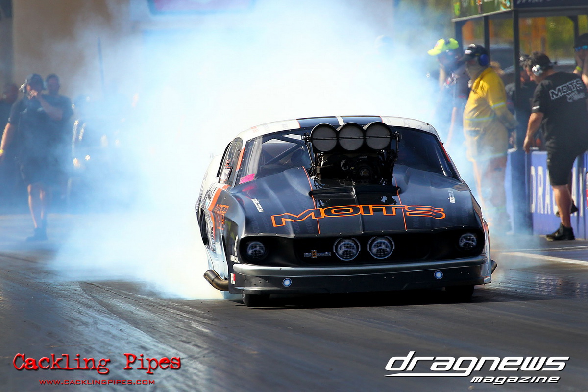Tyre shake dogged Plumpton, going down to Davies’ 5.95 in a classic Pro Mod match up. Tsakiridis again hit 271mph backed by a 5.75 ET to defeat Michael Haimandos’s twin turbo small block Mustang’s 6.47. George Rehayem notched a win against Joseph Murina’s blown Corvette with a 6.44. Spinozzi and Brett Gillespie in the revamped ’34 Chev had singles.